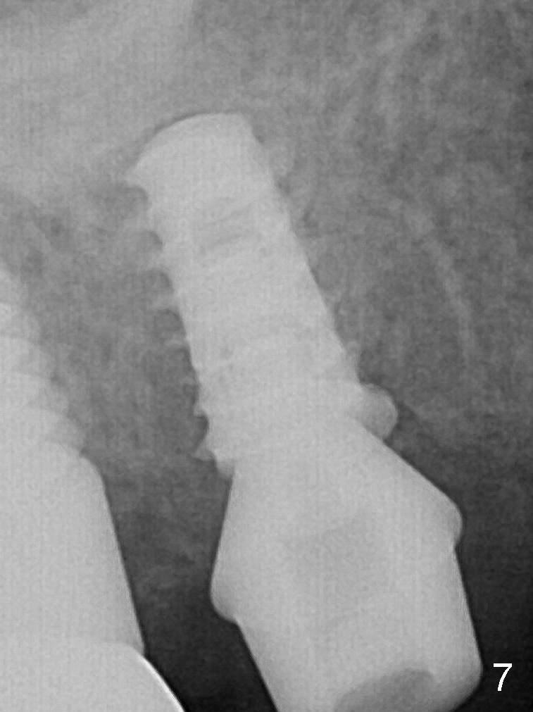 The patient returns with chief complaint of crown is loose with pain 2 months postop (Fig.7). Under local anesthesia, the provisional is removed. The gingiva is erythematous. The implant has mobility. A healing abutment is placed (6x2 mm). Probably a large implant should have been placed.