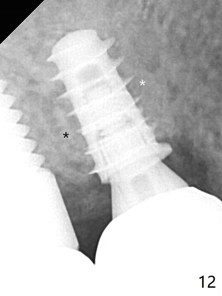 The abutment screw is loose 2.5 months post cementation, but the bone density in the previous mesiobuccal and distobuccal sockets (Fig.12 *) increases.