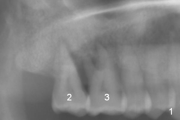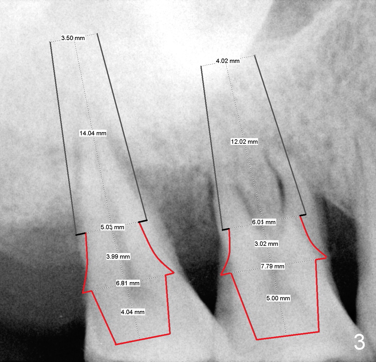 A 52-year-old lady is pleased with the implant at #15 and requests implants at #2 and 3 next (Fig.1,2). Due to severe bone resorption, bone level should be uneven circumferentially. The implants will be placed as apical as possible, i.e., buried in the native bone. If implant threads are exposed in small region, they will be covered by allograft (Fig.3 pink circles). The size of the abutments is shown in red. Clindamycin will be used for socket disinfection.