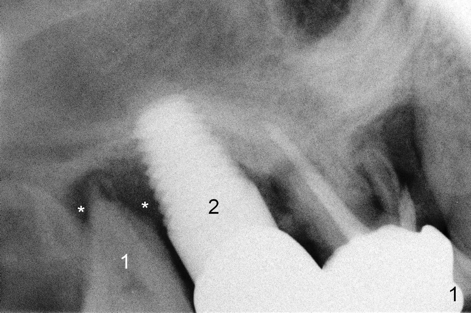 A 62-year-old man (CJ) had food impaction between the tooth #1 and the implant at #2 six months post cementation of the crown at #2. At the most recent visit (1.5 years post cementation), symptoms and signs of infection around the tooth #1 appear to get worse (Fig.1 *). The patient accepted treatment plan (#1 extraction and immediate implant, Fig.2).