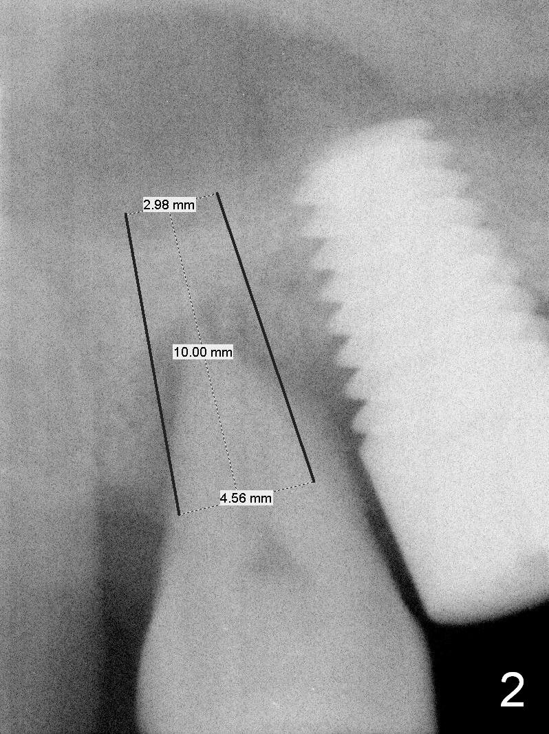 After extraction, the socket is curetted thoroughly, the implant threads cleaned with Titanium brush, and the wound treated with Metronidazole. It appears that a 4.5x10 mm bone-level implant is appropriate for the site (Fig.2).
