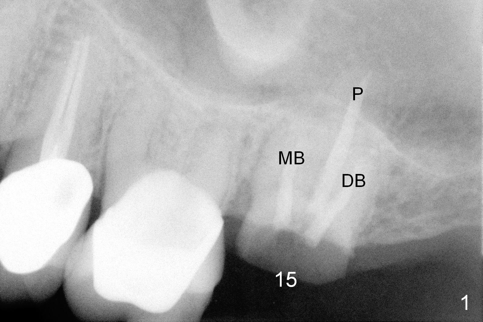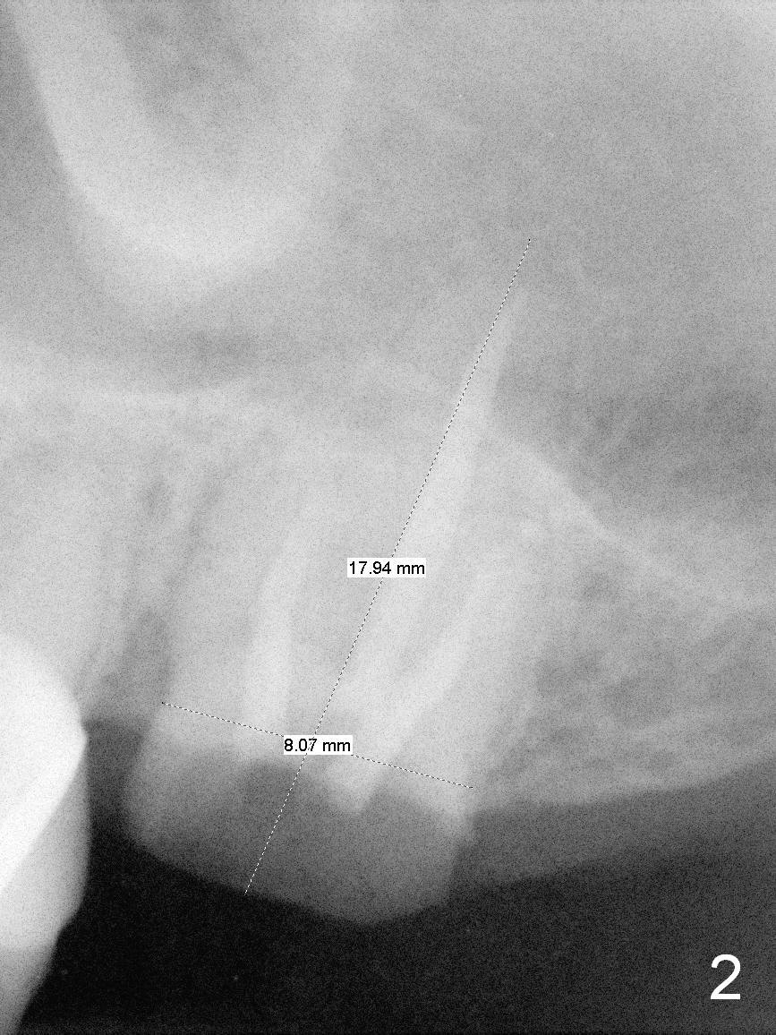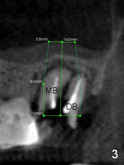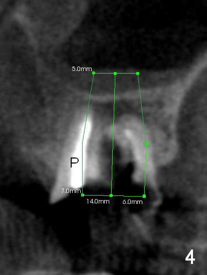 The tooth #15 of a 62-year-old man (CY) has been fractured for 4 years (Fig.1). The 3 roots (MB, DB and P) appear to be approximated each other (Fig.1,3,4) so that when the tooth is extracted (using a surgical handpiece for sectioning), the socket should be single and large. Treat the socket with Clindamycin. If the socket proves to be flat on the top, the thickness of the sinus floor is approximately 2 mm. If the bone is not so tough, use osteotomes to do sinus lift; otherwise use drills. The depth of osteotomy should be tightly monitored.