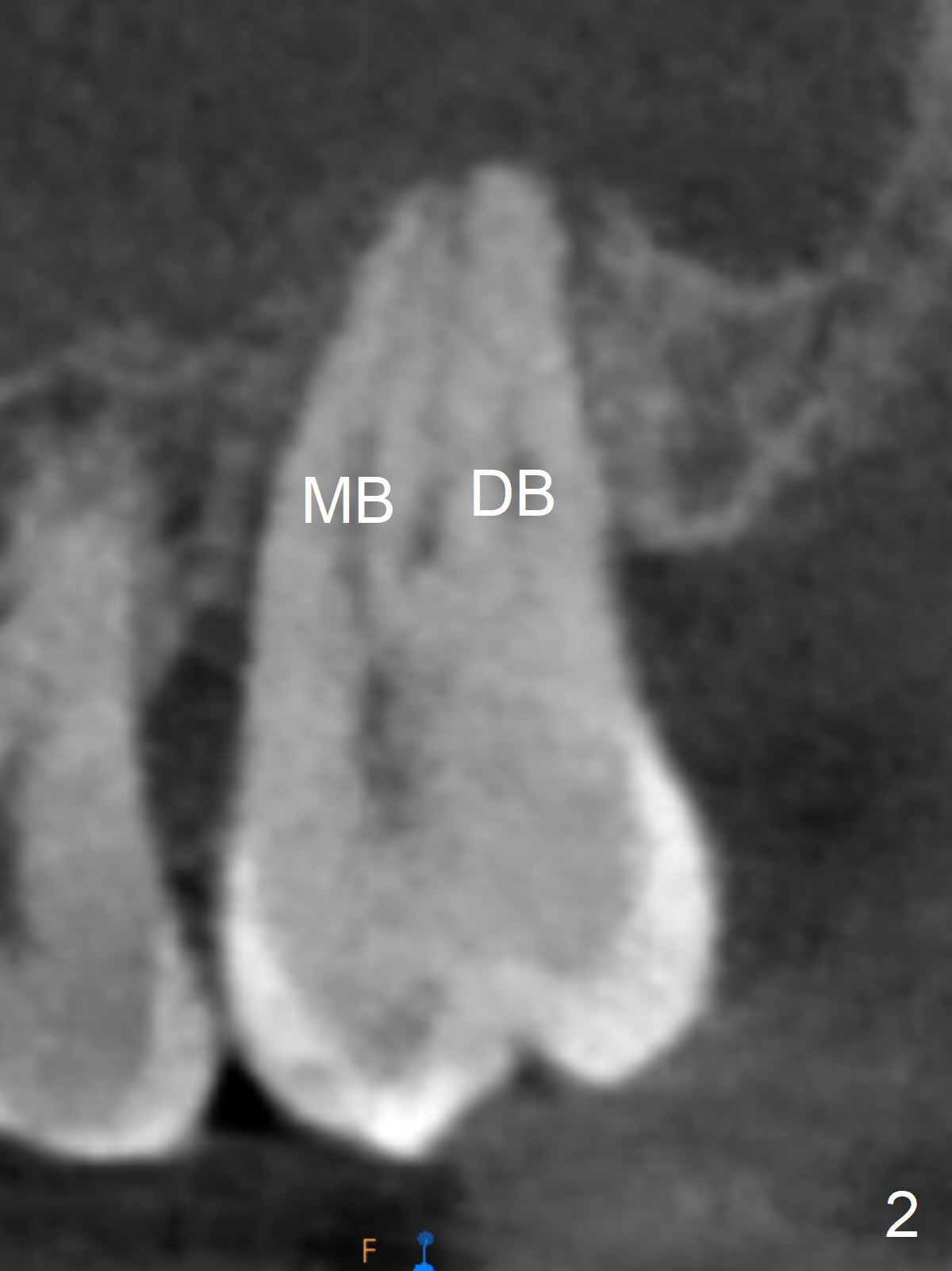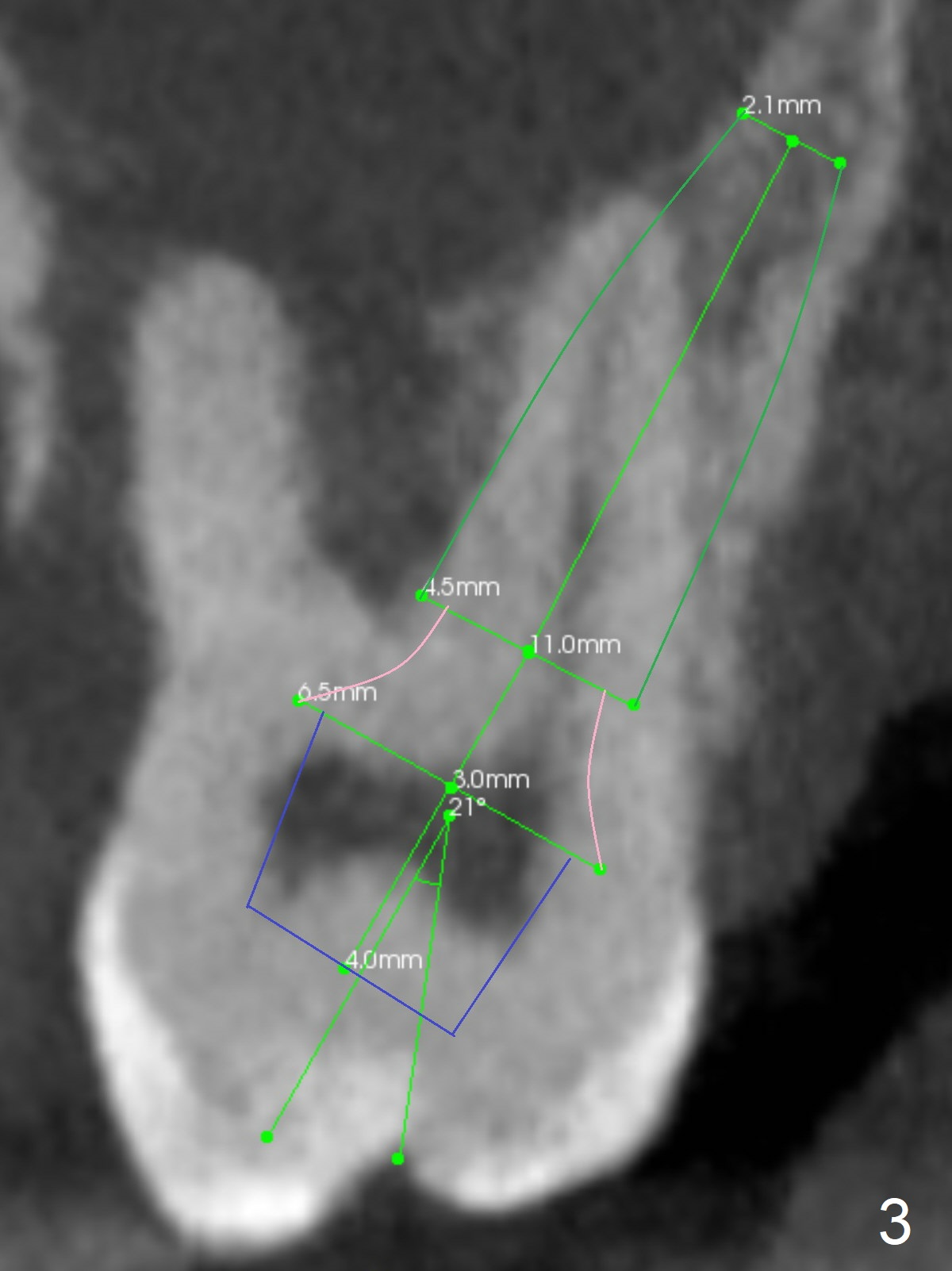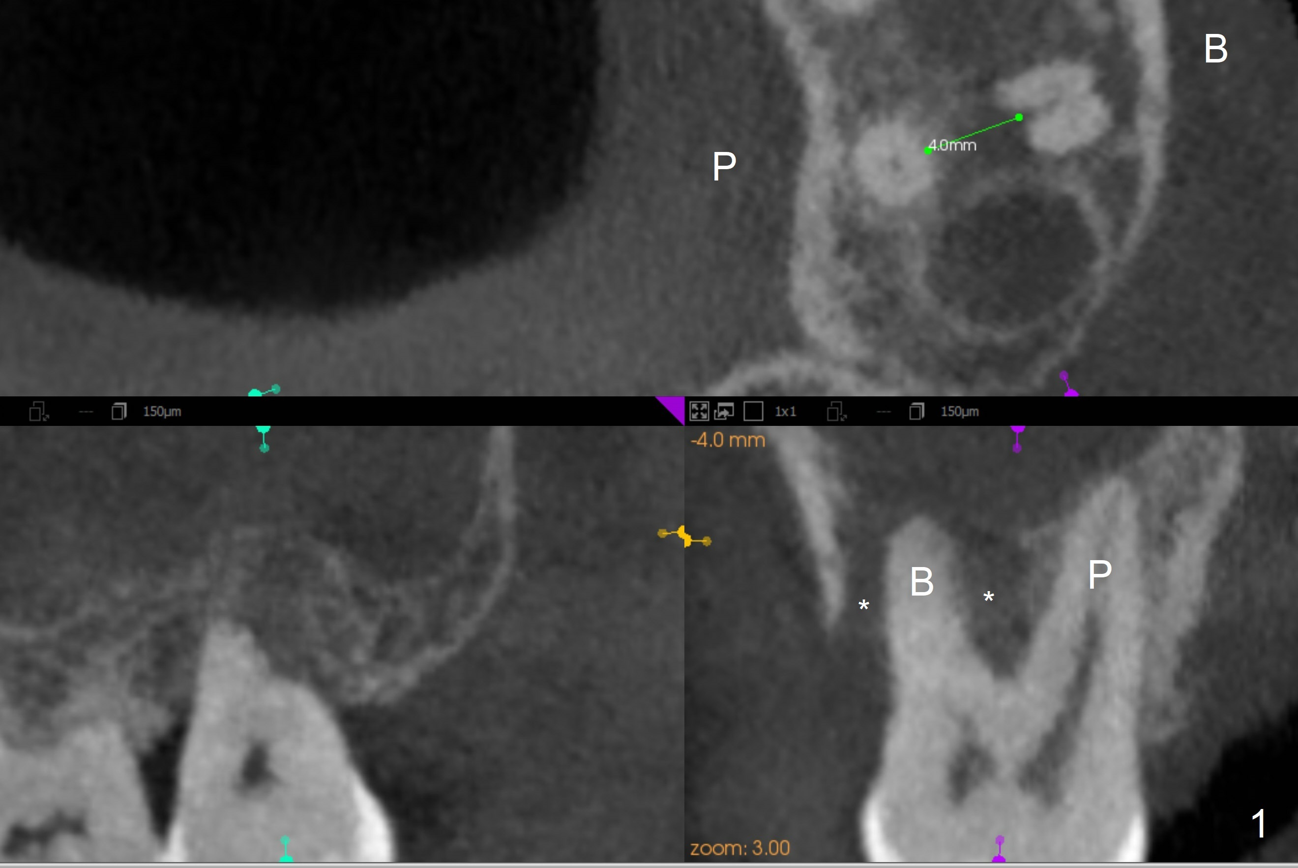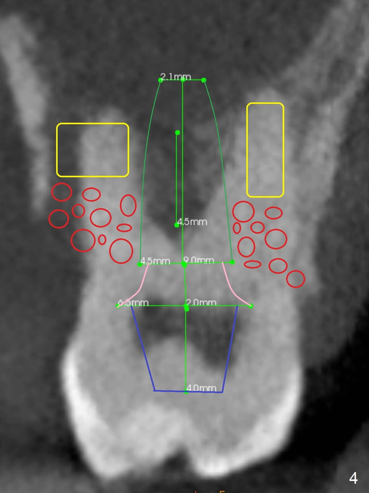 A 40-year-old man develops an abscess around the buccal roots of the tooth #15 several years after extraction of the symptomatic tooth #16. The pattern of infection is similar to that between #17 and 18. There is severe bone loss (Fig.1 *) around the fused buccal roots (Fig.2). It appears that an immediate implant (green) placed in the septum (Fig.4) has better position and angulation for restoration than the one placed in the palatal socket (Fig.3). Pink: cuff of abutment (blue); yellow: Osteogen Plug; red: bone graft.