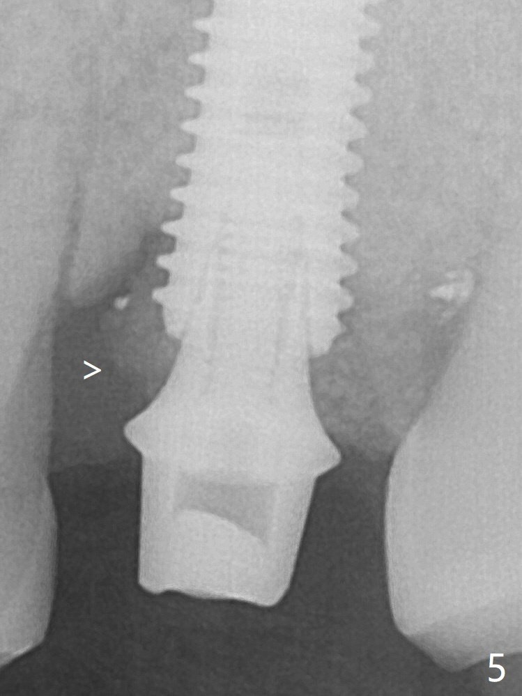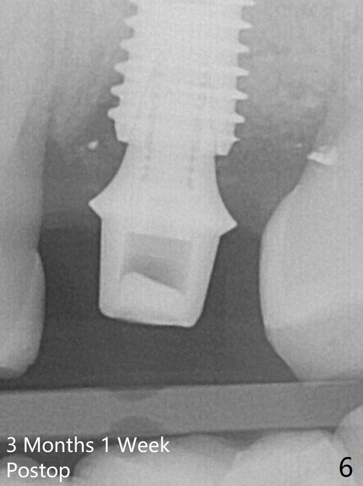 Further pushing of the bone graft from the buccal and palatal socket gaps results in more ideal packing (Fig.5 >). If the bone graft were placed first, packing would have been easier. An immediate provisional is fabricated to prevent further mesial shifting of the 3rd molar (Fig.1 arrow). The implant remains stable, while the provisional and abutment are loose 3 months 1 week postop (Fig.6). Impression is taken after abutment cleaning and retightening.