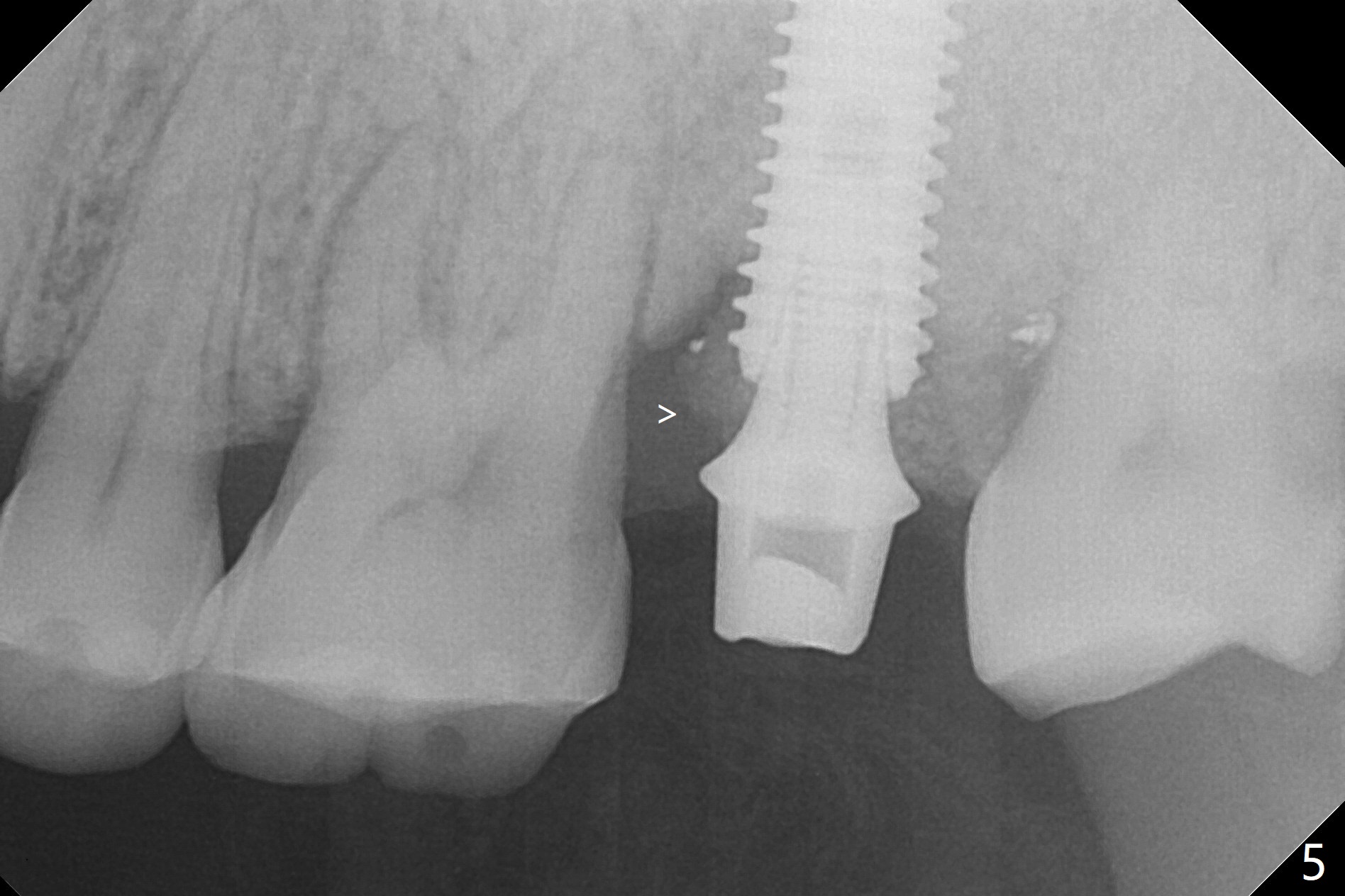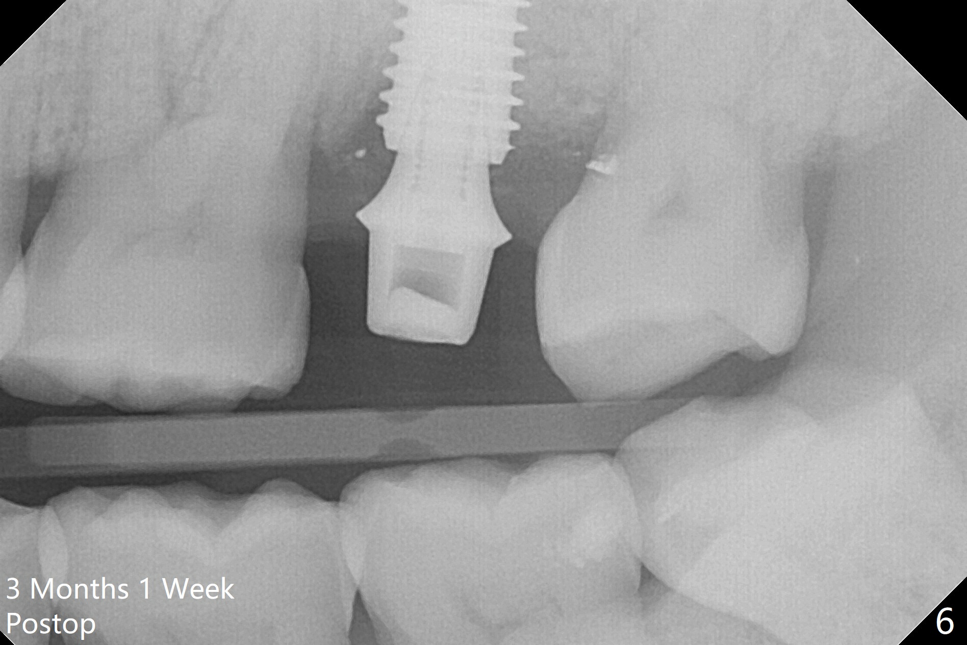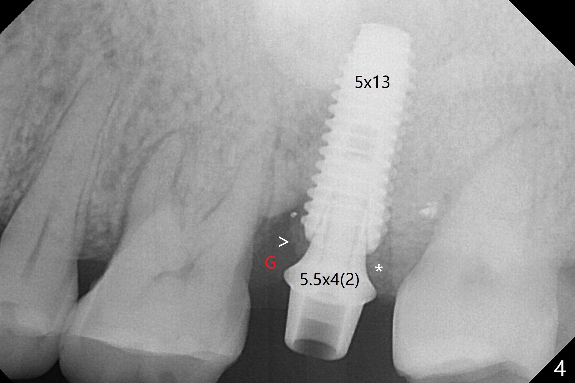 When the patient returns for the tooth #15 extraction and implant, the mesiobuccal residual root has been expelled, while the distobuccal and palatal roots seem to have extruded (Fig.1). The mesial portion of the gingiva (G) is intact and thick. The trajectory of the initial osteotomy is to be changed as shown by red line in Fig.2. The 3.8 mm drill appears to be distal (Fig.3). With mesial bone removal with Lindamann bur, the position of the final implant (5x13 mm) is within normal limit (Fig.4 (50 Ncm)). Because of the thick mesial gingiva (Fig.4 G) and placement of the 5.5x4(2) mm abutment, insertion of mixture of autogenous and Vanilla Graft (*) into the mesial aspect of the implant is difficult (Fig.4 >). Further pushing of the bone graft from the buccal and palatal socket gaps results in more ideal packing (Fig.5 >). If the bone graft were placed first, packing would have been easier. An immediate provisional is fabricated to prevent further mesial shifting of the 3rd molar (Fig.1 arrow). The implant remains stable, while the provisional and abutment are loose 3 months 1 week postop (Fig.6). Impression is taken after abutment cleaning and retightening. Because of the long implant (13 mm), a permanent crown can be cemented early (3 months 20 days postop, Fig.7).