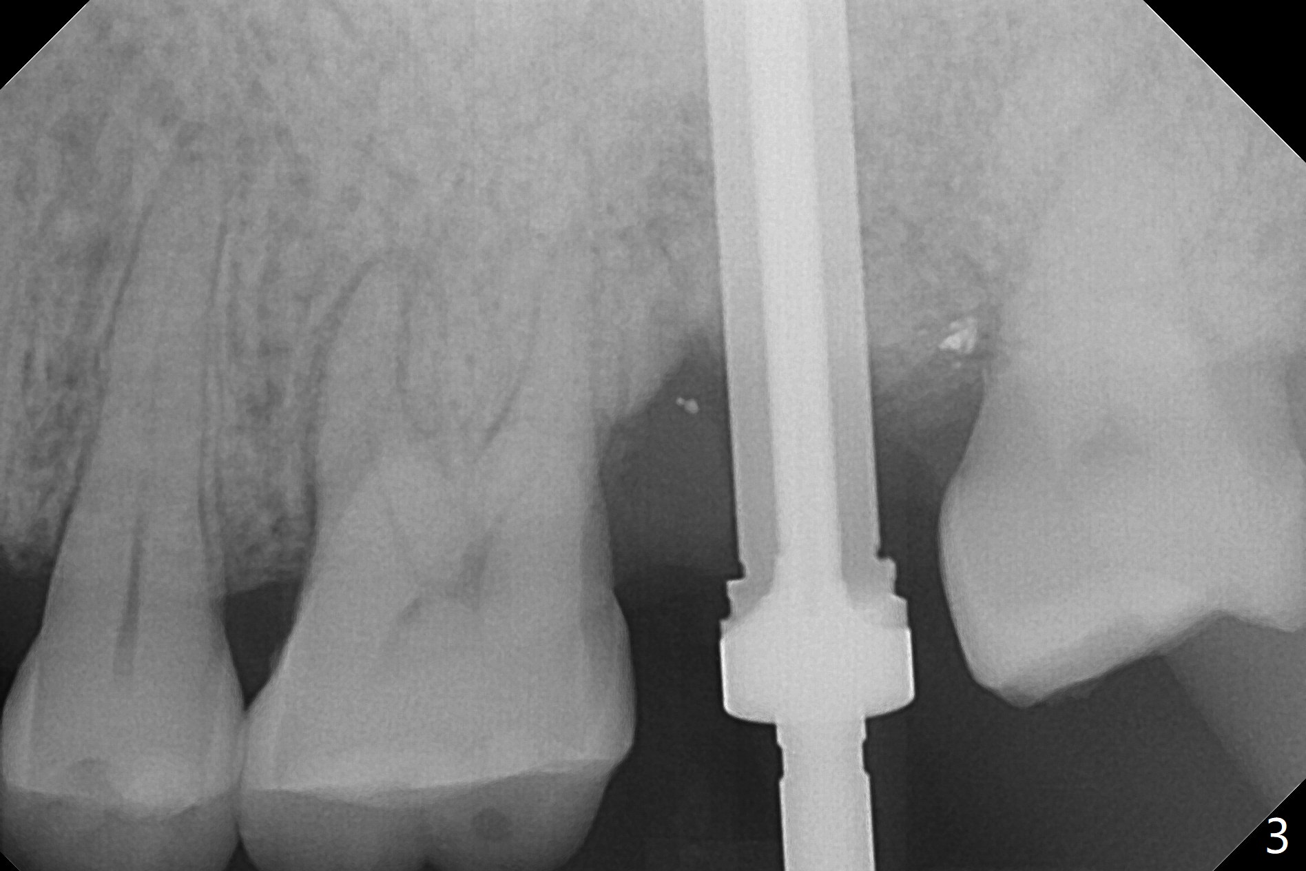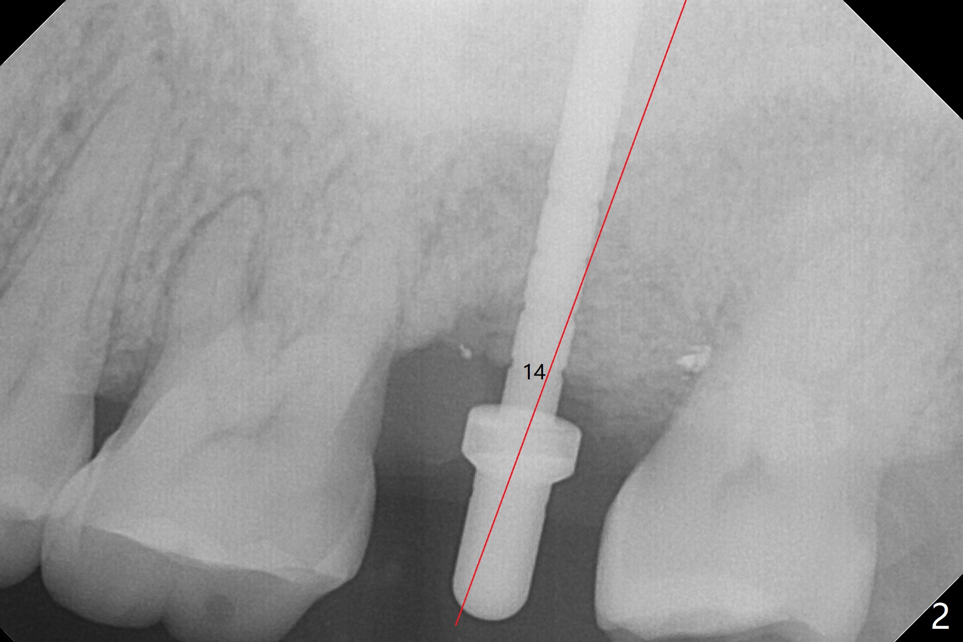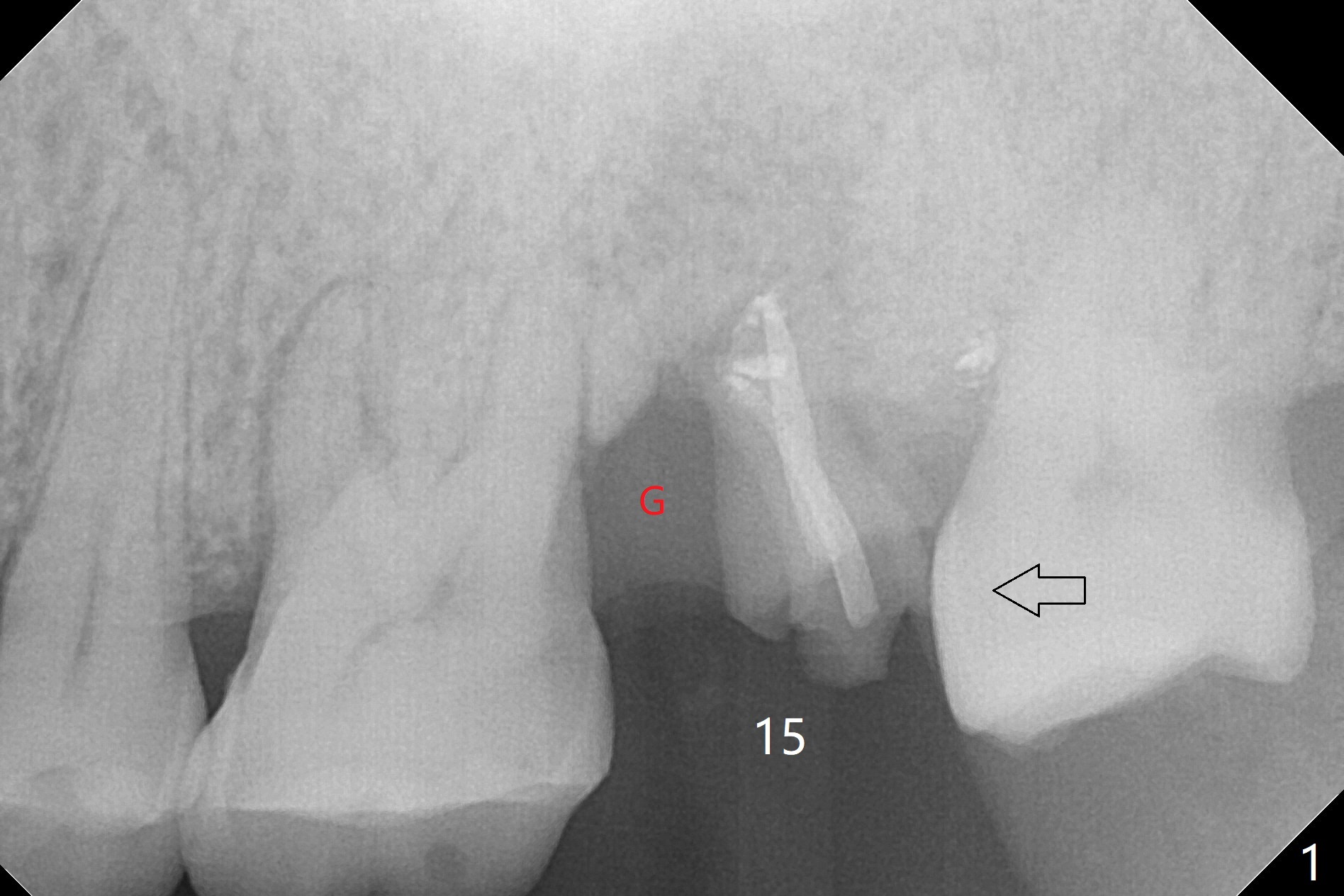 When the patient returns for the tooth #15 extraction and implant, the mesiobuccal residual root has been expelled, while the distobuccal and palatal roots seem to have extruded (Fig.1). The mesial portion of the gingiva (G) is intact and thick. The trajectory of the initial osteotomy is to be changed as shown by red line in Fig.2. The 3.8 mm drill appears to be distal (Fig.3). With mesial bone removal with Lindamann bur, the position of the final implant (5x13 mm) is within normal limit (Fig.4 (50 Ncm)). Because of the thick mesial gingiva (Fig.4 G) and placement of the 5.5x4(2) mm abutment, insertion of mixture of autogenous and Vanilla Graft (*) into the mesial aspect of the implant is difficult (Fig.4 >). Further pushing of the bone graft from the buccal and palatal socket gaps results in more ideal packing (Fig.5 >). If the bone graft were placed first, packing would have been easier. An immediate provisional is fabricated to prevent further mesial shifting of the 3rd molar (Fig.1 arrow). The implant remains stable, while the provisional and abutment are loose 3 months 1 week postop (Fig.6). Impression is taken after abutment cleaning and retightening. Because of the long implant (13 mm), a permanent crown can be cemented early (3 months 20 days postop, Fig.7).