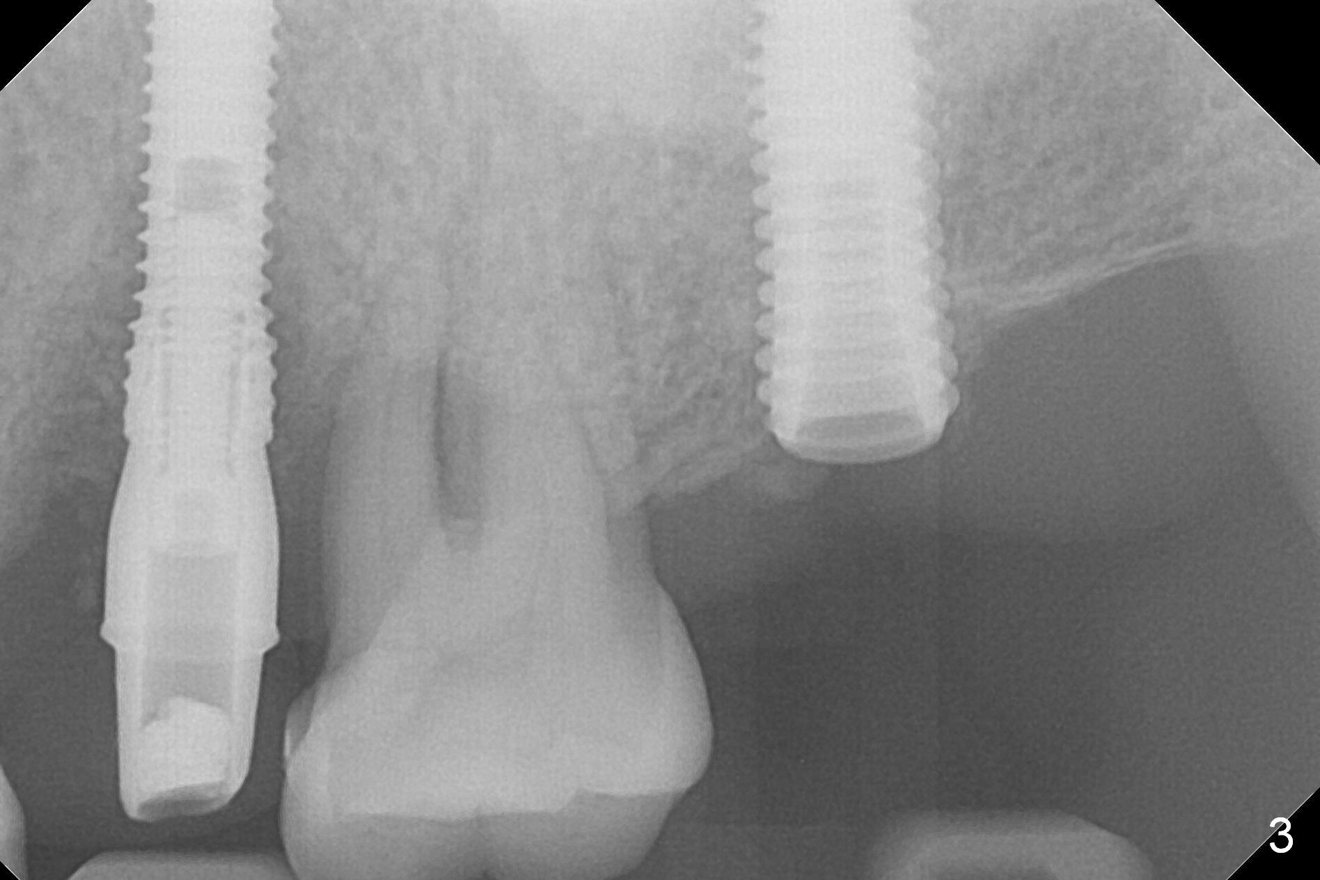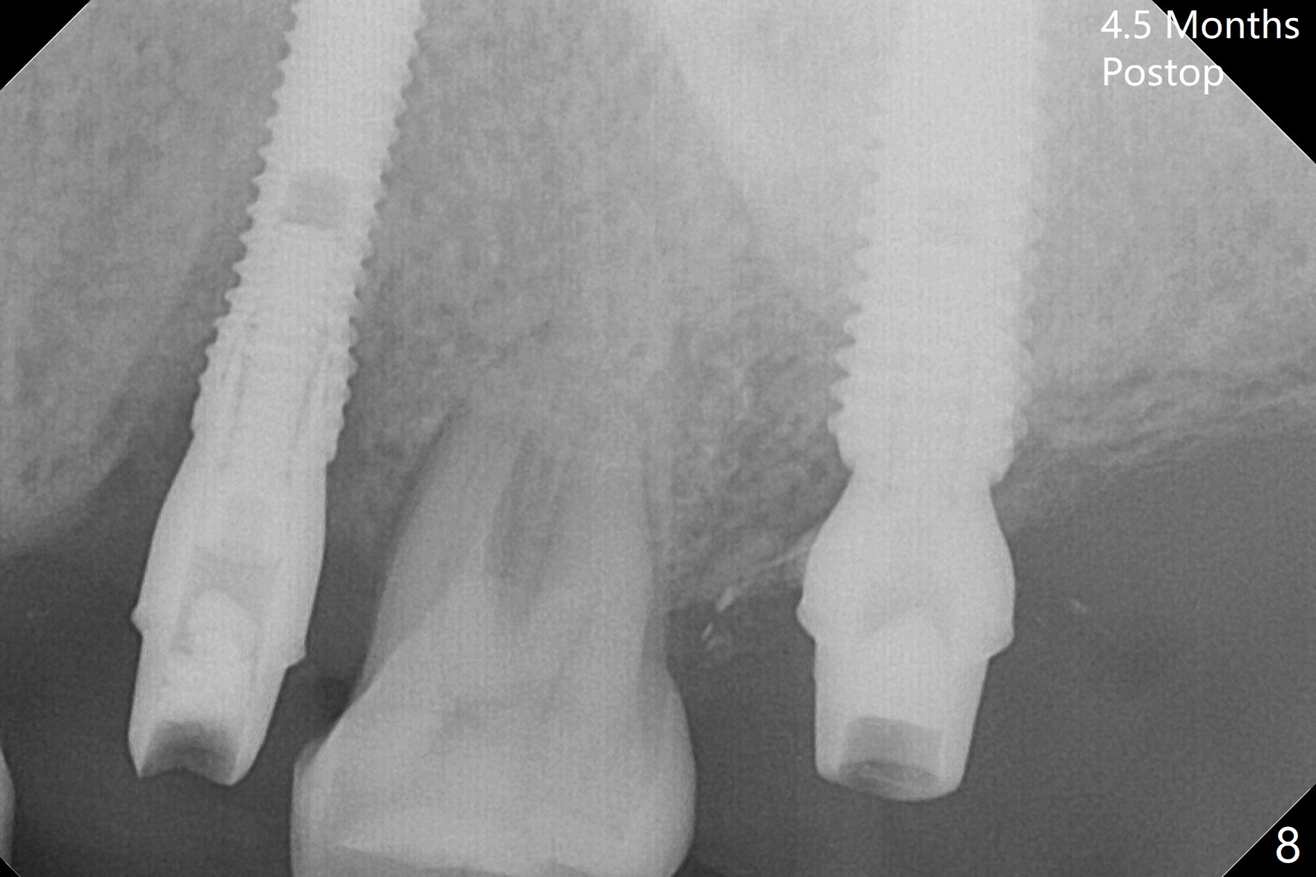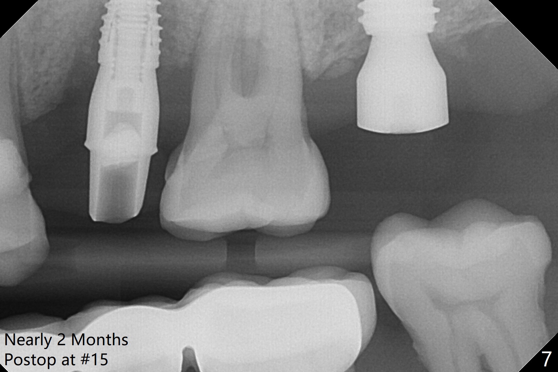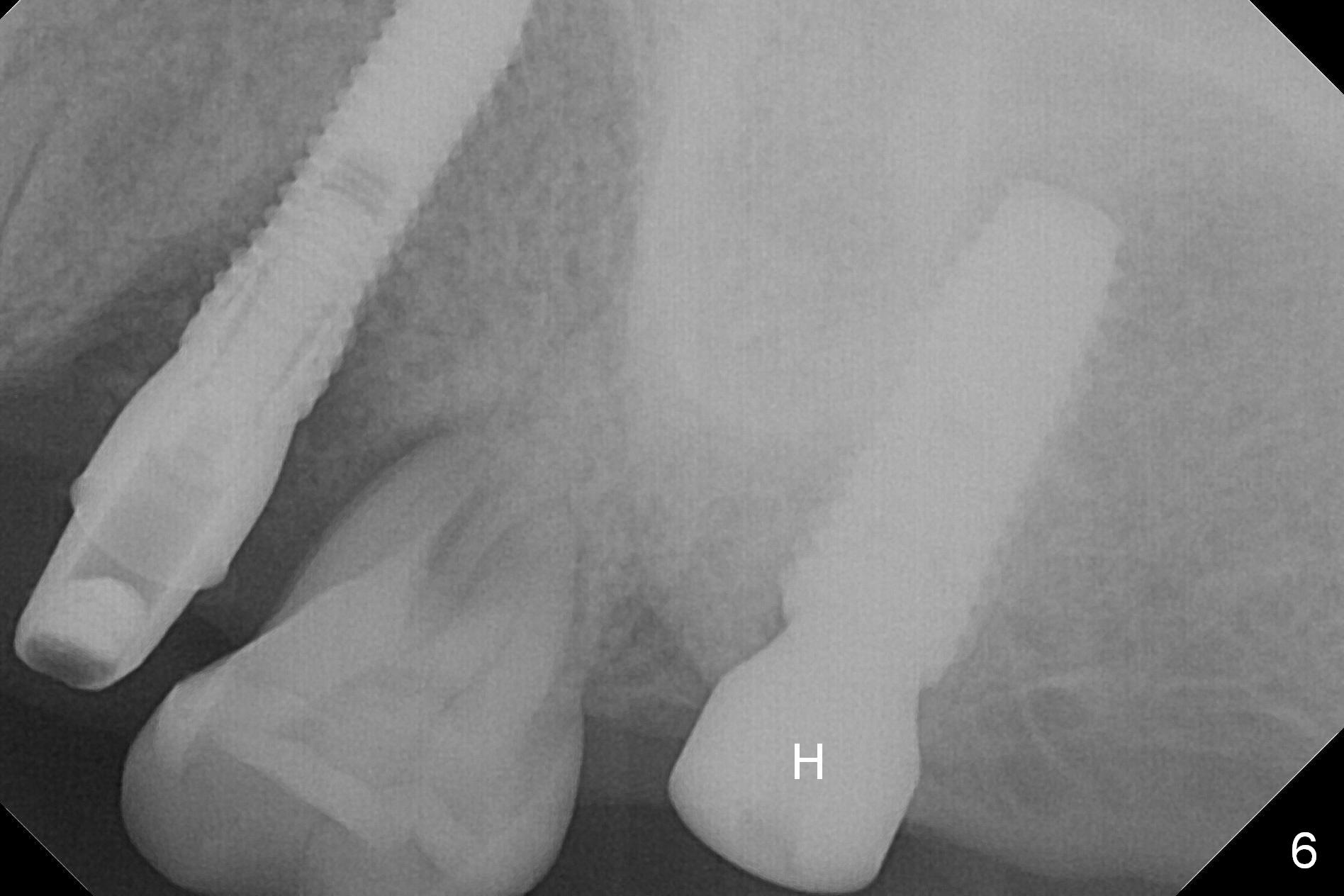 A 1.2 mm initial drill is used to start osteotomy at the site of #15 (Fig.1). After moving the osteotomy distally (with Lindamann bur), the osteotomy is enlarged by DIO Bone Expanders until 2.4/3.7 mm for 18 mm (gingival level) (Fig.2). Following the expander 3.0/4.4 mm, a 5x13 mm UF implant is placed supracrestal (Fig.3,4). After deepening the osteotomy with 3.8 mm drill for 3 mm, the implant is placed deeper by ~ 2 mm (Fig.5 arrow). Since the tooth #18 is supraerupted, a healing abutment (5.5x12(3) mm) is placed (Fig.6: H); the gingiva adapts to the abutment well. Suture is not necessary. The bone remains stable 2 and 4.5 months postop (Fig.7,8). Impression is taken. A crown is delivered nearly 6 months postop (08/07/2017). While there is minimal bone loss at #13 and 15 three years and 4 months post cementation, the tooth #14 and 18 are mobile (Fig.13,14, #13).