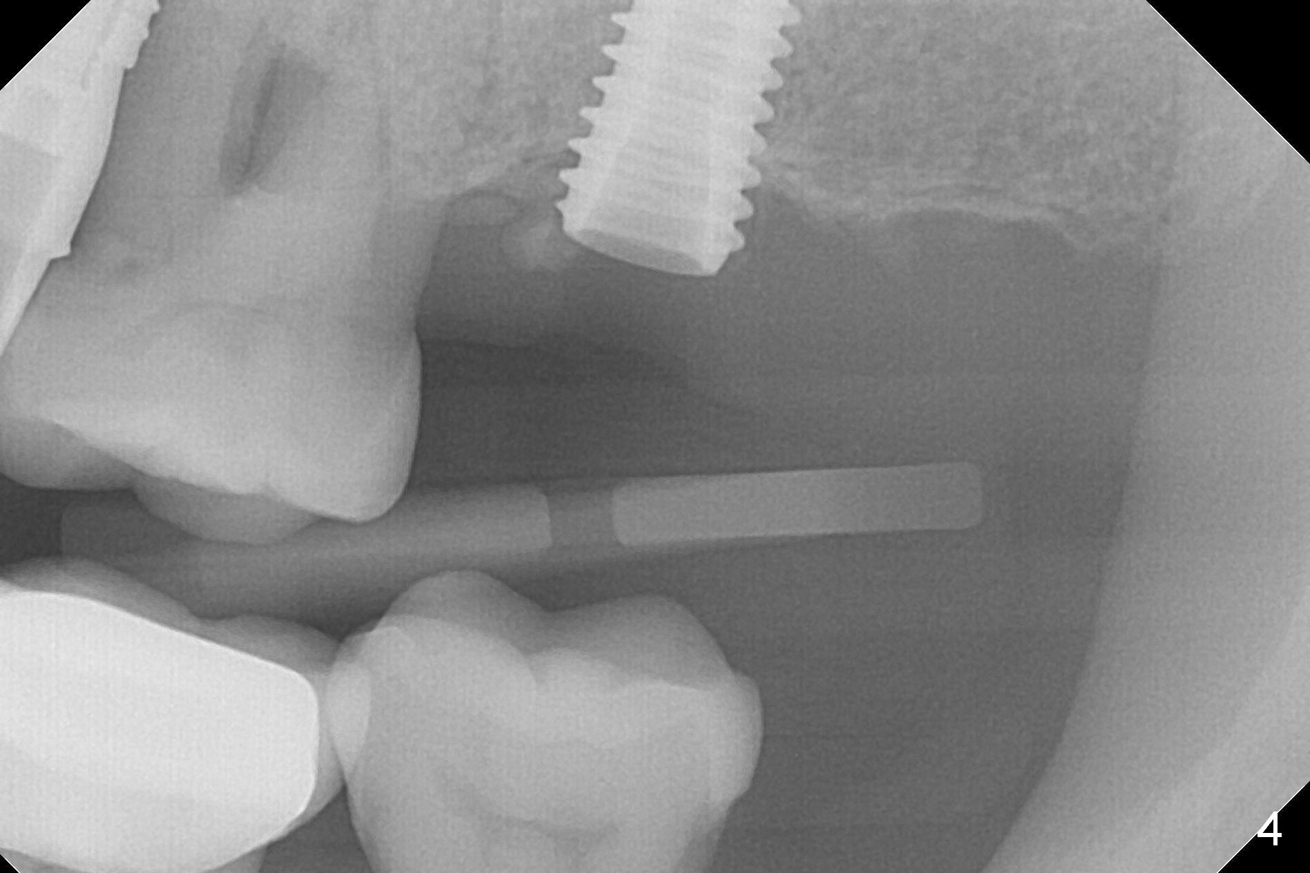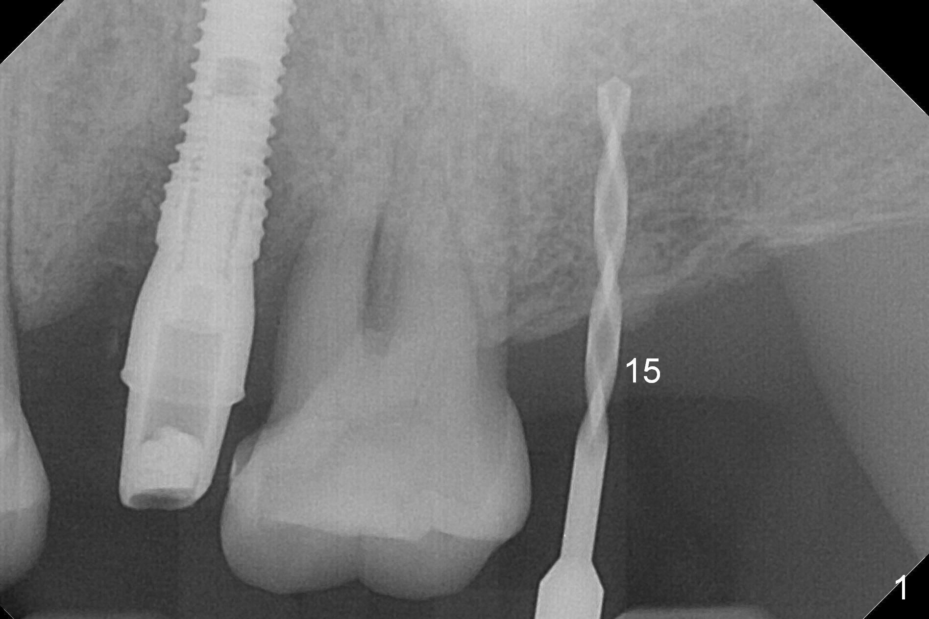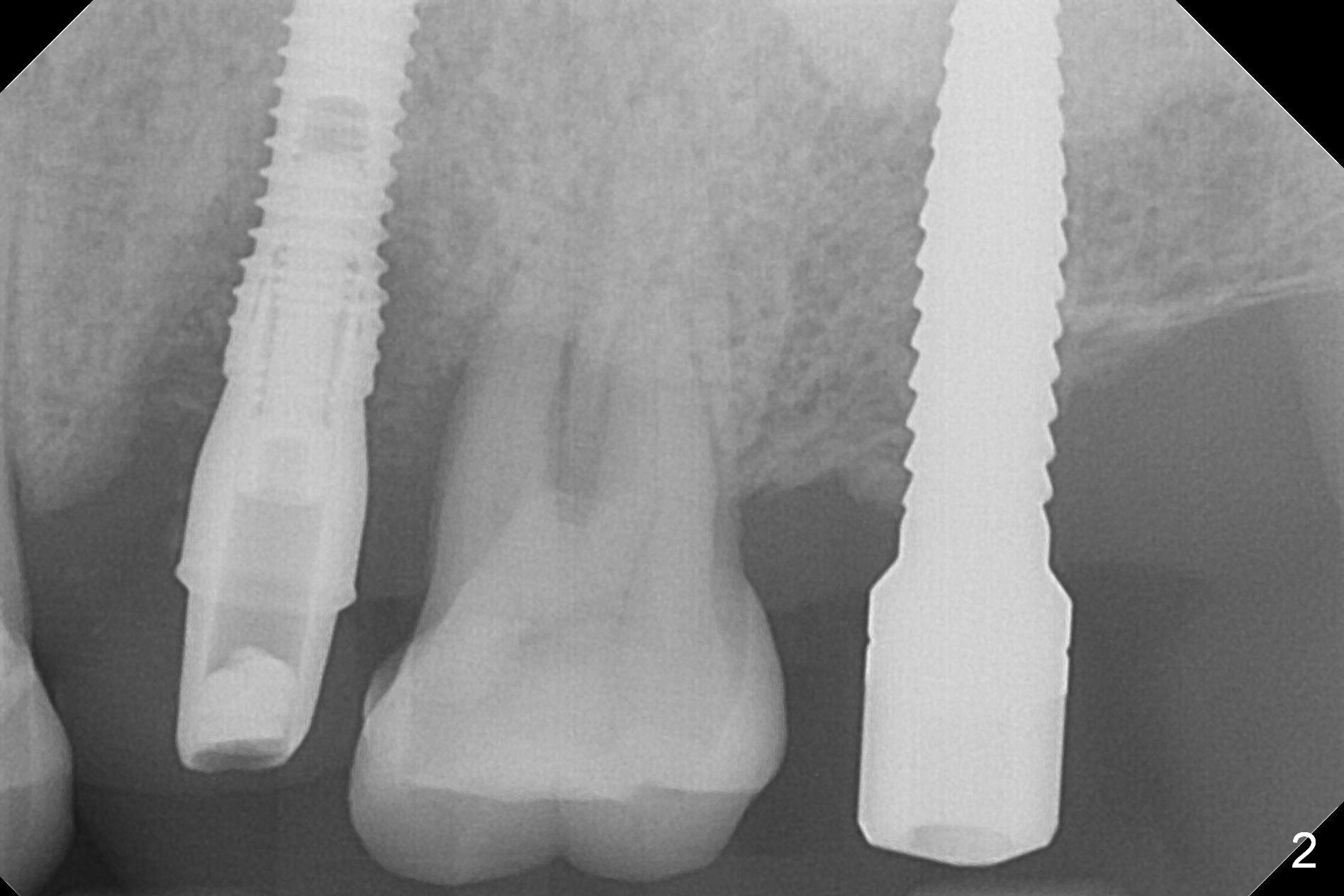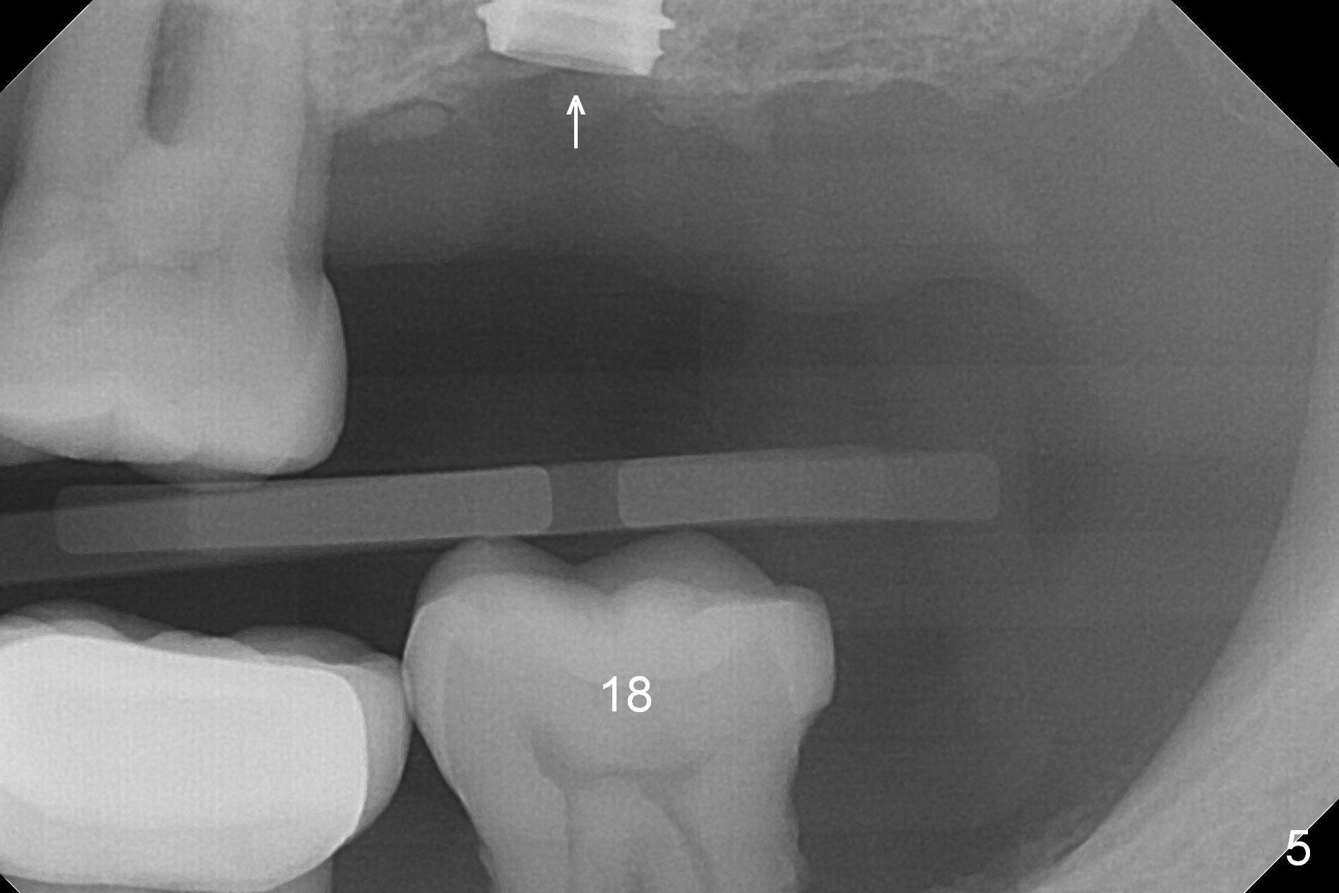 A 1.2 mm initial drill is used to start osteotomy at the site of #15 (Fig.1). After moving the osteotomy distally (with Lindamann bur), the osteotomy is enlarged by DIO Bone Expanders until 2.4/3.7 mm for 18 mm (gingival level) (Fig.2). Following the expander 3.0/4.4 mm, a 5x13 mm UF implant is placed supracrestal (Fig.3,4). After deepening the osteotomy with 3.8 mm drill for 3 mm, the implant is placed deeper by ~ 2 mm (Fig.5 arrow). Since the tooth #18 is supraerupted, a healing abutment (5.5x12(3) mm) is placed (Fig.6: H); the gingiva adapts to the abutment well. Suture is not necessary. The bone remains stable 2 and 4.5 months postop (Fig.7,8). Impression is taken. A crown is delivered nearly 6 months postop (08/07/2017). While there is minimal bone loss at #13 and 15 three years and 4 months post cementation, the tooth #14 and 18 are mobile (Fig.13,14, #13).