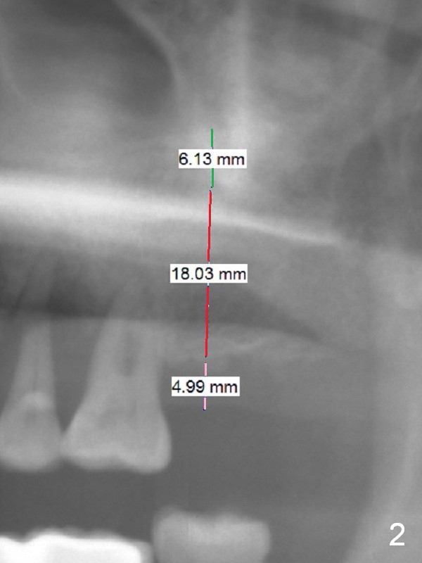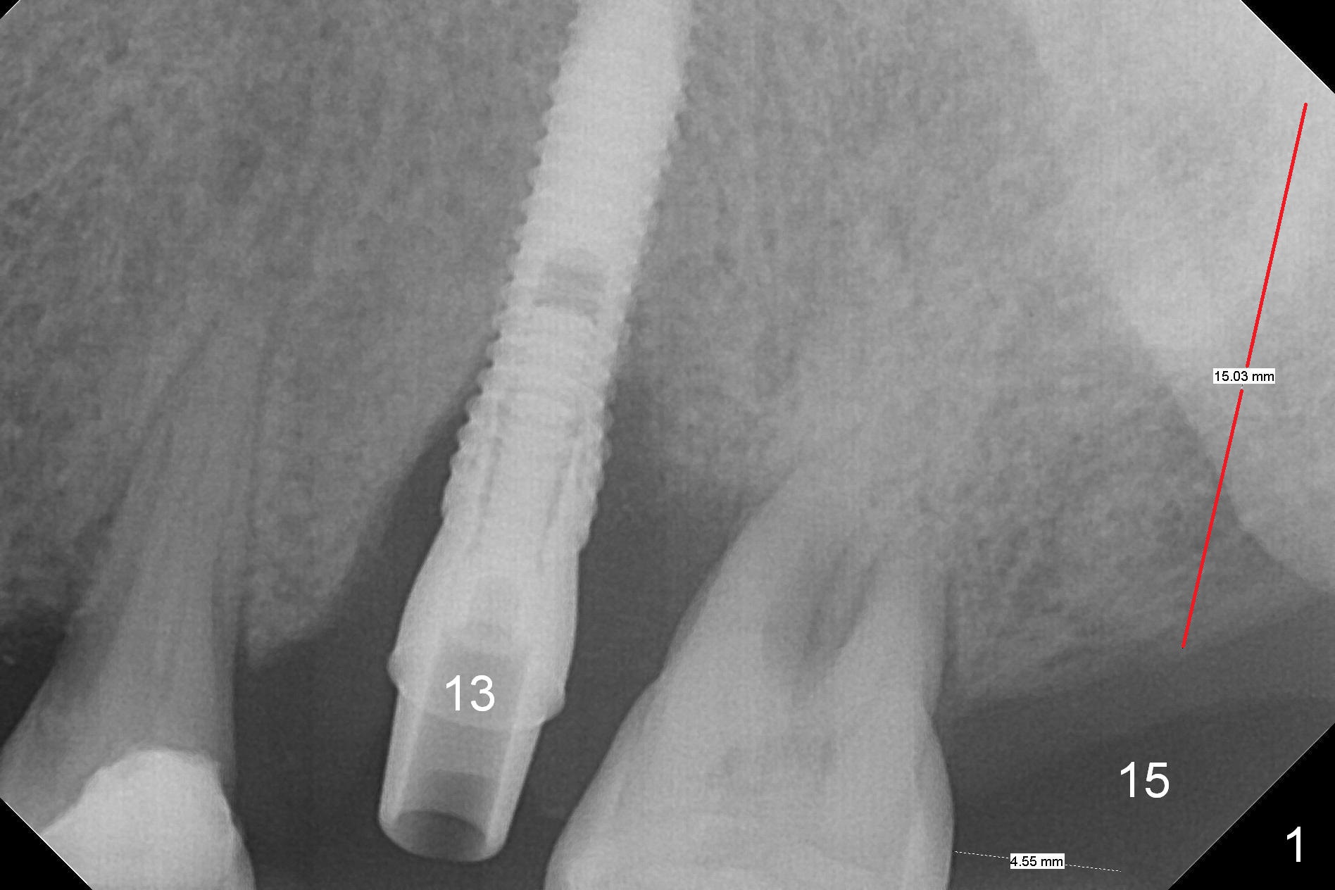 Long Implant and 5 mm Cuff of Abutment A 59-year-old man will return for #15 implant placement after the one at #13 (Fig.1). The bone allows an implant as long as 15-18 mm (Fig.1,2 red line). His gingiva is as thick as 5 mm, requiring an abutment with 5 mm cuff (Fig.2 pink line). The bone at #15 does not look dense or the ridge is narrow. Use #15 and DIO bone expansion kit for osteotomy. The less density of bone, the longer the implant. If a 4 mm abutment is long, adjust the opposing supraerupted tooth. Return to