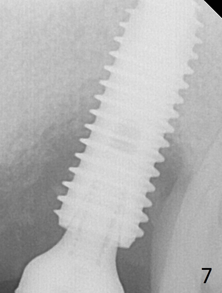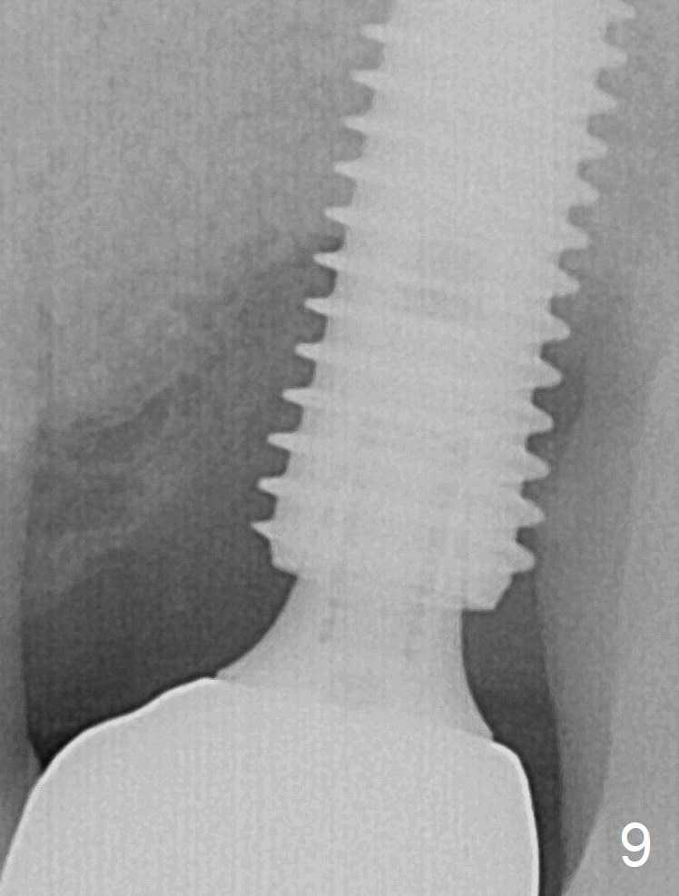 Fig.9: 7.5 months postop (2.5 months post cementation). Although there is no obvious change in bone regeneration as compared to Fig.7, there is no more distobuccal gingival recession (data not shown).