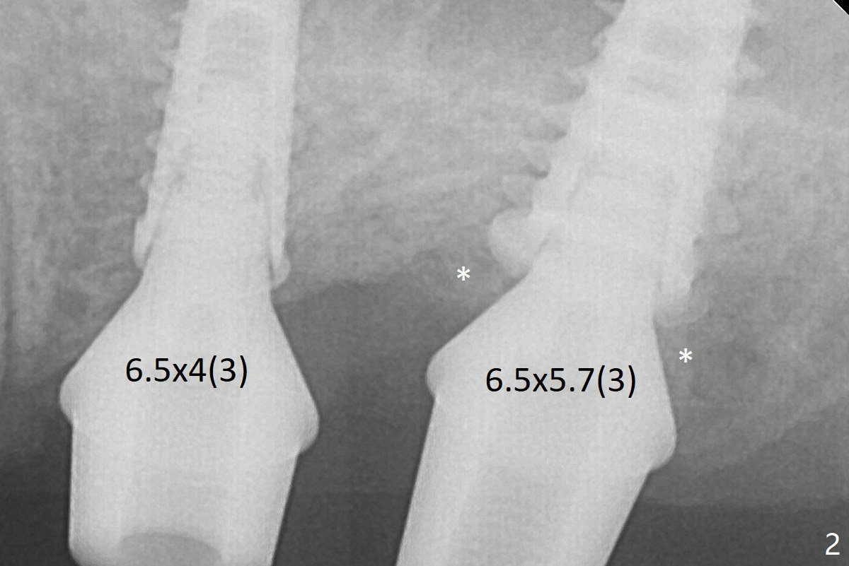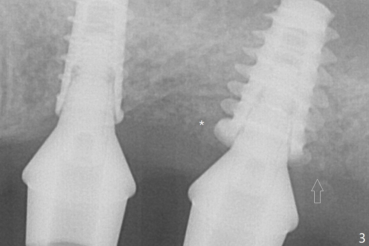 After adjustment of trajectory, a 4x11 mm definitive implant is placed at #14 with ~ 35 Ncm, while a 6x9 mm implant is placed at #15 with ~35 Ncm (Fig.2 (*: Vanilla Graft with Osteogen)). The patient returns 3 months postop (Fig.3). After changing abutments to 5.5x5.7(3) mm, impression is taken. While there is distal bone resorption (arrow (due to the large abutment/pressure?)), the mesial bone graft retains (*).