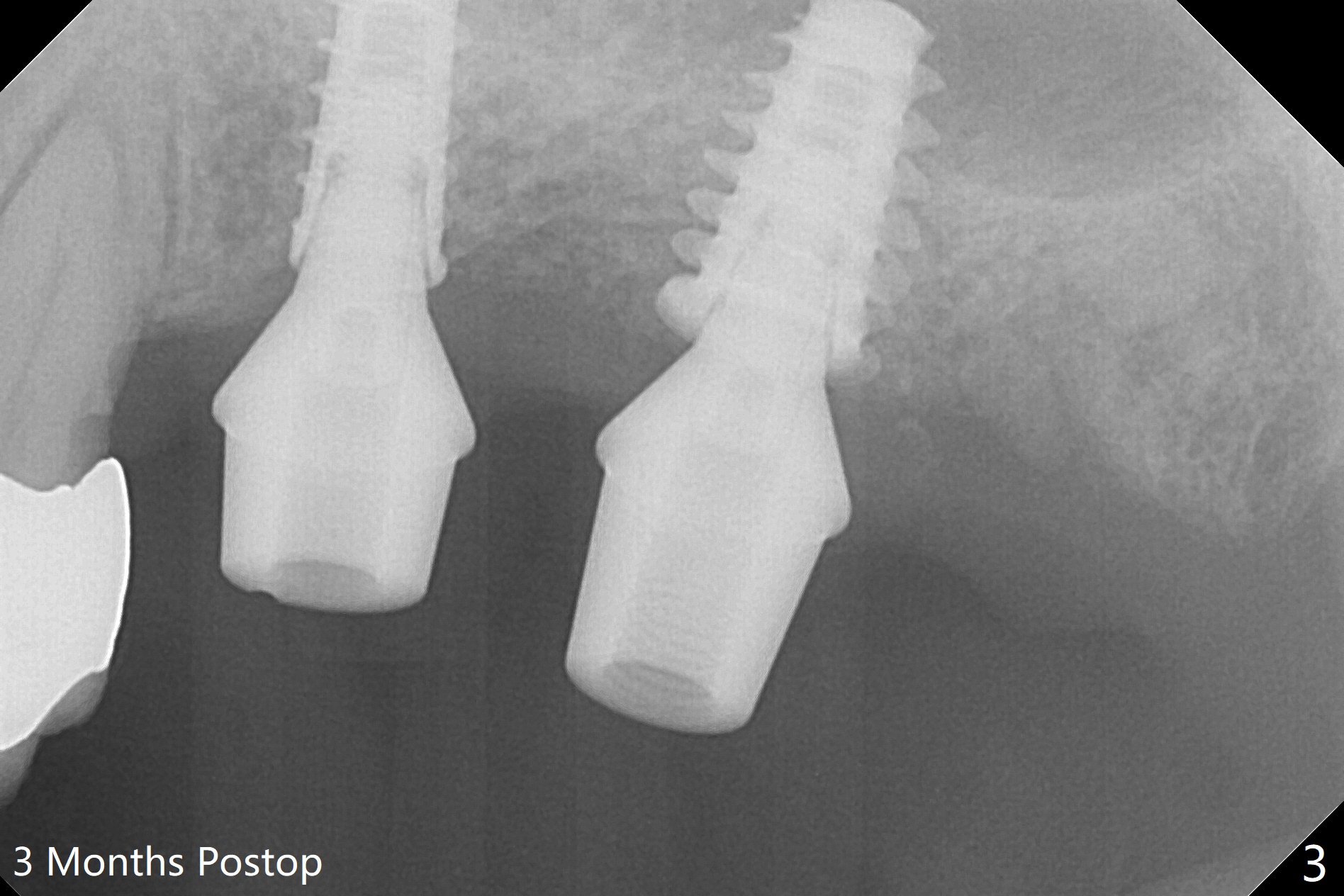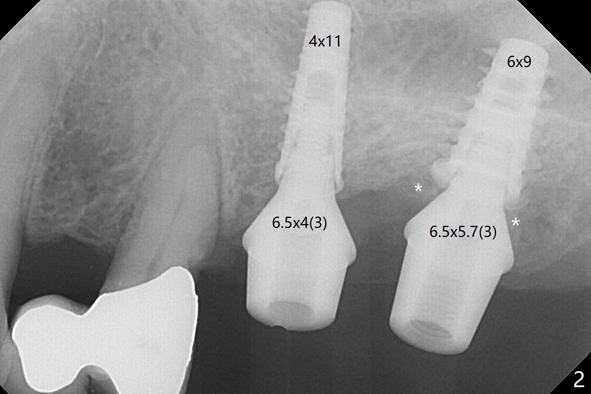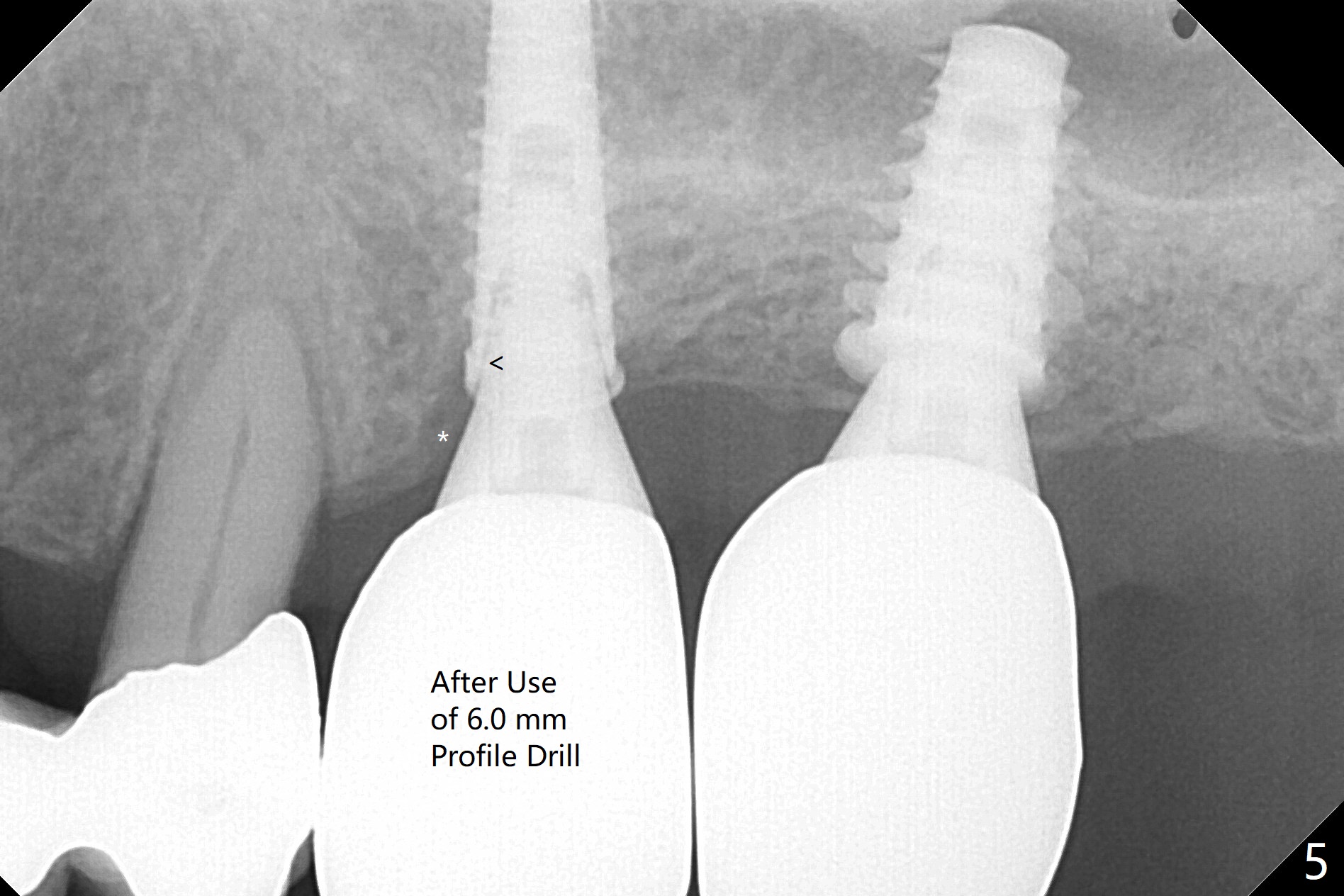 Due to irregular shape of freshly extracted socket at #15, control of depth is difficult. The sinus membrane is perforated after use of bone spreader, probably associated with drills longer than expected. SM taps (5.0 and 5.3 mm) do not achieve stability. When a 5.5x9 mm IBS dummy implant is inserted, initial stability is obtained (Fig.1). Osteotomy at the edentulous area of #14 is uneventful with insertion of a 4x11 mm dummy implant (without involving the sinus floor apparently clinically as well, Fig.1). After adjustment of trajectory, a 4x11 mm definitive implant is placed at #14 with ~ 35 Ncm, while a 6x9 mm implant is placed at #15 with ~35 Ncm (Fig.2 (*: Vanilla Graft with Osteogen)). Periodontal dressing is applied around the abutments and neighboring teeth. There is mild oral and nasal hemorrhage postop. In fact the patient has history of stroke with oral Plavix intake. The medicine stops 4 days preop and is advised to resume after hemostasis is achieved. The patient returns 3 months postop (Fig.3). After changing abutments to 5.5x5.7(3) mm, impression is taken. The crown/abutment at #14 is loose 1 year 10 months post cementation. After use of 5.5 mm profile drill, the crown/abutment is reseated, but the seating is incomplete (Fig.4 <) because of contact of the abutment with the mesial crest (*). A larger profile drill does not help (Fig.5). When a narrower abutment (4.5x7.5(3) mm) is torqued, it appears to be completely seated (Fig.6). After distal surface adjustment of the abutment, impression is re-taken. There are 3 other unfavorable conditions: poor crown/implant ratio and trajectory and #18 missing. The abutment at #14 must have been prepared for parallelism before impression. Return to Upper Molar Immediate Implant, Prevent Molar Periimplantitis (Protocols, Table), Armaments No Deviation Prevent Screw Loosening Xin Wei, DDS, PhD, MS 1st edition 11/28/2017, last revision 02/23/2021