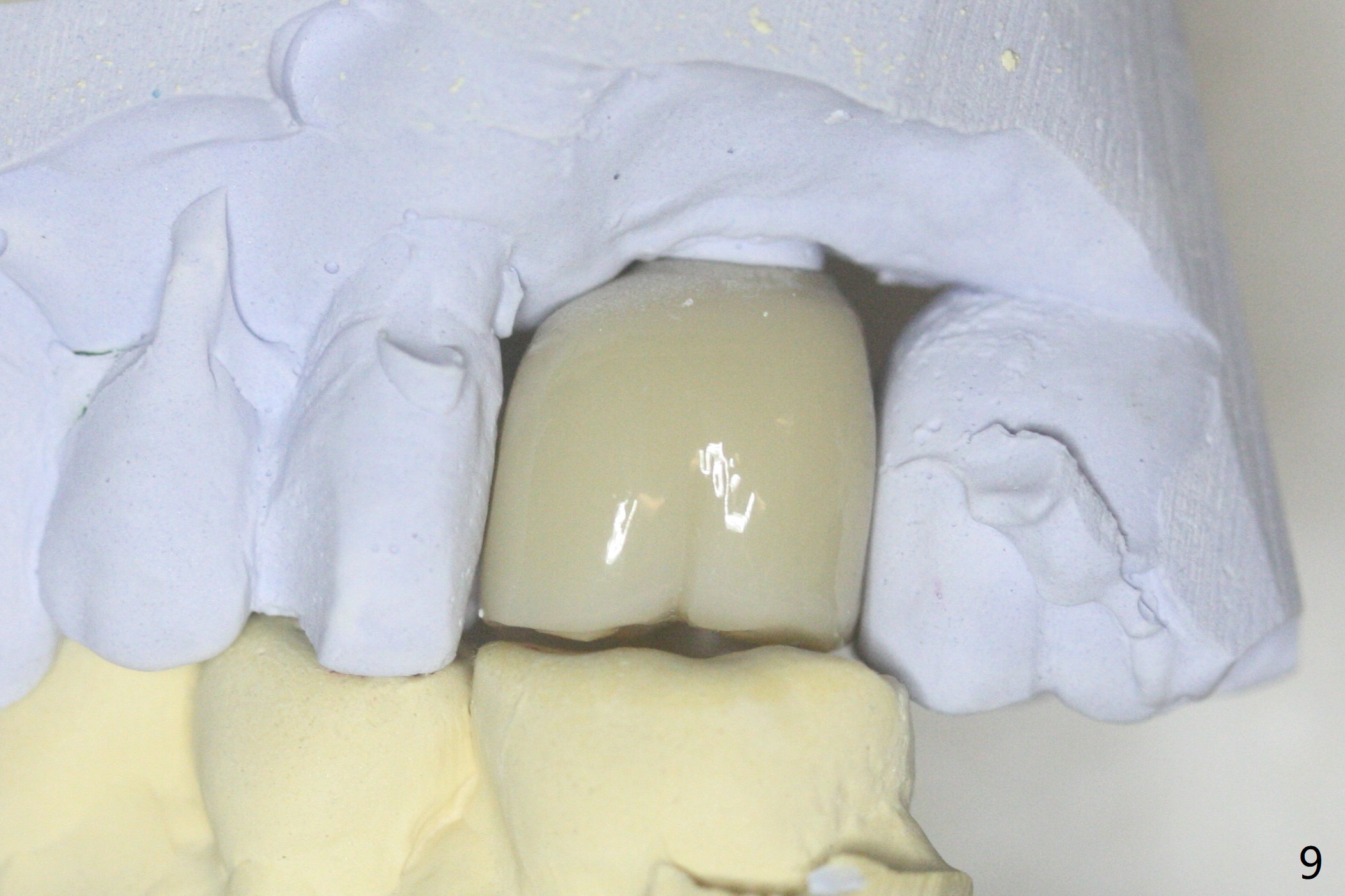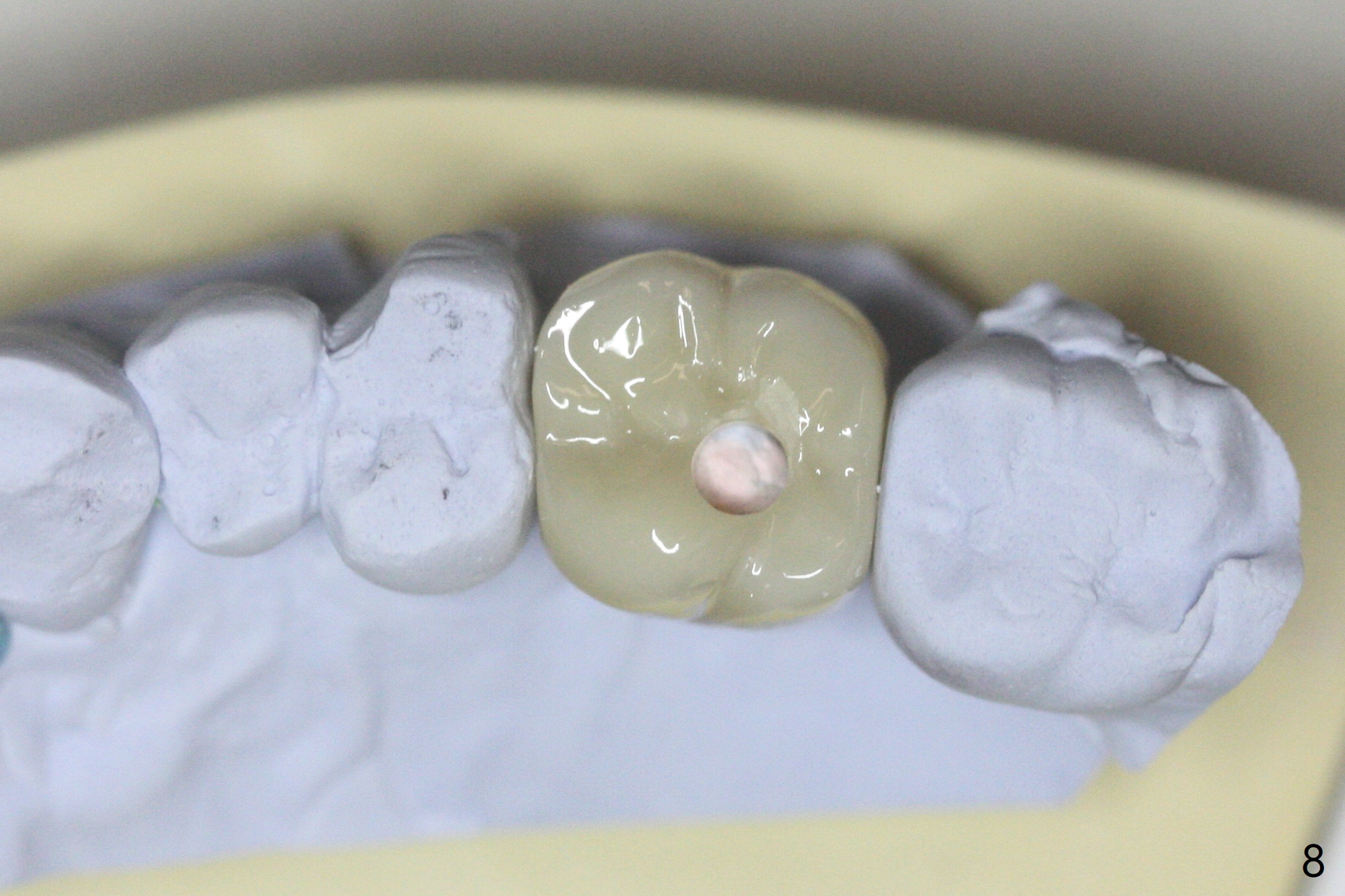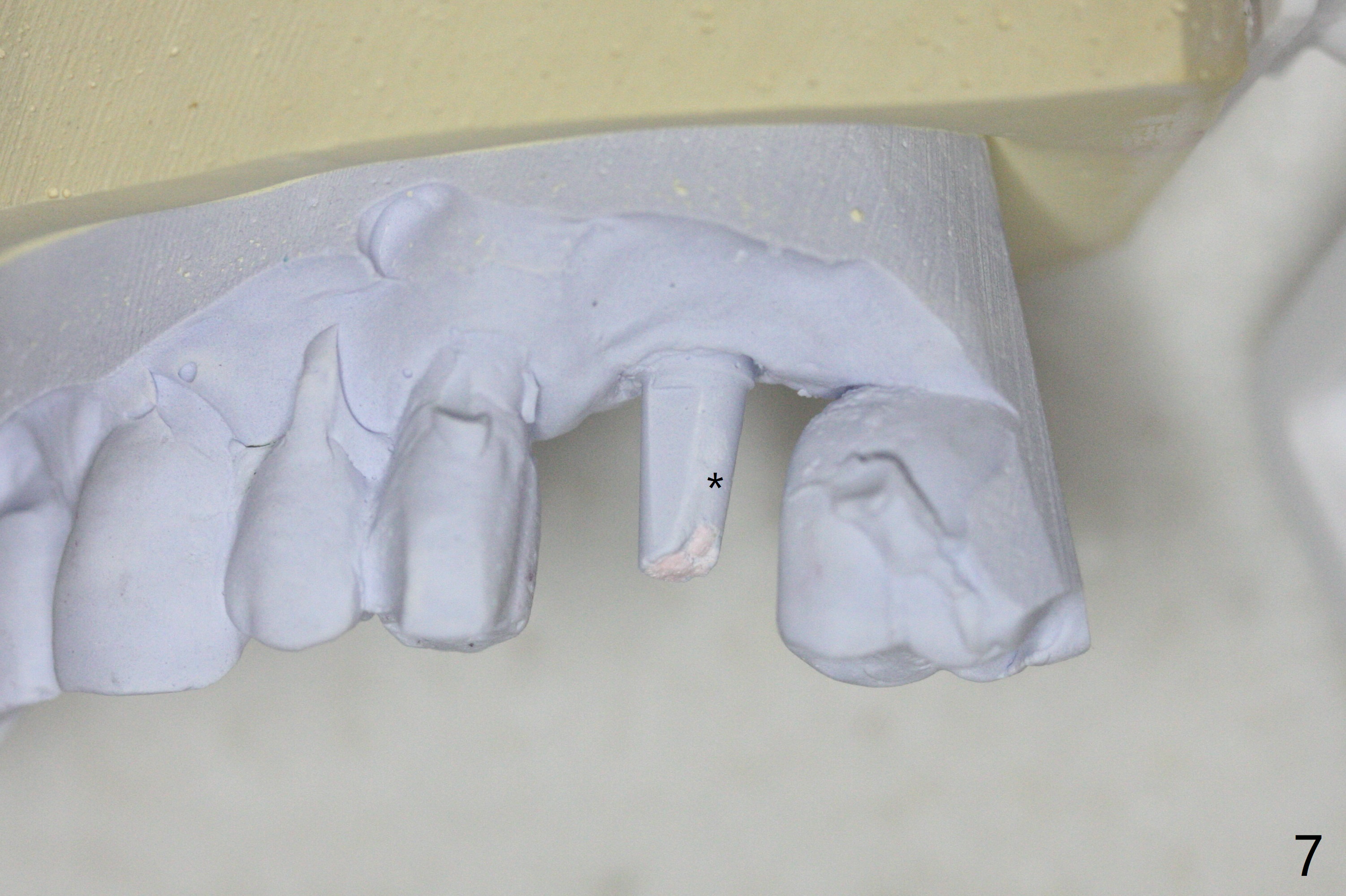 Due to irregular shape of freshly extracted socket at #15, control of depth is difficult. The sinus membrane is perforated after use of bone spreader, probably associated with drills longer than expected. SM taps (5.0 and 5.3 mm) do not achieve stability. When a 5.5x9 mm IBS dummy implant is inserted, initial stability is obtained (Fig.1). Osteotomy at the edentulous area of #14 is uneventful with insertion of a 4x11 mm dummy implant (without involving the sinus floor apparently clinically as well, Fig.1). After adjustment of trajectory, a 4x11 mm definitive implant is placed at #14 with ~ 35 Ncm, while a 6x9 mm implant is placed at #15 with ~35 Ncm (Fig.2 (*: Vanilla Graft with Osteogen)). Periodontal dressing is applied around the abutments and neighboring teeth. There is mild oral and nasal hemorrhage postop. In fact the patient has history of stroke with oral Plavix intake. The medicine stops 4 days preop and is advised to resume after hemostasis is achieved. The patient returns 3 months postop (Fig.3). After changing abutments to 5.5x5.7(3) mm, impression is taken. The crown/abutment at #14 is loose 1 year 10 months post cementation. After use of 5.5 mm profile drill, the crown/abutment is reseated, but the seating is incomplete (Fig.4 <) because of contact of the abutment with the mesial crest (*). A larger profile drill does not help (Fig.5). When a narrower abutment (4.5x7.5(3) mm) is torqued, it appears to be completely seated (Fig.6). After distal surface adjustment of the abutment, impression is re-taken. There are 3 other unfavorable conditions: poor crown/implant ratio and trajectory and #18 missing. The abutment at #14 must have been prepared for parallelism before impression. Return to Upper Molar Immediate Implant, Prevent Molar Periimplantitis (Protocols, Table), Armaments No Deviation Prevent Screw Loosening Xin Wei, DDS, PhD, MS 1st edition 11/28/2017, last revision 02/23/2021