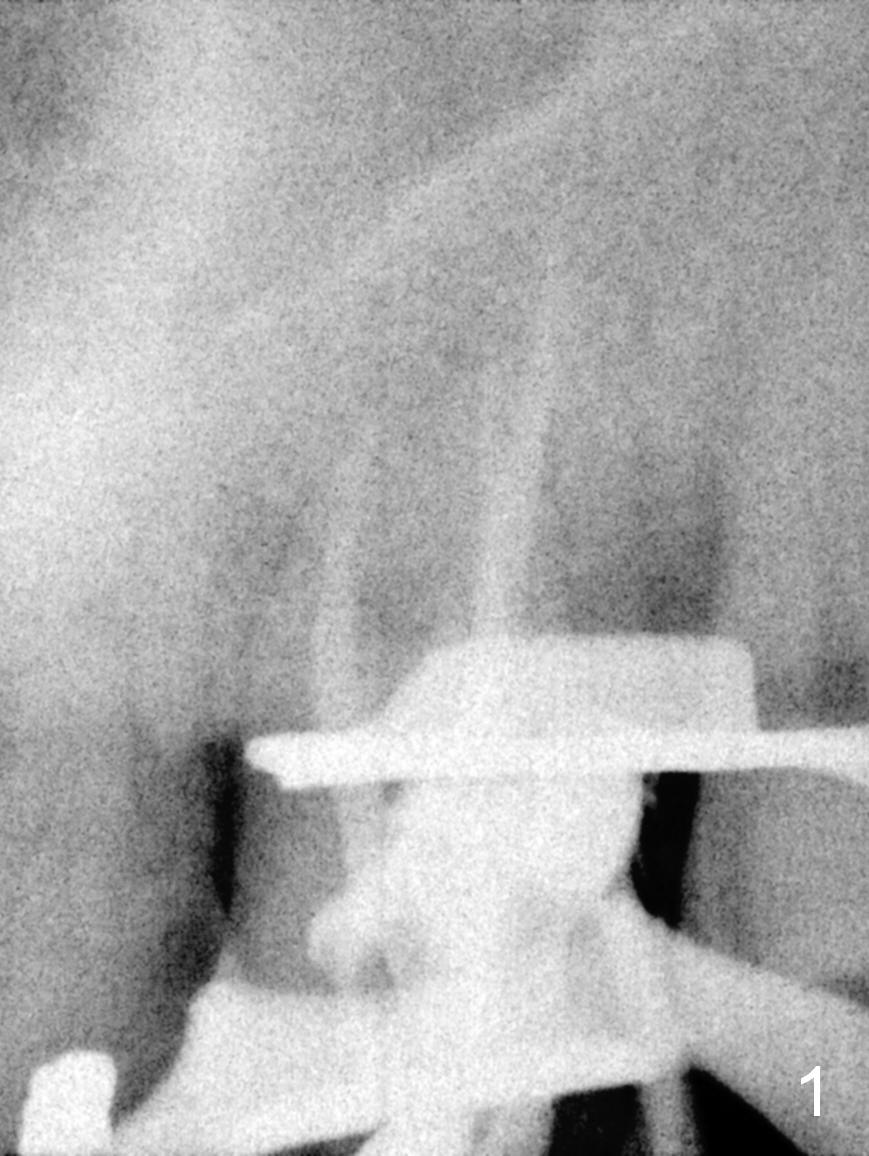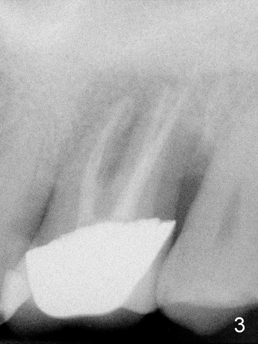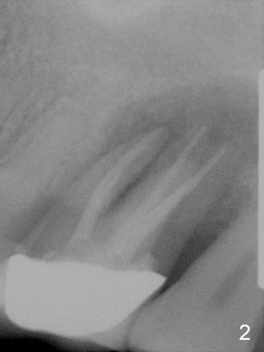 A 56-year-old woman has had sign of root fracture at the site of 15 for the last 3 years (Fig.2,3), 5 years after RCT (Fig.1). It appears that the sinus floor is around 1 mm and consists of the cortical bone (Fig.2). After extraction and Clindamycin disinfection, IBS Sinus Lifter (2 3) will be used, followed by allograft placement, 4.3 mm long drill, and 5x9 mm dummy implant. Take PA and measure depths relative to the sinus floor and crest. Prepare latch and hand implant drivers as well as calibrated torque wrench. Amalgam and large bone carriers should be available. Although primary stability is expected to be low, an immediate provisional should be fabricated with sufficient occlusal clearance. Since the bone density is high, use higher voltage to take X-ray.