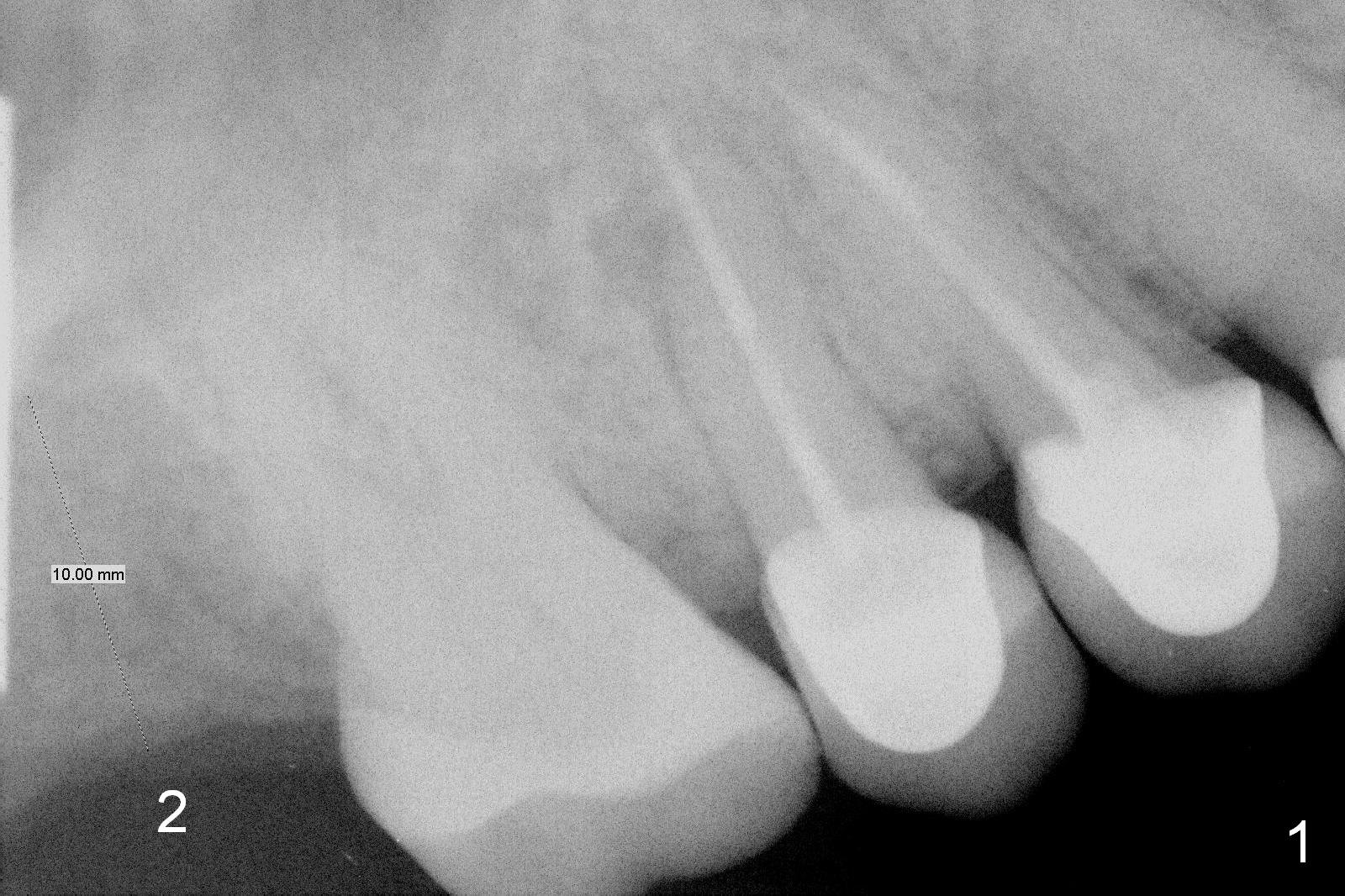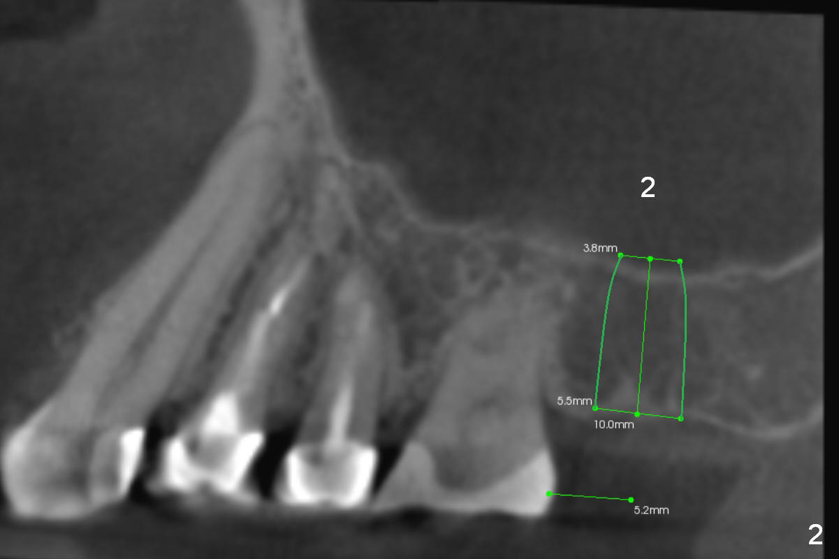 A 60-year-old woman has lost the tooth #2 for a few years (Fig.1). Since then, three of her anterior teeth have fractured and required implant placement (#8, 10,11). It appears that restoration of the tooth #2 may alleviate further anterior breakdown. There are 2 challenges associated with this case: supraeruption of the opposing teeth and low bone density (40-200).