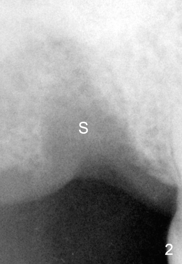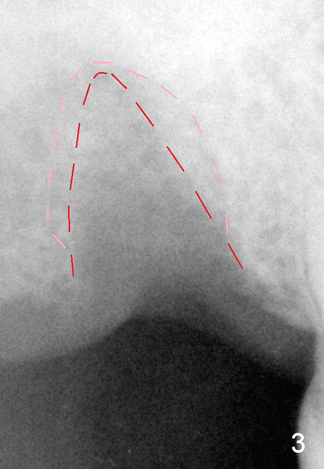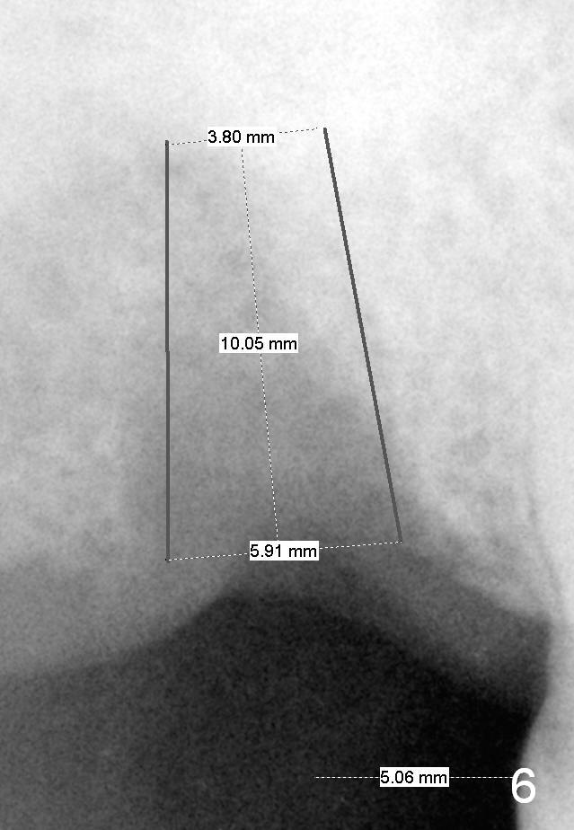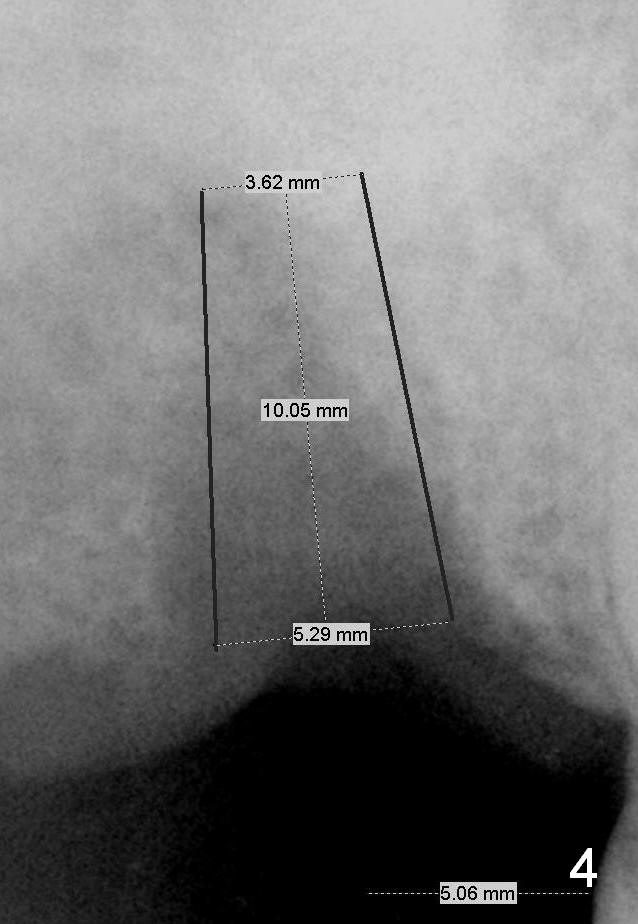 A 76-year-old man had the tooth #2 extracted (due to endo failure) 2 weeks ago (Fig.1). The socket looks "empty" (Fig.2 S, basis for osteotomes). It consists of the buccal (pink dashed line) and palatal (red) ones (Fig.3). In one word, the socket is pyramidal. It appears that a tapered implant is appropriate for the site. Clinically, the socket is healing with soft tissue covering the opening of the socket.
