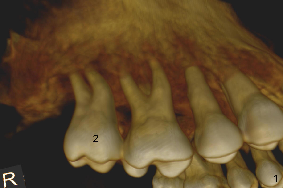 A 46-year-old lady is a typical dental phobic, but she is reasonable. Her chronic periodontitis is generalized and severe (Fig.1 3-D image, taken 1 year ago). An implant has been placed at #6 (healed site). It fails for the first time, probably due to bone loss after extraction. Soon after last periodontal maintenance, the tooth #2 develops pain and swelling. Immediate implant is a must.