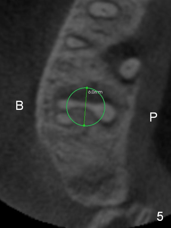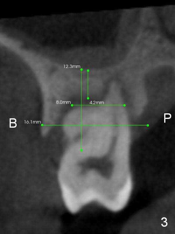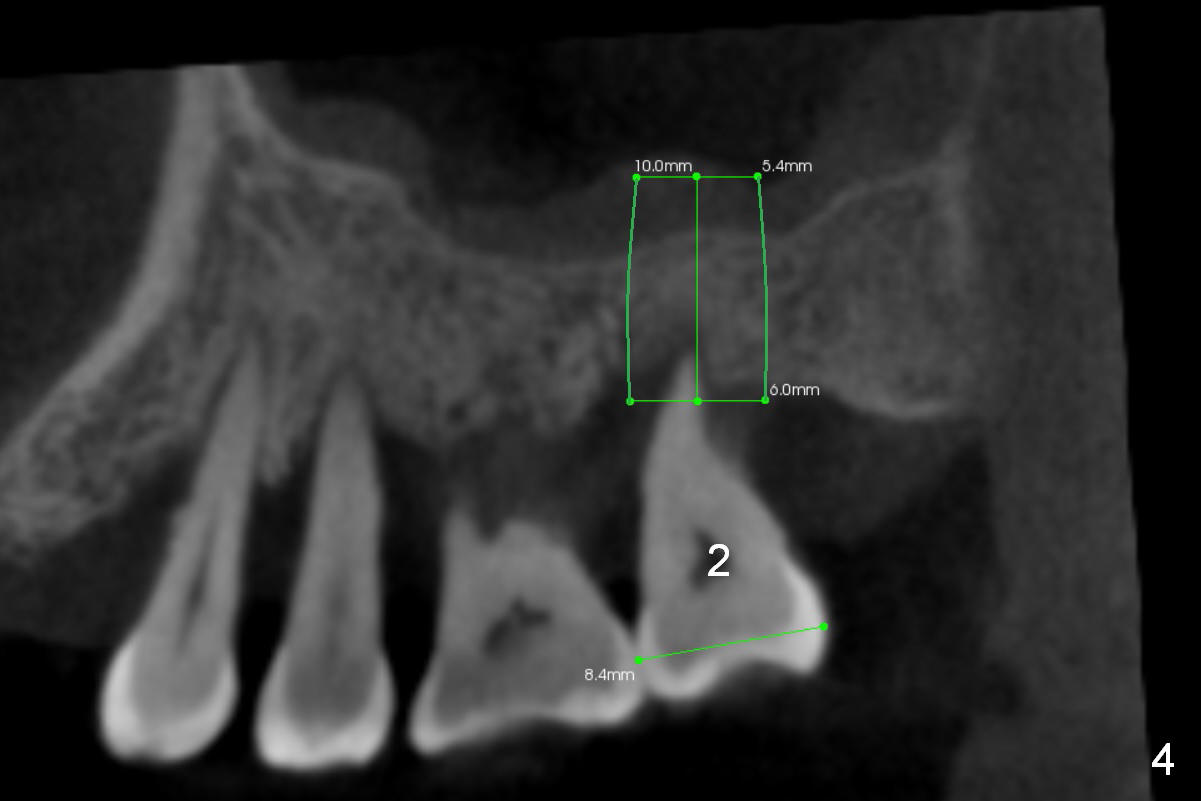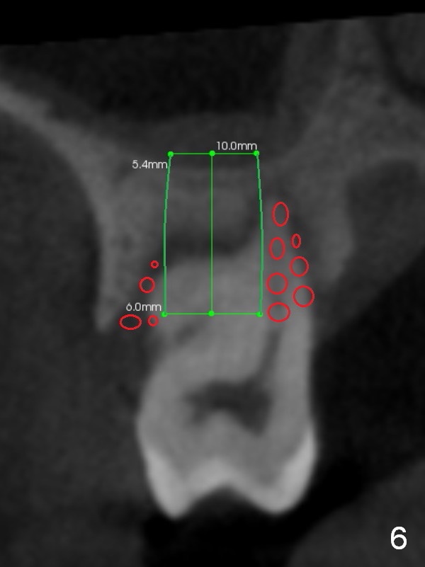 The socket is wider buccopalatally (Fig.2 (3-D disto-occlusal view),3 (coronal section)) than mesiodistally (Fig.1,4 (sagittal section),5 (axial section)). Unless more bone loss has occurred in the last year, a 6x10 mm UF implant is to be placed in the middle of the socket (Fig.6, (soaked with 2% Xylocaine/1:50,000 Epinephrine gauze)) with bone graft to be placed in the buccal and palatal gaps (red circles). Bone density in the middle of the socket is 550-700 Hounsfield units. Use RT2 or 2 mm pilot drill to start osteotomy ~ 3 mm. The largest osteotome is RT4, or largest reamer 4 mm, followed by 4.5x17 mm tap at 14 mm, until 6x17 mm one. Make sure that the sinus floor is penetrated.