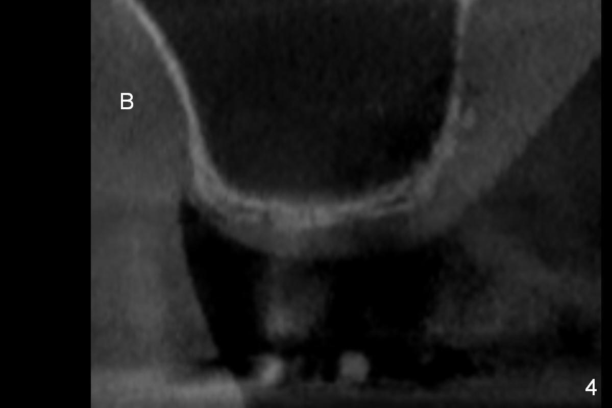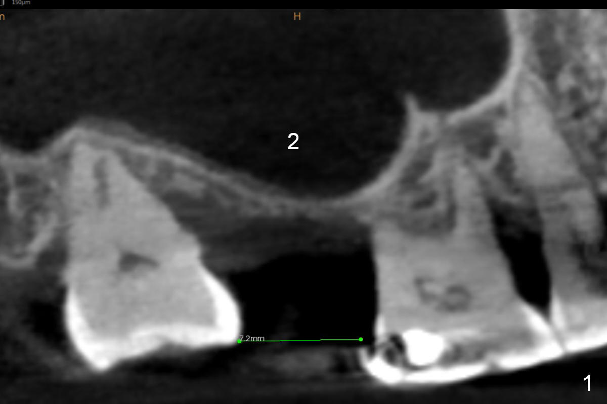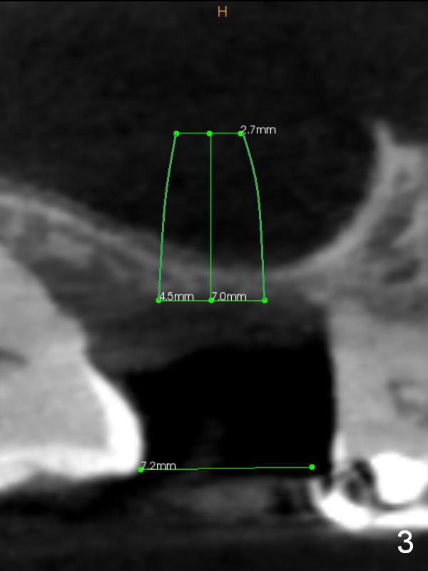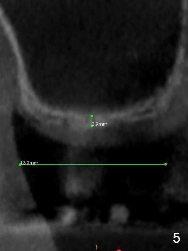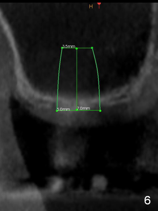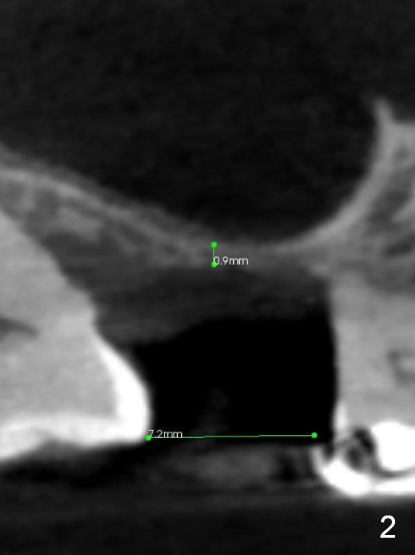 A 78-year-old man needs implant restoration at #2 in spite of limited bone height, because of severe ridge atrophy at #18 and 19. Sagittal (Fig.1-3) and coronal (Fig.4-6) sections show bone height less than 1 mm. If there is plenty of the keratinized tissue at #2, use a 4 mm tissue punch for access, followed by sinus lifter. Use fine and coarse allograft for sinus lift.