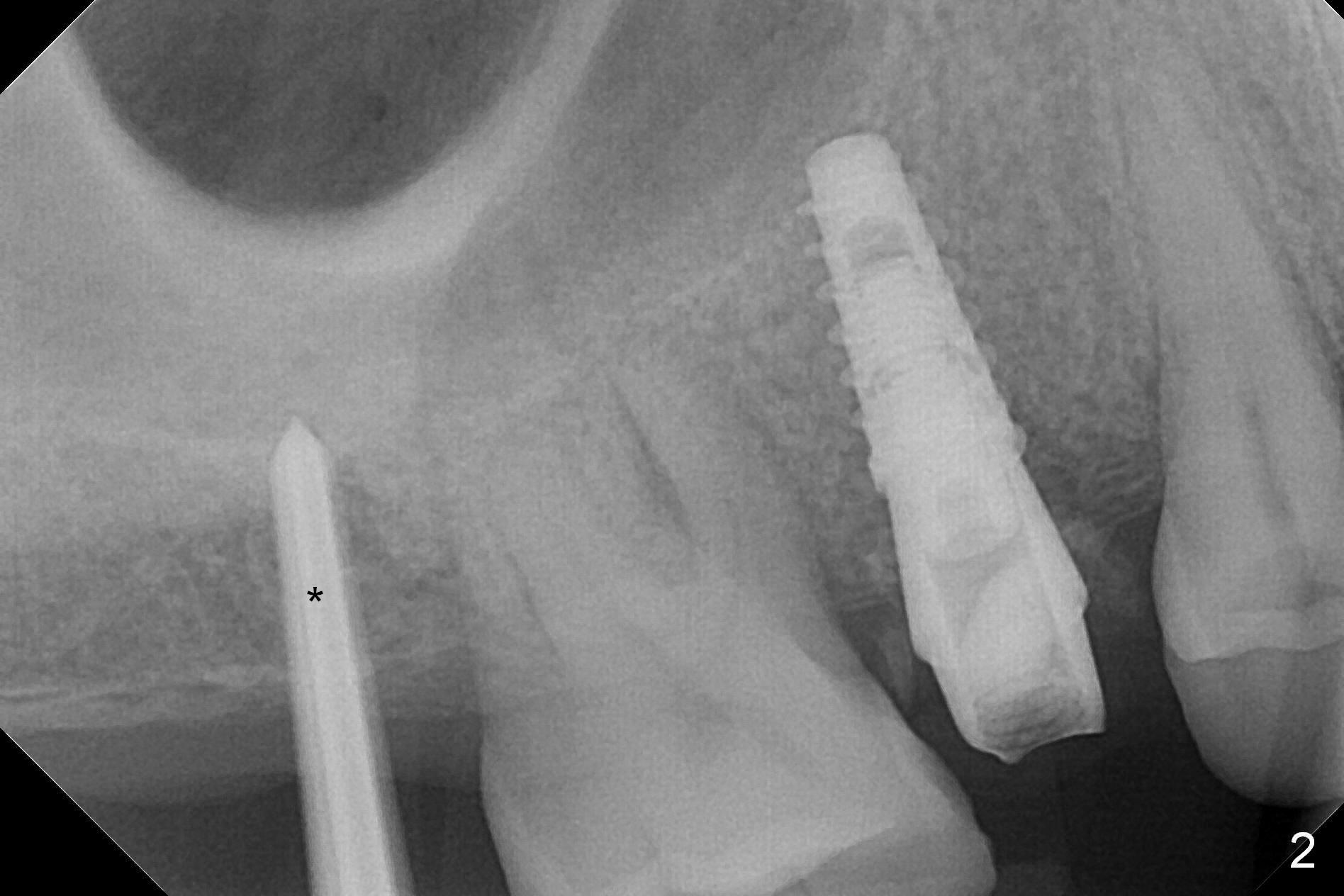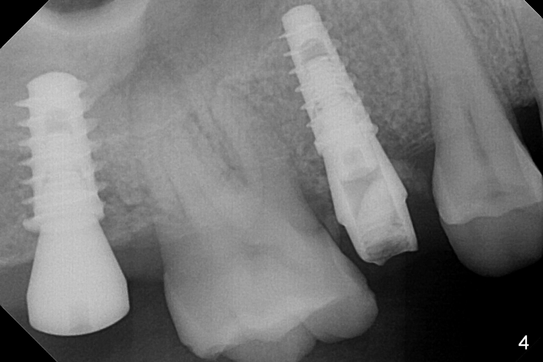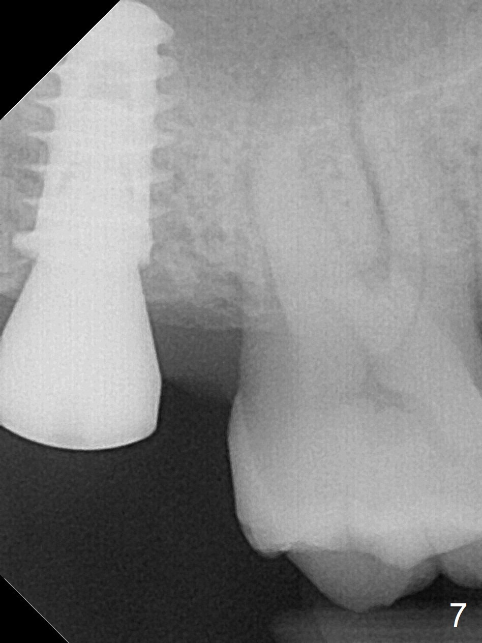 Since the ridge at the site of #2 is wide (Fig.1), Magic Split is used for access and bone density determination. In fact it enters for 9 mm (gingival level), followed by Magic Expander (ME) 3 mm (Fig.2 *). The center of the latter is 3.9 mm from the distal surface of the tooth #3. Lindamann bur is used to move the osteotomy distal, followed by sequential use of MEs until 4.3 mm one. When a 5x9 mm dummy implant is placed, its center is somewhat mesial (Fig.3 brown line). What needs to be done is change the trajectory to the red line so that the coronal end of the definitive implant (5.5x9 mm) will be placed evenly subcrestal (Fig.4,5). It is what happens, although slightly too subcrestal. Insertion torque is <35 Ncm; a 6x4 mm healing abutment is placed. ME 4.8 mm has to be tapped for 13 mm from gingival margin in order to let the implant penetrate the sinus floor. IBS implants seem to lack self tapping ability. Its tap drills should possess this capacity. Allograft/autogenous bone (harvested from dummy implant) is placed prior to implantation. The patient returns for impression 6 months postop (Fig.6,7; #4). A 5x4(3) mm abutment is placed; its height is reduced as well as the opposing supraerupted tooth (Fig.5) prior to impression.