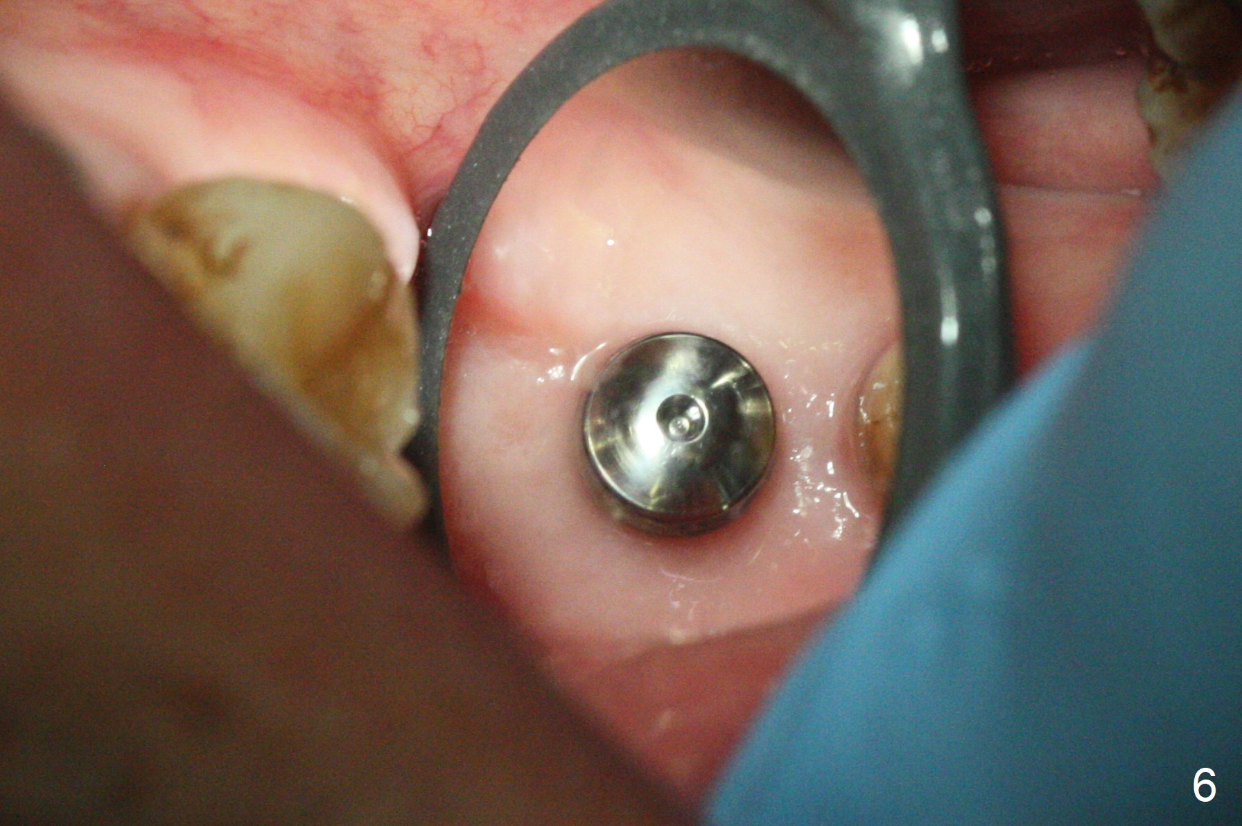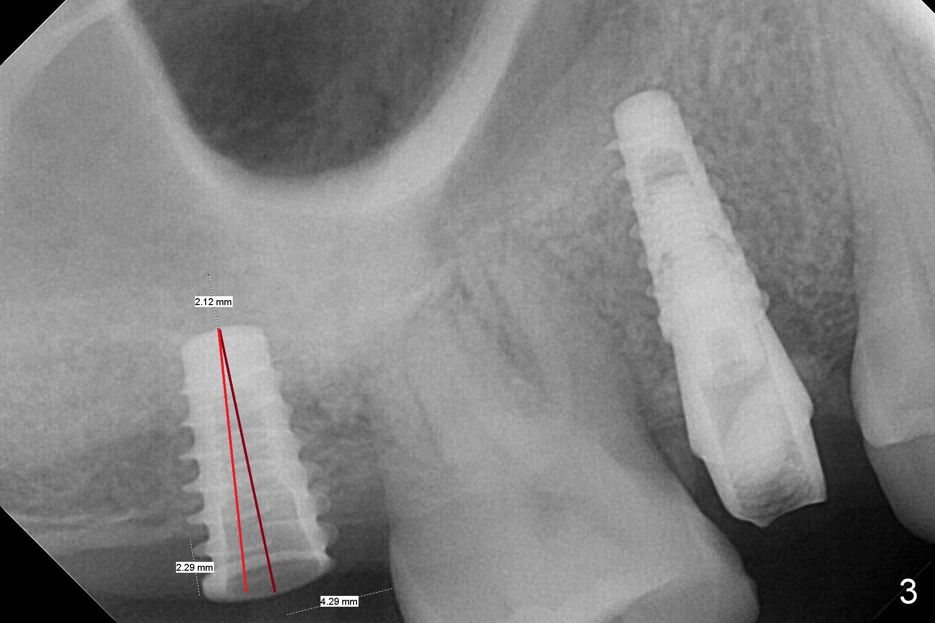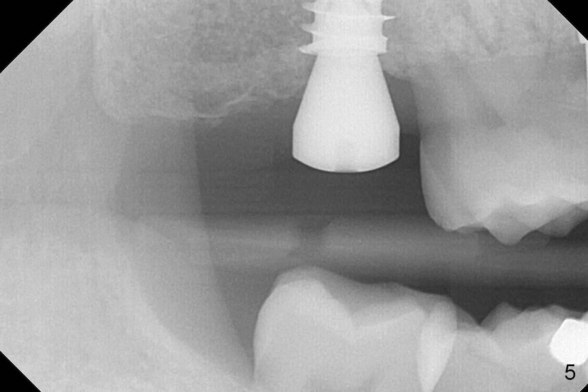Since the ridge at the site of #2 is wide (Fig.1), Magic Split is used for access and bone density determination. In fact it enters for 9 mm (gingival level), followed by Magic Expander (ME) 3 mm (Fig.2 *). The center of the latter is 3.9 mm from the distal surface of the tooth #3. Lindamann bur is used to move the osteotomy distal, followed by sequential use of MEs until 4.3 mm one. When a 5x9 mm dummy implant is placed, its center is somewhat mesial (Fig.3 brown line). What needs to be done is change the trajectory to the red line so that the coronal end of the definitive implant (5.5x9 mm) will be placed evenly subcrestal (Fig.4,5). It is what happens, although slightly too subcrestal. Insertion torque is <35 Ncm; a 6x4 mm healing abutment is placed. ME 4.8 mm has to be tapped for 13 mm from gingival margin in order to let the implant penetrate the sinus floor. IBS implants seem to lack self tapping ability. Its tap drills should possess this capacity. Allograft/autogenous bone (harvested from dummy implant) is placed prior to implantation. The patient returns for impression 6 months postop (Fig.6,7; #4). A 5x4(3) mm abutment is placed; its height is reduced as well as the opposing supraerupted tooth (Fig.5) prior to impression.
