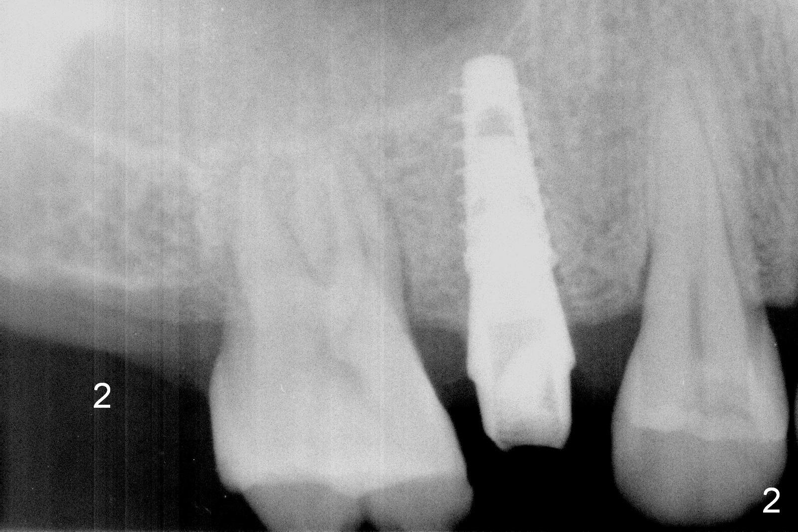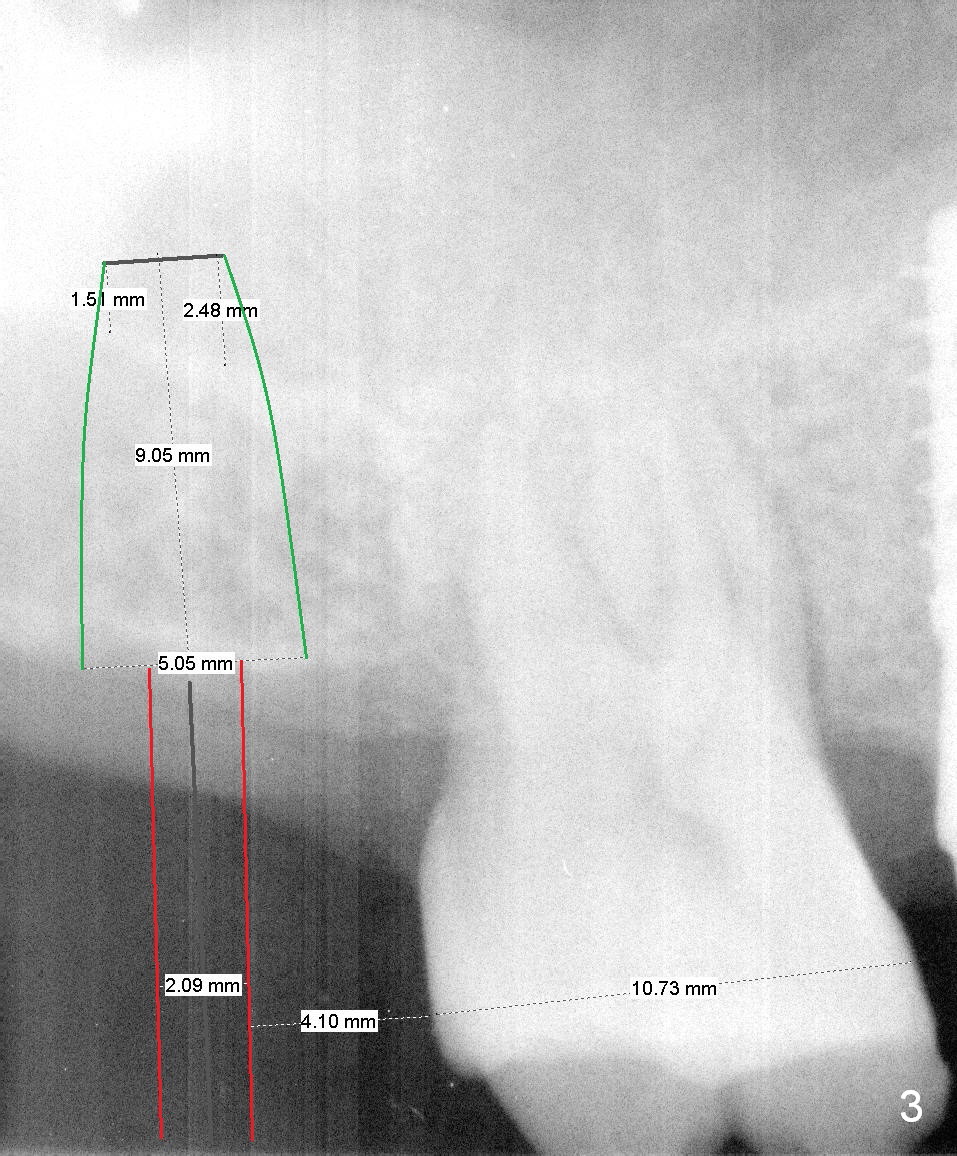 There is a tendency to drift osteotomy distally at the upper 2nd molar area when the 3rd molar is missing. Without a surgical stent, an implant spacer should be used constantly from the beginning (pilot drill) to the end (implant placement, Fig.3) for the site of #2 of the 47-year-old man (Fig.2). The tooth was extracted because of periodontitis and bruxism (Fig.1 (taken 5 years earlier)). Please measure the diameter of the handle of every instrument, including drill, expander and implant driver in advance (Fig.3 red lines). The center of the handle should be 5 mm from the distal surface of the 1st molar. If the diameter of the handle is 2 mm, the implant spacer is set to be 4 mm (Fig.3). For convenience of insertion (the edge of the spacer is wider than the center), use the 3.5 mm one. Take PA as early as possible and change position with a Lindamann bur accordingly. Prepare Magic Sinus Kit and separate IBS implant driver (in a pouch, not from a cassette).
