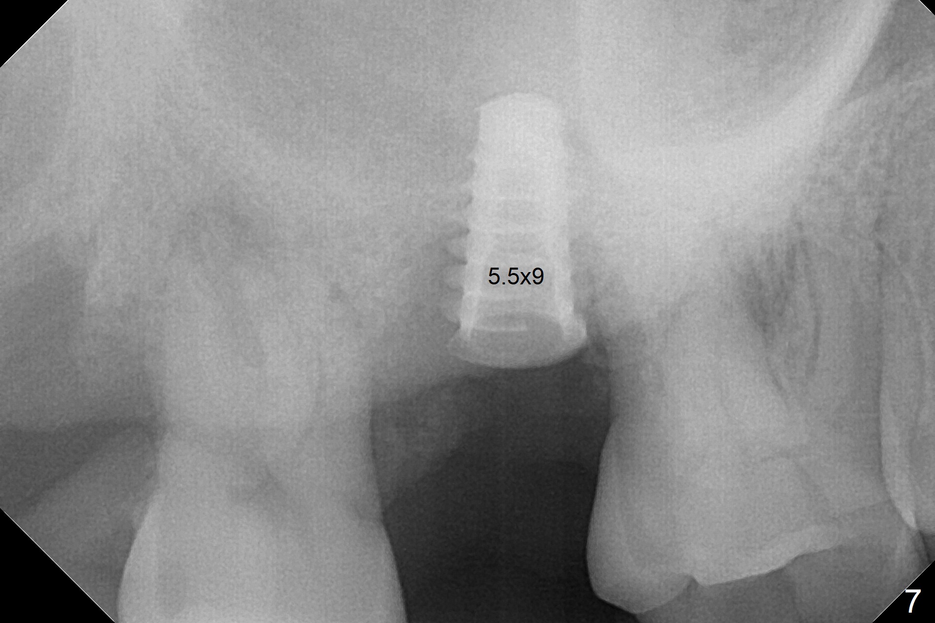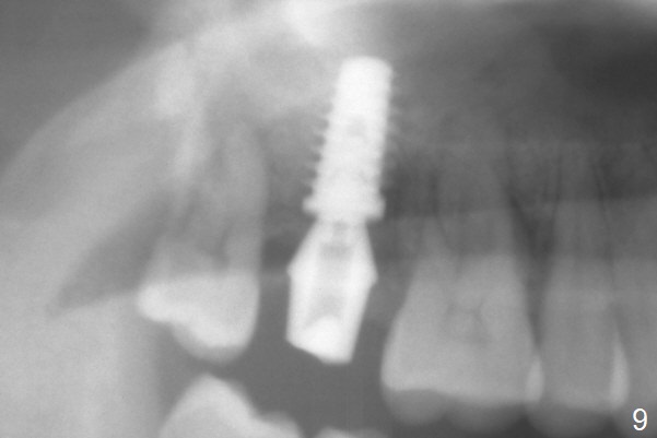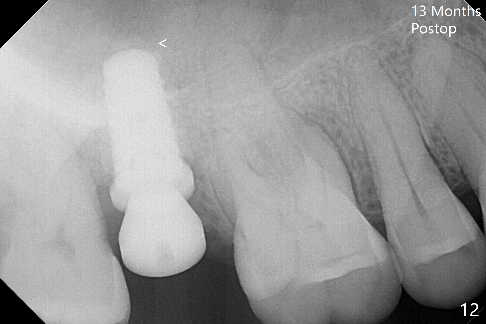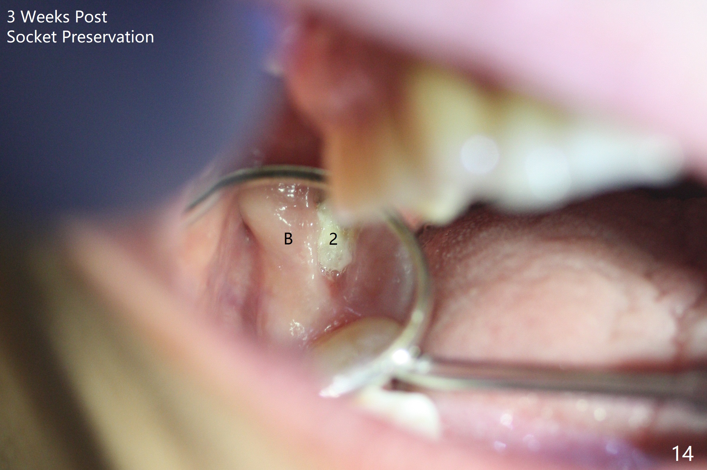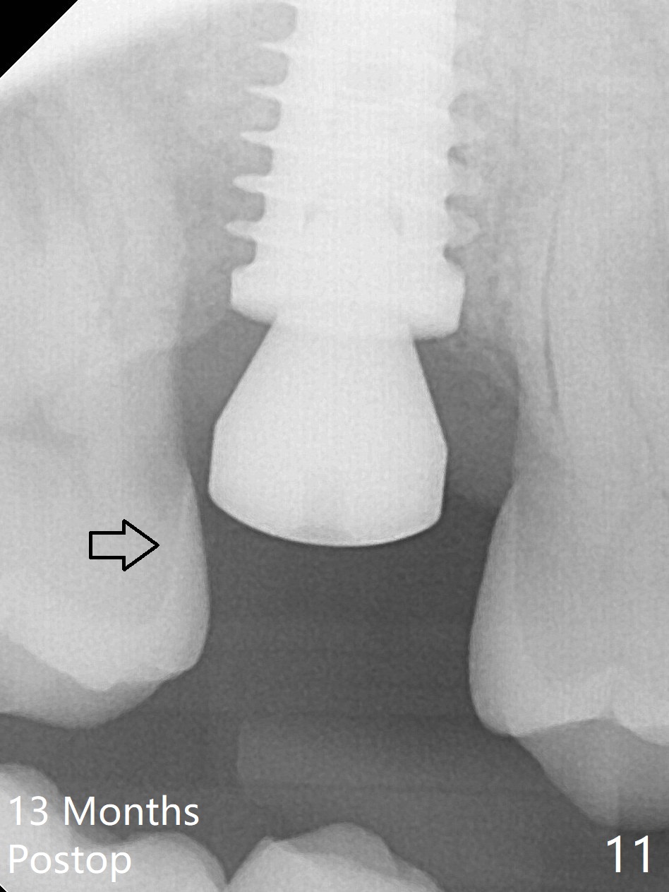 When the 59-year-old man returns for #24 implant placement, the tooth #2 is found to have crack (Fig.1,2 arrowheads), associated with buccal and palatal fistulae (*) and loss of amalgam (Fig.4 *). Abundant granulation tissue is attached to the roots of the affected tooth (Fig.3), indicating severe bone loss. There is a plateau associated with the septum and buccal sockets, which is the site of osteotomy. Magic split and 3 and 3.8 mm Magic Expanders are used to initiate osteotomy. After use of 4.3 mm Magic Drill for about 3 mm, Osteogen plug and allograft are used for sinus lift, followed by insertion of a 4.5x11 mm dummy implant (Fig.5). When a 5.5x9 mm dummy implant is placed with stability, it appears to be seated cervical (Fig.6,7). When a 6x9 mm IBS implant (definitive) is placed with a 6.5x5.5(4) mm abutment, they are seated too deep for provisional (Fig.8). The implant/abutment are removed and replaced by a 6.5x11 mm one in a shallower position; after trimming the same abutment as mentioned above (Fig.9), an immediate provisional is fabricated to keep bone graft in place. Fabrication of Tap with soft tissue markers will reduce the chance of miscalculation and waste of implants. The coronal threads of the implant are covered with bone 6 months postop (Fig.10). One month later when a permanent crown tries in, the implant is found to be loose and tender. A healing abutment is placed. Six months later, the patient returns for crown retry-in. The tooth #1 seems to have shifted mesially (Fig.11 arrow). When the abutment is placed, the implant remains tender and loose. After implant removal with a wrench, there is no granulation tissue or bony defect, including the intact sinus floor (Fig.12 <). Since the tooth #1 has deep periodontal pockets and mobility, the tooth is extracted with abundant granulation tissue. After debridement, Osteogen plug is placed in the socket of #1, while Vanilla graft is placed at the site of #2 (Fig.13 *). Three weeks later, the socket of #2 heals with exposure of Osteogen plug (Fig.14 (B: buccal)).