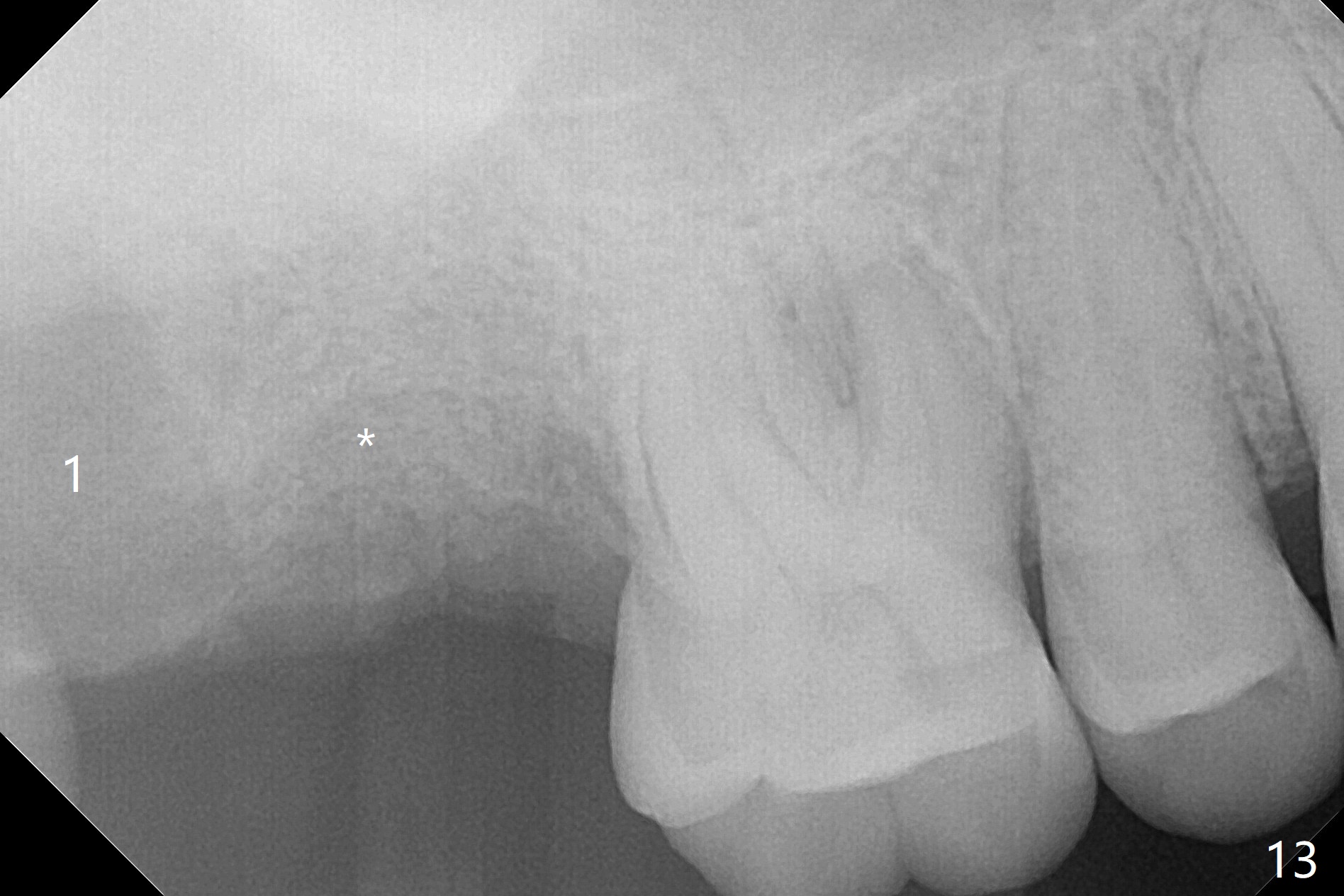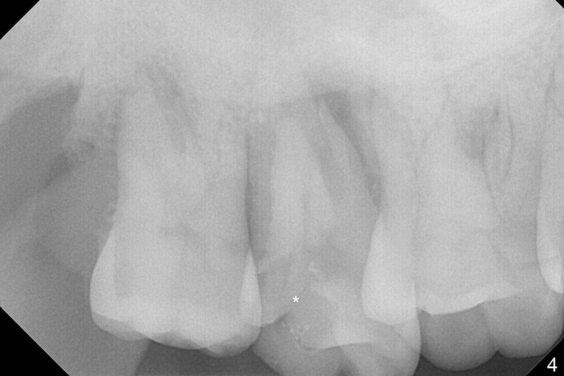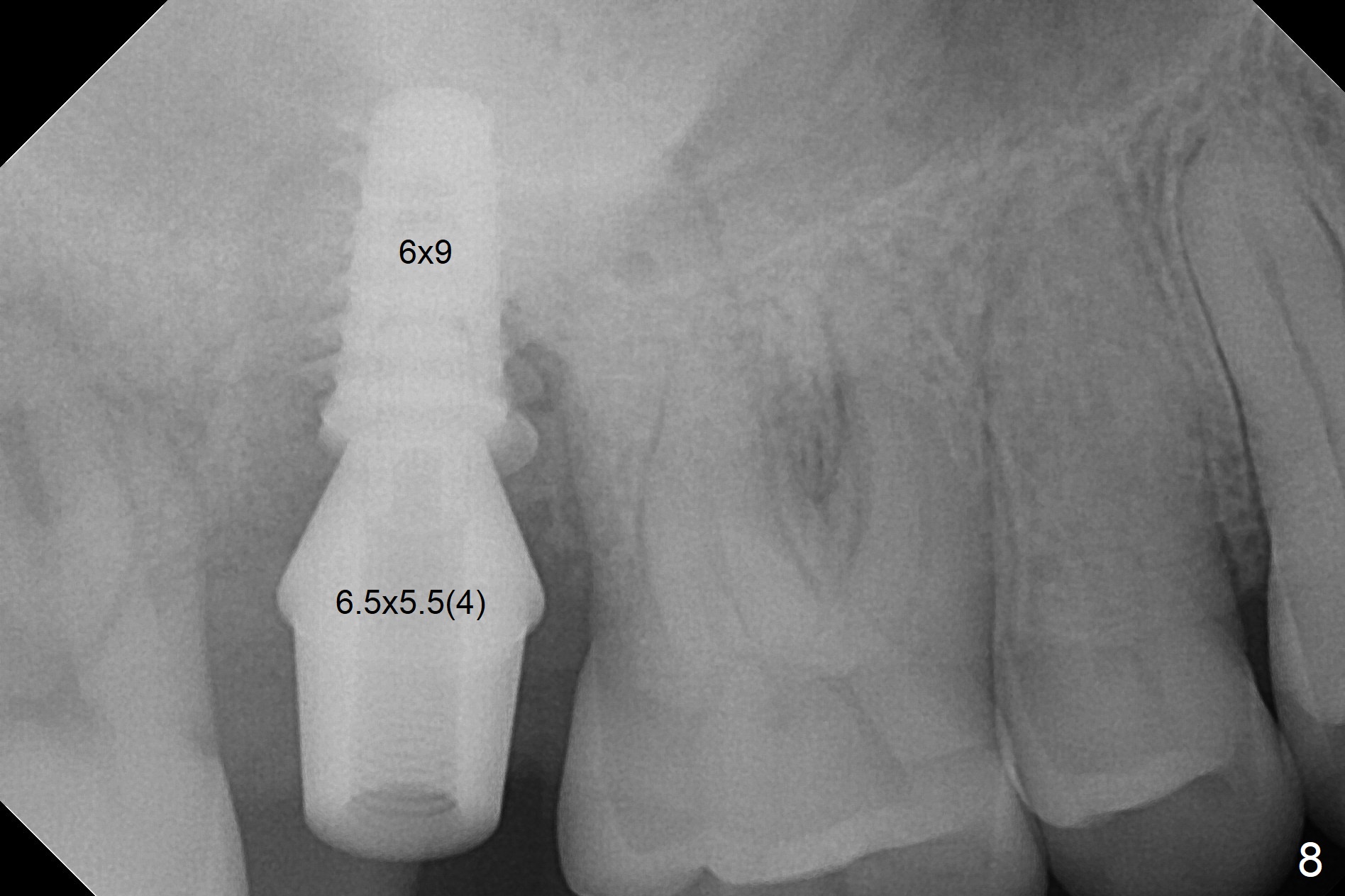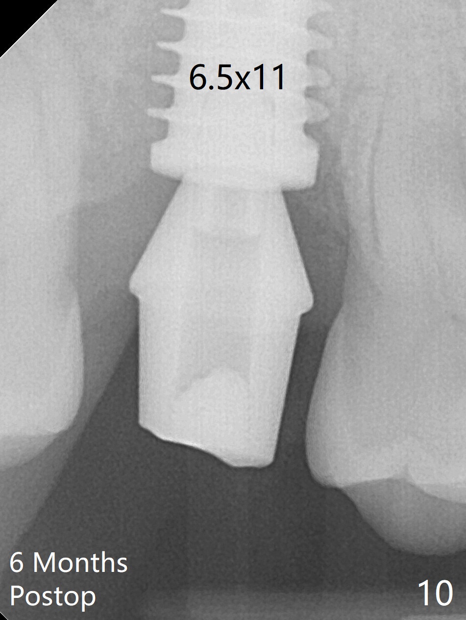 When the 59-year-old man returns for #24 implant placement, the tooth #2 is found to have crack (Fig.1,2 arrowheads), associated with buccal and palatal fistulae (*) and loss of amalgam (Fig.4 *). Abundant granulation tissue is attached to the roots of the affected tooth (Fig.3), indicating severe bone loss. There is a plateau associated with the septum and buccal sockets, which is the site of osteotomy. Magic split and 3 and 3.8 mm Magic Expanders are used to initiate osteotomy. After use of 4.3 mm Magic Drill for about 3 mm, Osteogen plug and allograft are used for sinus lift, followed by insertion of a 4.5x11 mm dummy implant (Fig.5). When a 5.5x9 mm dummy implant is placed with stability, it appears to be seated cervical (Fig.6,7). When a 6x9 mm IBS implant (definitive) is placed with a 6.5x5.5(4) mm abutment, they are seated too deep for provisional (Fig.8). The implant/abutment are removed and replaced by a 6.5x11 mm one in a shallower position; after trimming the same abutment as mentioned above (Fig.9), an immediate provisional is fabricated to keep bone graft in place. Fabrication of Tap with soft tissue markers will reduce the chance of miscalculation and waste of implants. The coronal threads of the implant are covered with bone 6 months postop (Fig.10). One month later when a permanent crown tries in, the implant is found to be loose and tender. A healing abutment is placed. Six months later, the patient returns for crown retry-in. The tooth #1 seems to have shifted mesially (Fig.11 arrow). When the abutment is placed, the implant remains tender and loose. After implant removal with a wrench, there is no granulation tissue or bony defect, including the intact sinus floor (Fig.12 <). Since the tooth #1 has deep periodontal pockets and mobility, the tooth is extracted with abundant granulation tissue. After debridement, Osteogen plug is placed in the socket of #1, while Vanilla graft is placed at the site of #2 (Fig.13 *). Three weeks later, the socket of #2 heals with exposure of Osteogen plug (Fig.14 (B: buccal)).
