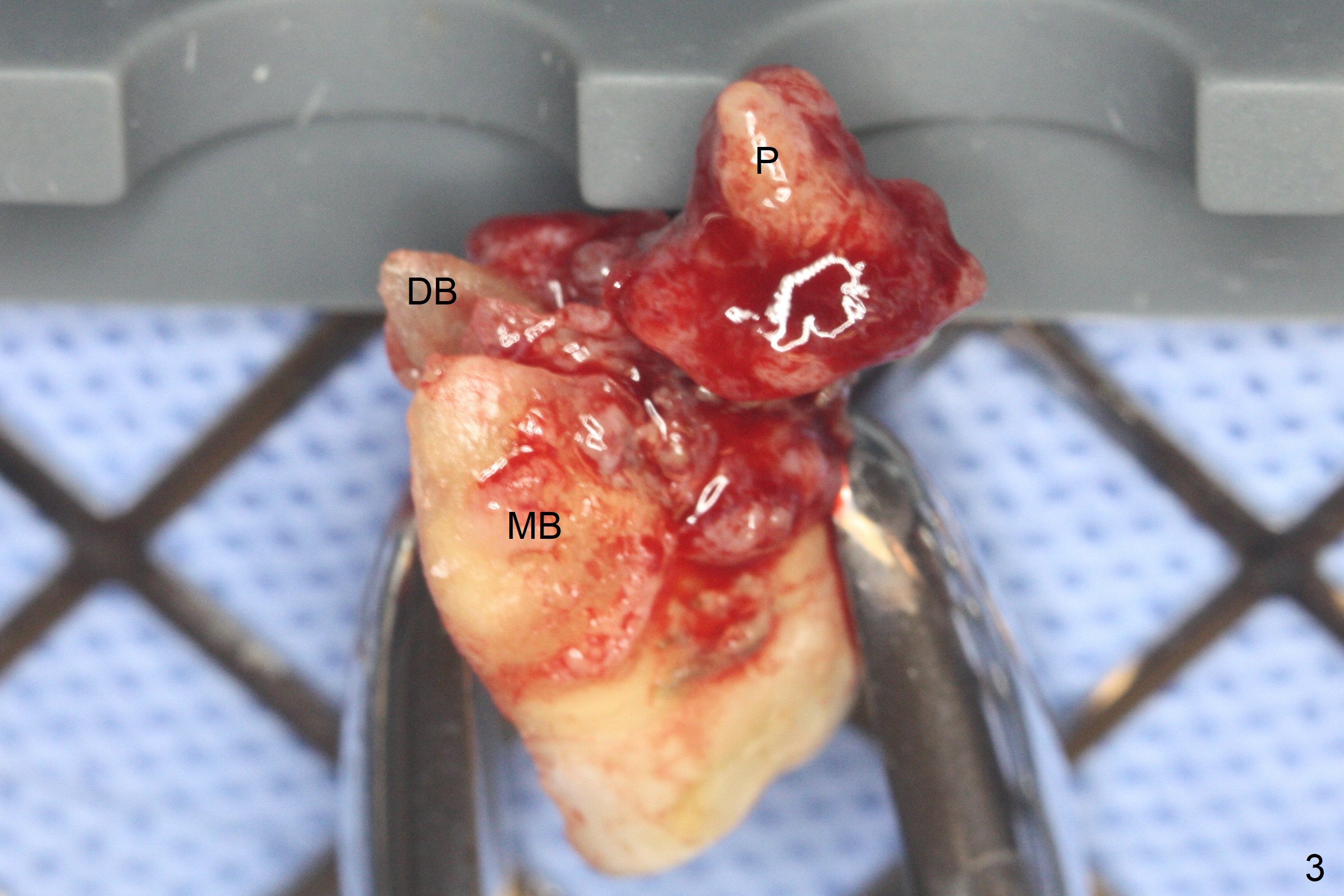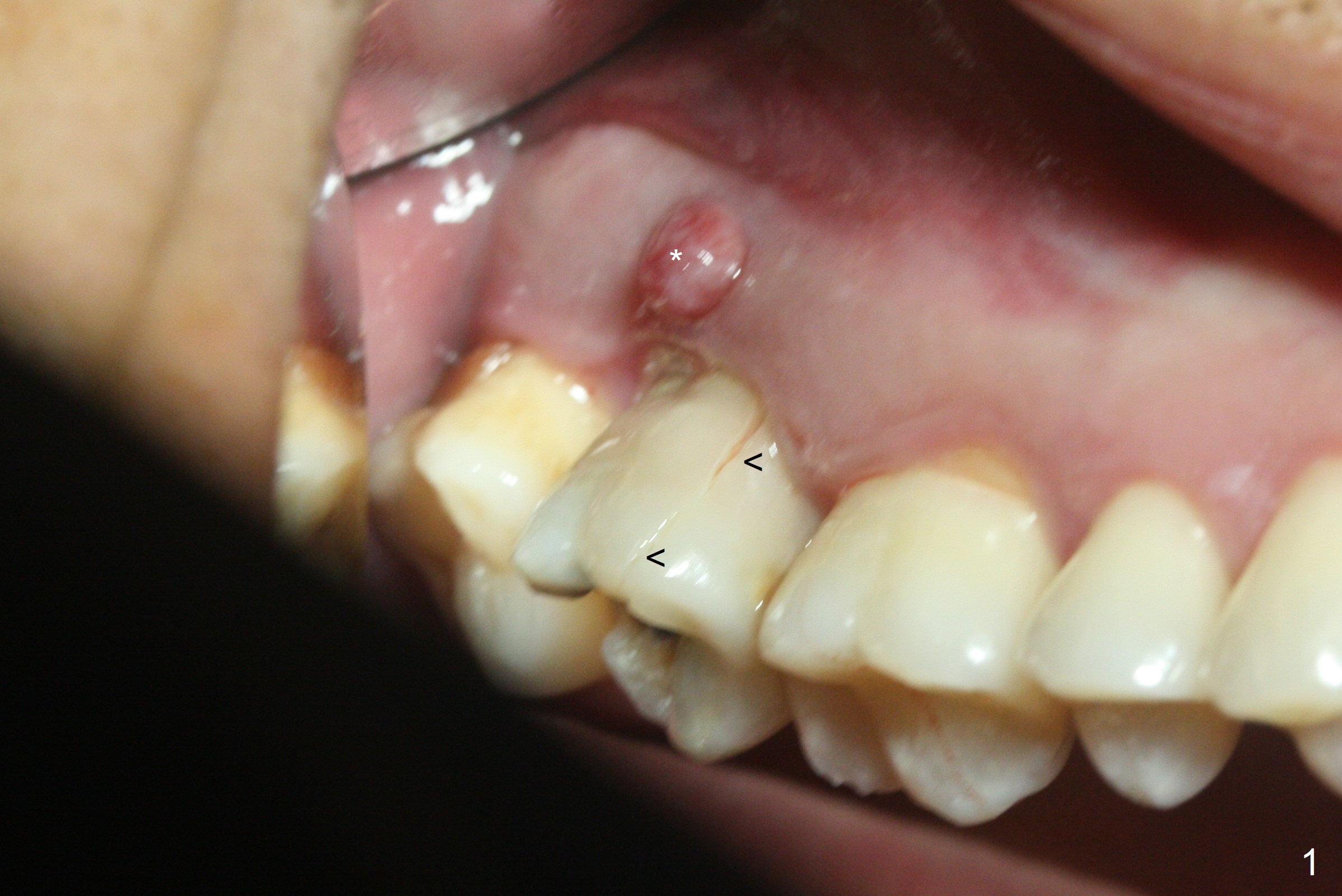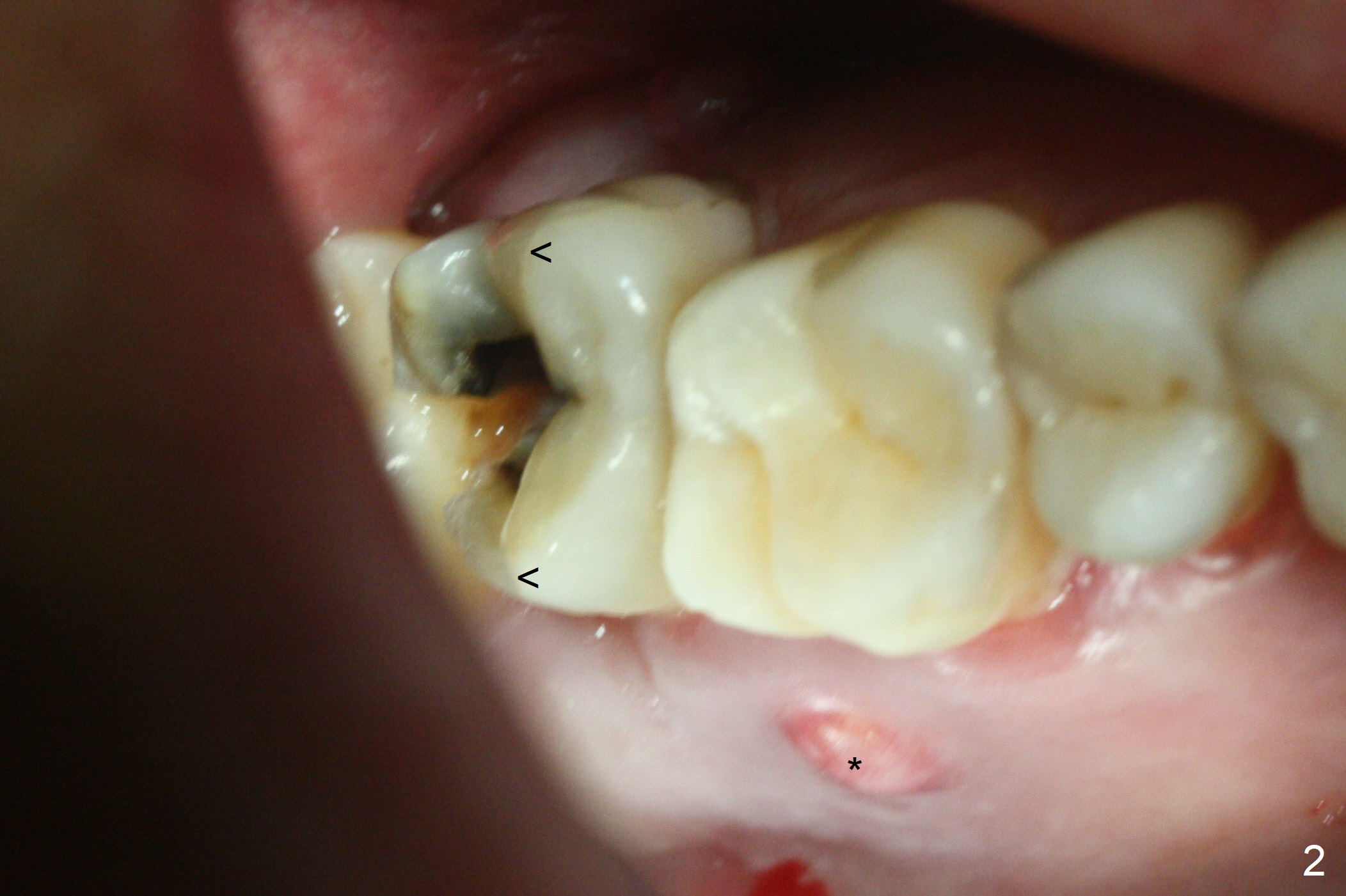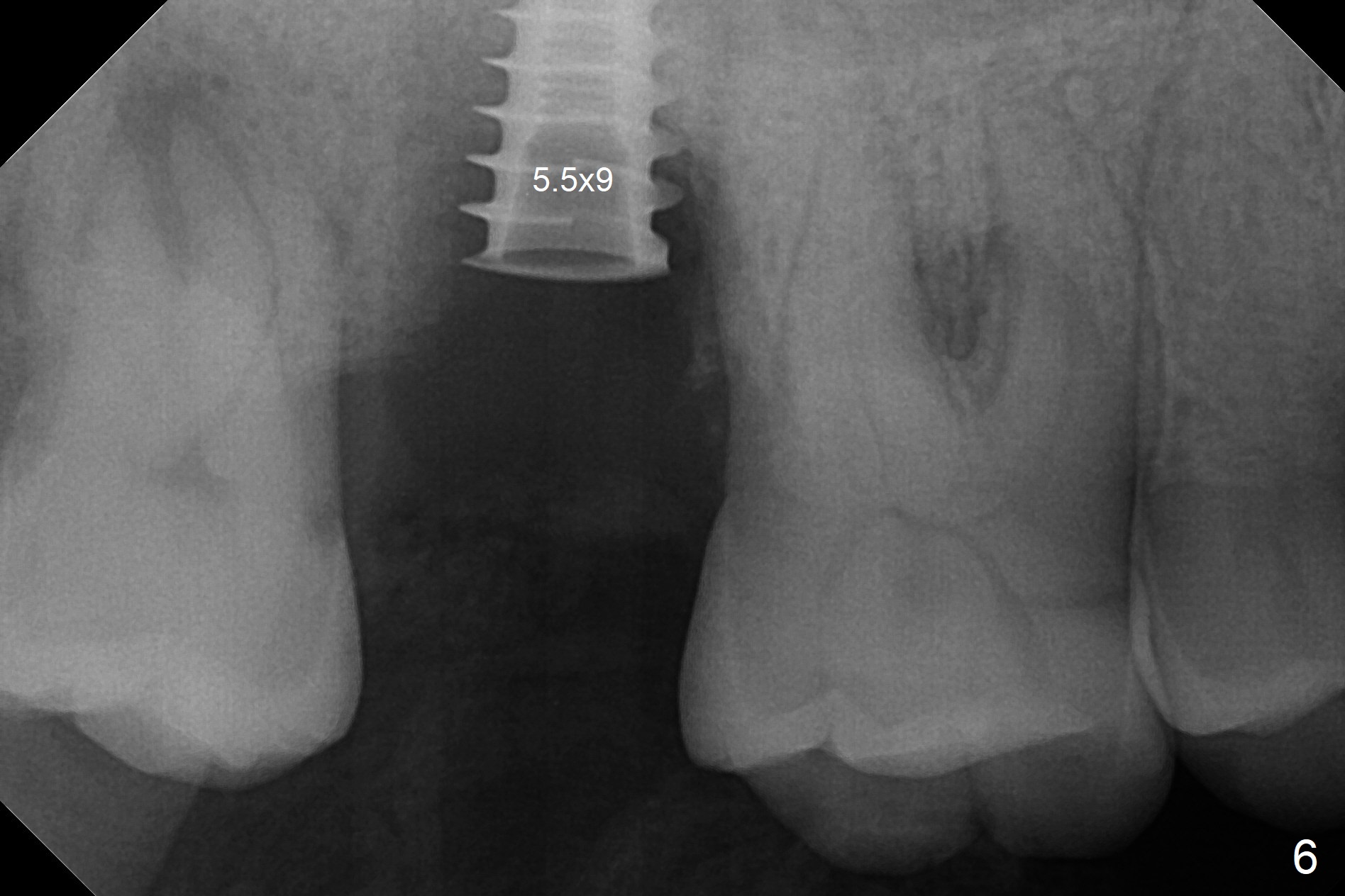 When the 59-year-old man returns for #24 implant placement, the tooth #2 is found to have crack (Fig.1,2 arrowheads), associated with buccal and palatal fistulae (*) and loss of amalgam (Fig.4 *). Abundant granulation tissue is attached to the roots of the affected tooth (Fig.3), indicating severe bone loss. There is a plateau associated with the septum and buccal sockets, which is the site of osteotomy. Magic split and 3 and 3.8 mm Magic Expanders are used to initiate osteotomy. After use of 4.3 mm Magic Drill for about 3 mm, Osteogen plug and allograft are used for sinus lift, followed by insertion of a 4.5x11 mm dummy implant (Fig.5). When a 5.5x9 mm dummy implant is placed with stability, it appears to be seated cervical (Fig.6,7). When a 6x9 mm IBS implant (definitive) is placed with a 6.5x5.5(4) mm abutment, they are seated too deep for provisional (Fig.8). The implant/abutment are removed and replaced by a 6.5x11 mm one in a shallower position; after trimming the same abutment as mentioned above (Fig.9), an immediate provisional is fabricated to keep bone graft in place. Fabrication of Tap with soft tissue markers will reduce the chance of miscalculation and waste of implants. The coronal threads of the implant are covered with bone 6 months postop (Fig.10). One month later when a permanent crown tries in, the implant is found to be loose and tender. A healing abutment is placed. Six months later, the patient returns for crown retry-in. The tooth #1 seems to have shifted mesially (Fig.11 arrow). When the abutment is placed, the implant remains tender and loose. After implant removal with a wrench, there is no granulation tissue or bony defect, including the intact sinus floor (Fig.12 <). Since the tooth #1 has deep periodontal pockets and mobility, the tooth is extracted with abundant granulation tissue. After debridement, Osteogen plug is placed in the socket of #1, while Vanilla graft is placed at the site of #2 (Fig.13 *). Three weeks later, the socket of #2 heals with exposure of Osteogen plug (Fig.14 (B: buccal)).