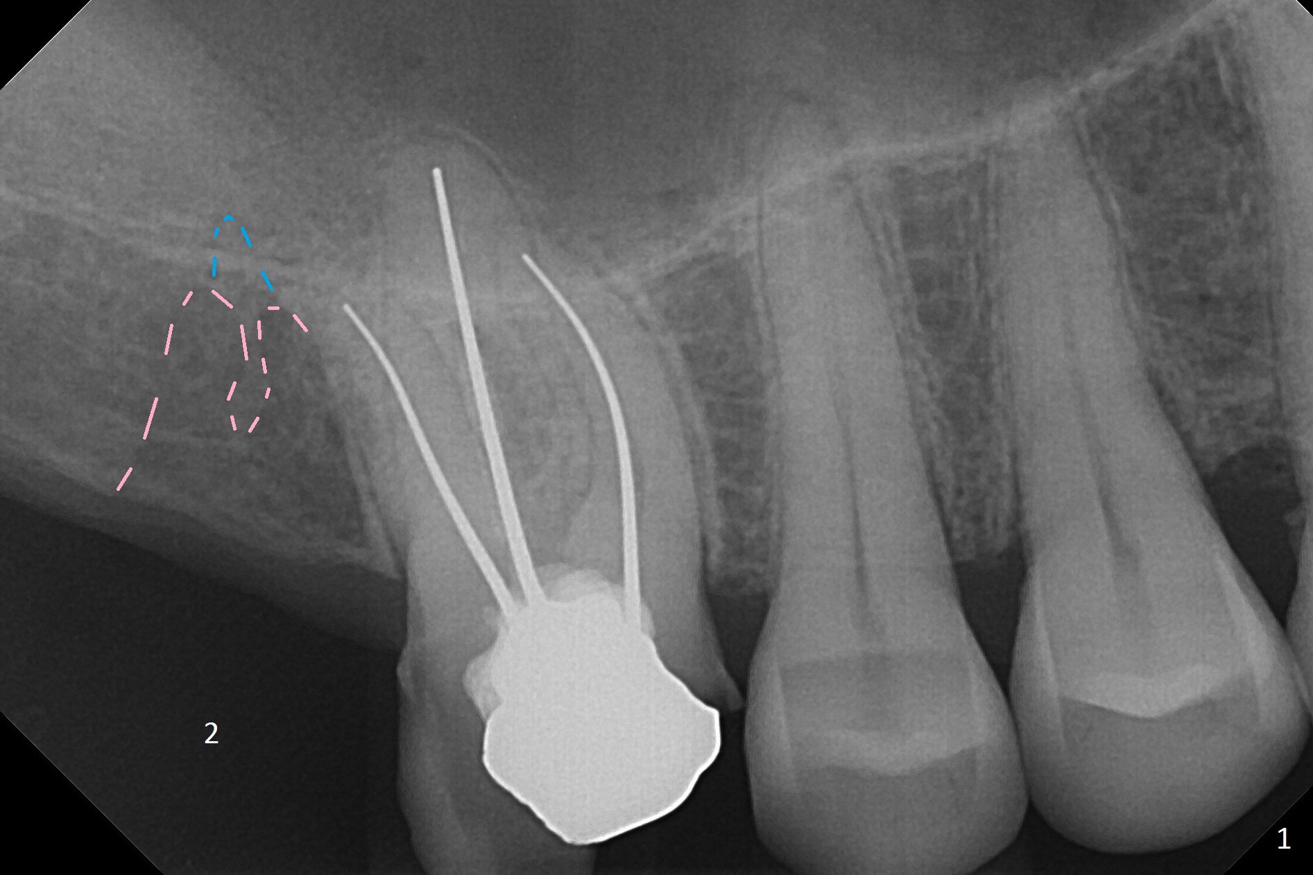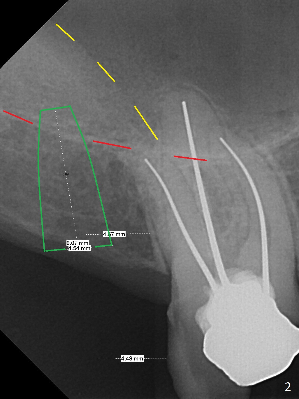 A 59-year-old man had #2 extracted approximately 4 months earlier (Fig.1 pink: possible buccal sockets; blue: palatal one). The edentulous ridge seems to be wide with exostosis (Fig.2 yellow line). Use Magic Split for access and initial bone expansion, followed by Magic expanders. The initial depth will be 7 mm to avoid sinus membrane perforation. Place PRF membranes and bone graft prior to inserting a 4 mm dummy implant. Periodontal dressing may be applied to the rugged surface of the tooth #3 for increased retention. Or a splinted provisional will be fabricated.