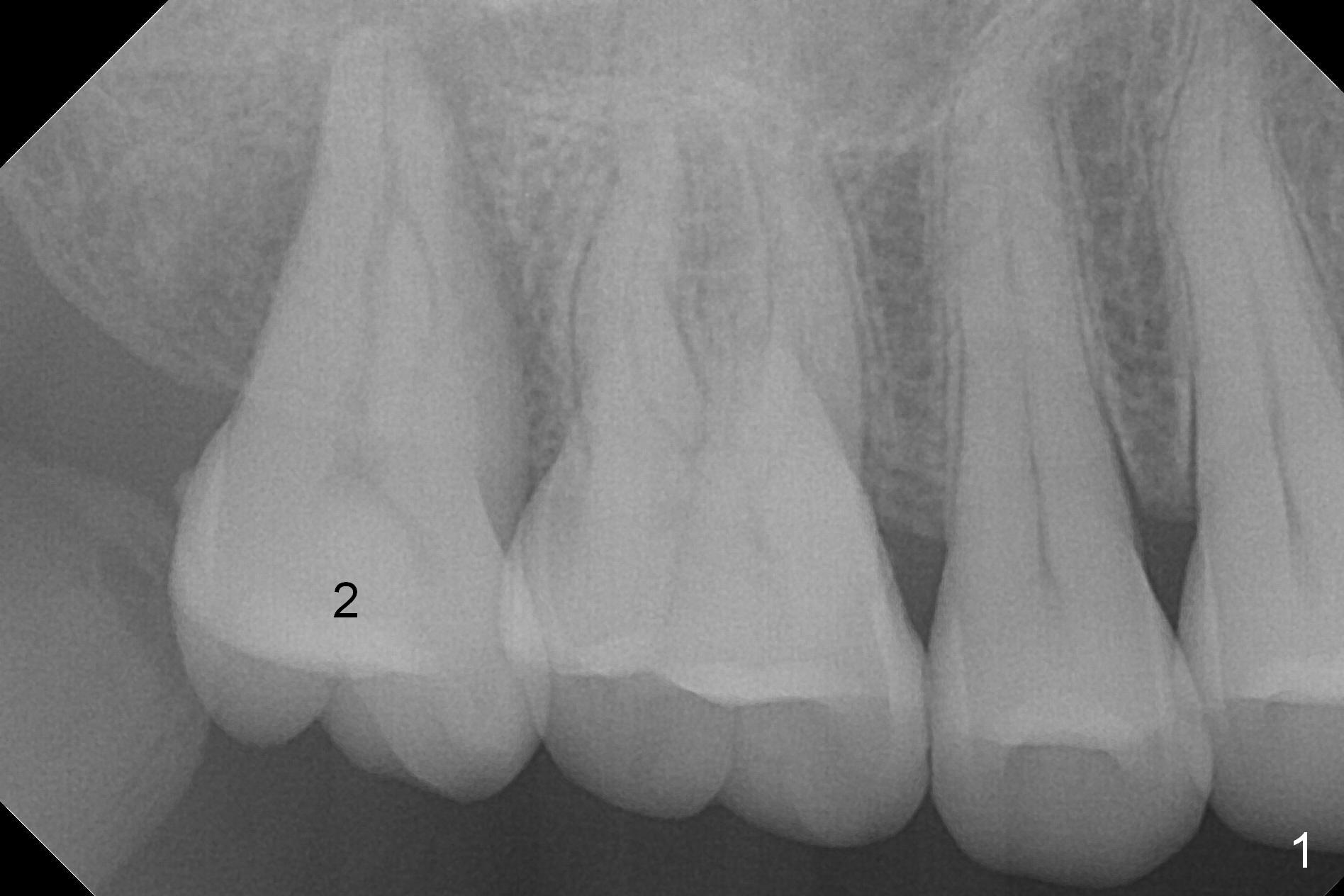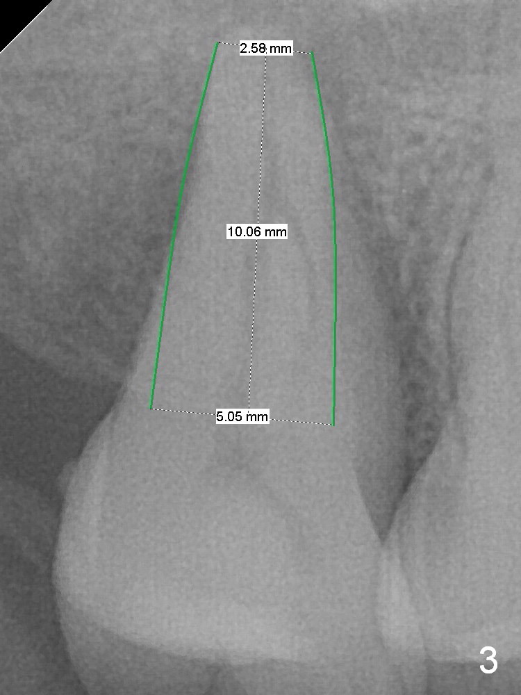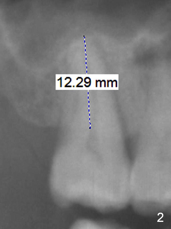 A 53-year-old man agrees implant treatment for crack tooth #2 (Fig.1). Since the apex overlaps the sinus floor (Fig.2 panoramic X-ray), the primary stability will be derived from tight contact of an implant with the socket. After extraction (Metronidazole), osteotomes are going to be used to break through the sinus floor (RT2-4), followed by tap drills (4.5 mm or larger (Fig.3) until achieving 35 Ncm). The implant will be one size larger. Prepare regular and extra wide surgical kits. Before implant placement, insert PRF plug and allograft/Osteogen.