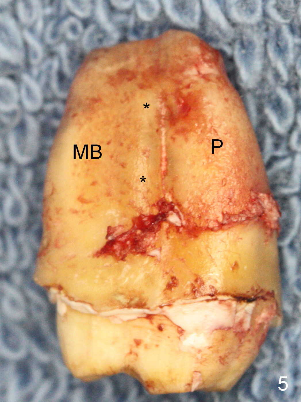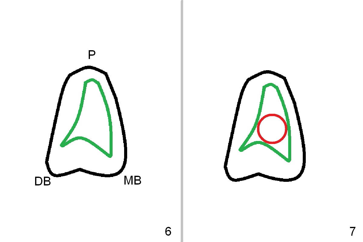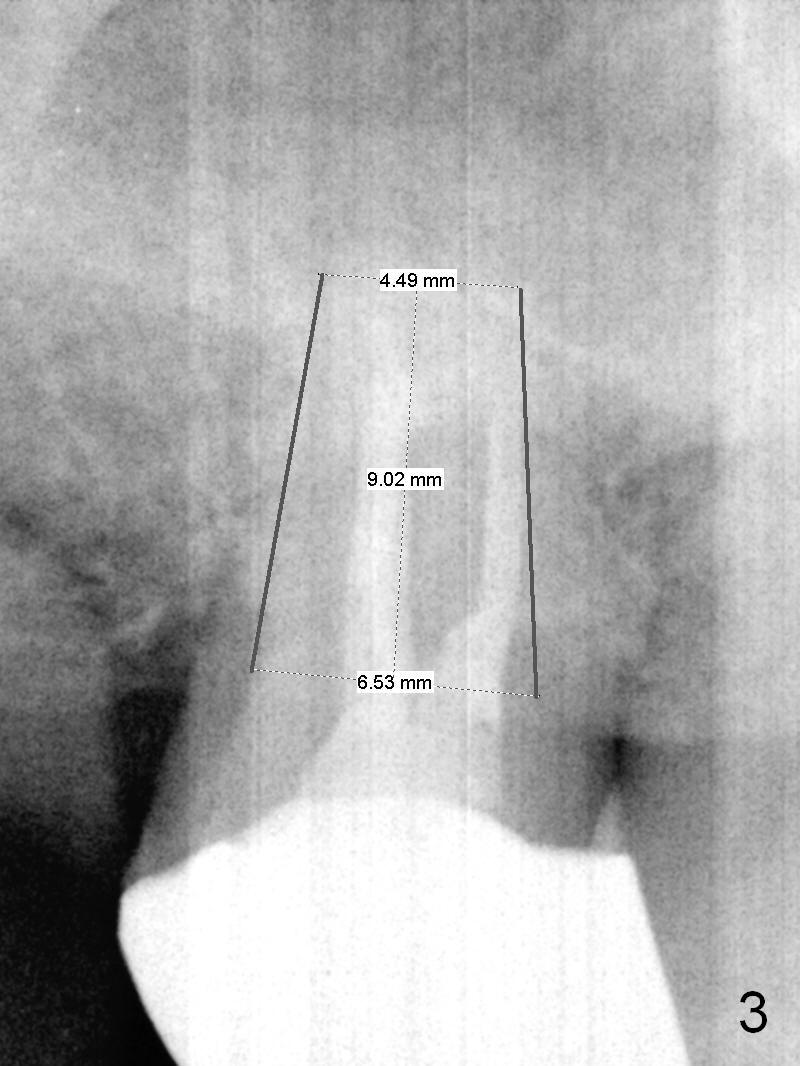 A 52-year-old man has had mild cold sensitivity for the last 3 years since RCT was done at the tooth #2 (3 canals, MB2 not found, Fig.1 (preop), 2 (taken today, pain more severe)). After discussion of treatment options (including RCT retreat), the patient chooses extraction and implant. The planned implant is 6.5x9 mm (Fig.3). As expected, the 3 roots are fused (Fig.4). The socket is single and triangular (Fig.6 green outline (black one: gingival margin)). What is not really expected is the presence of the possible MB2 canal (Fig.5 *). The mesiodistal width of the buccal roots and palatal one are 6.5 and 4.5 mm, respectively. The diameter of the planned immediate implant is estimated to be 5 mm. The socket depth is 11 and 13 mm to the crest and the gingiva, respectively. After use of Magic Expanders (ME) from 3.0-4.3 mm for sinus lift, a 5x11 mm dummy implant is placed. The implant (Fig.7 red circle) has 3 pointed contact so it is stable, but it is placed apically (Fig.8). After removal of the dummy implant, allograft is placed (.5-1.5 mm) before insertion of a 5.5x11 mm implant with satisfactory stability (Fig.9). Postop, the patient reports light bloody nasal discharge with bone graft. Ideally with the narrow mesiodistal socket, it is unnecessary to penetrate the sinus floor with ME. A 5x9 mm dummy implant should have been placed with well-controlled implant placement depth. It is followed by inserting an implant .5 mm larger for the maxilla. IBS implants are easy to achieve primary stability. Insertion torque of 20 Ncm is sufficient to load abutment (5x4(4) mm) and immediate nonfunctional provisional.