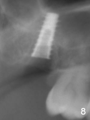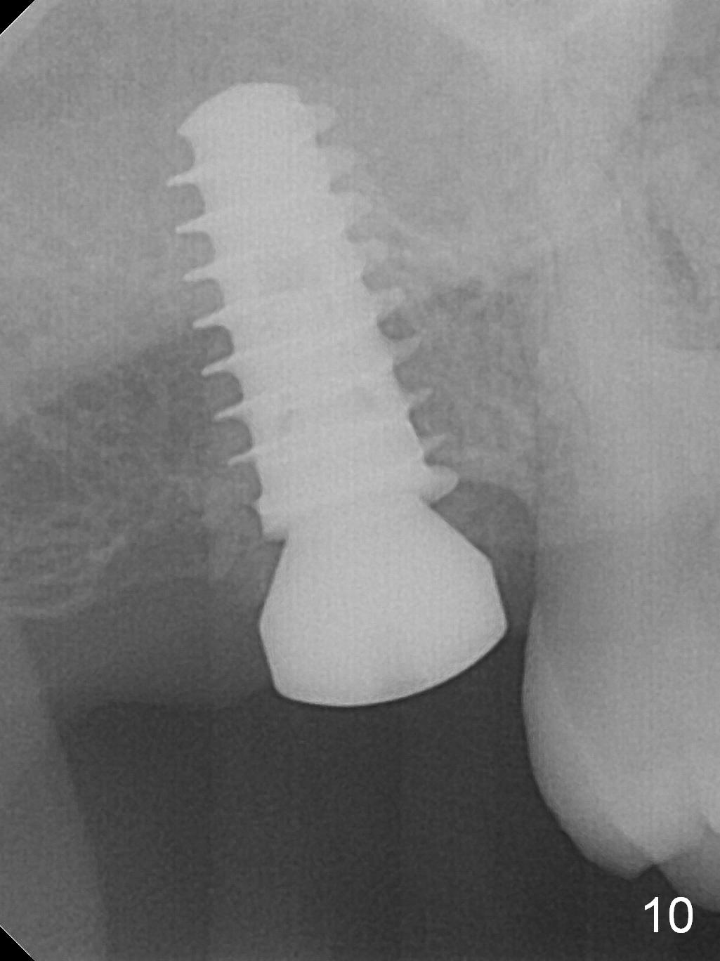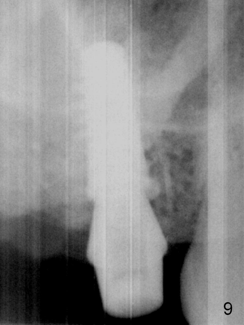 Five months post op, the healing abutment has mobility with light tenderness. The space between the bone and implant is larger than normal (Fig.10).