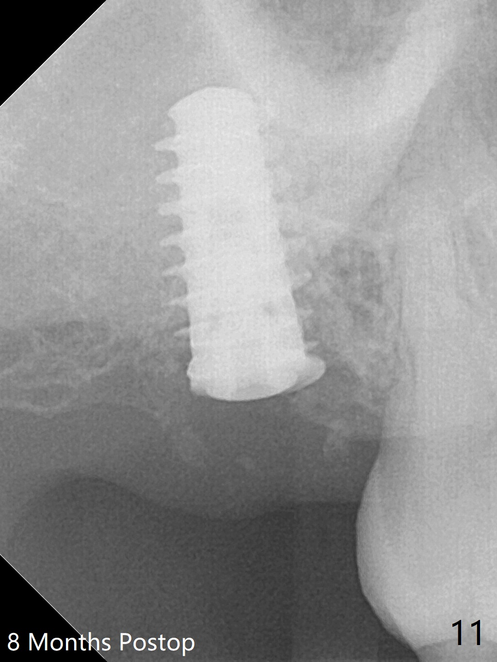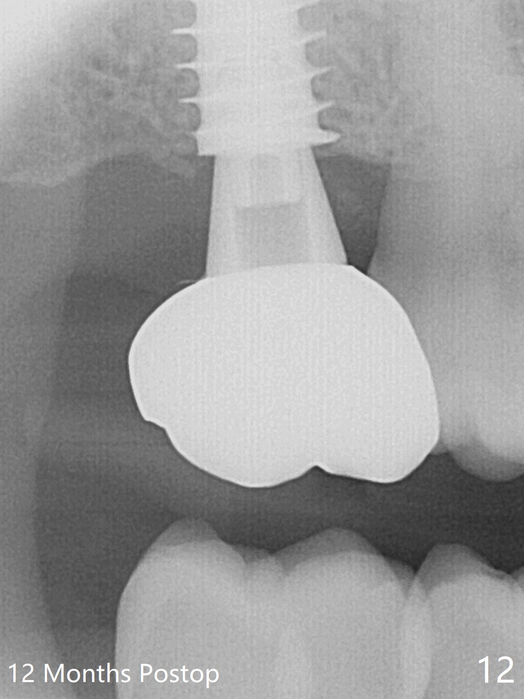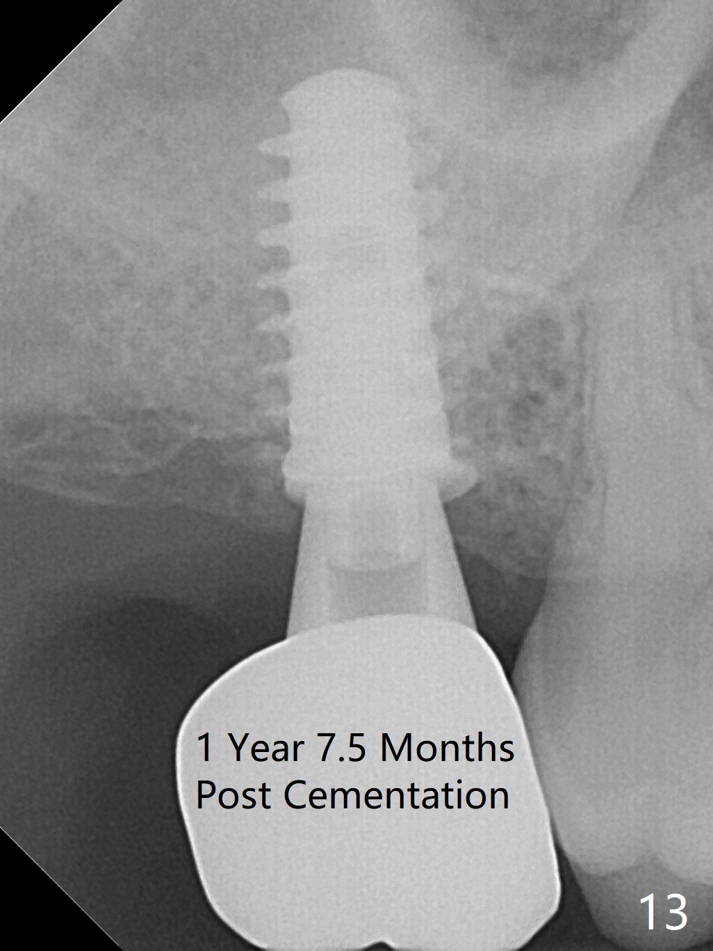The implant is stable with the healing abutment 8 months postop (Fig.11). There is definitive sign of osteointegration 12 months postop (3 months post cementation, Fig.12). The patient is pleased to have the implant for 1 year 7.5 months post cementation (Fig.13).