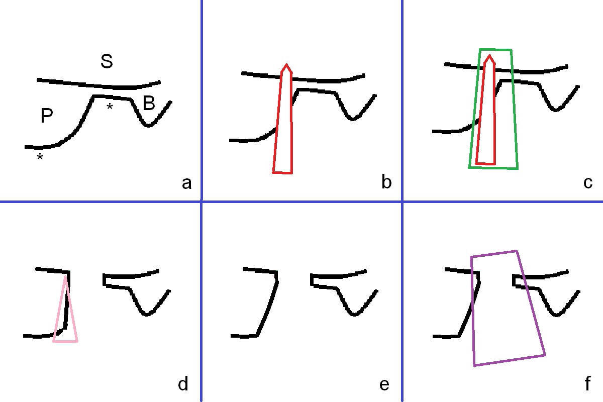 The tooth #2 is found fractured at extraction. The fused buccal (B) socket is deeper than the palatal (P) one (Fig. A * (S: sinus)); the buccal wall is low. The osteotomy is initiated in the buccal slope of the septum with Magic Expanders (3-4.8 mm, Fig. B (red)), followed by Tatum tapered tap drills (4.5-7 mm, Fig. C (green); Fig.1 (5 mm)). As the diameter of the tap drills increases, the osteotomy is shifting buccally, while larger taps are apparently losing stability. Lindamann bur is used to remove the palatal bone (Fig. D (pink) and move the osteotomy palatally (Fig. E). Because of bone height discrepancy, a 7x14 mm tissue-level implant tilts slightly buccally in the coronal end (Fig. F; Fig.2). Insertion torque is between 35 and 40 Ncm. A piece of PRF membrane and allograft is placed into the sinus prior to implantation. Following 6x3 mm abutment placement, more of allograft/Osteogen is placed in the remaining buccal and palatal sockets. A simplified provisional is applied around the implant/abutment for bone graft and collagen membrane retention.