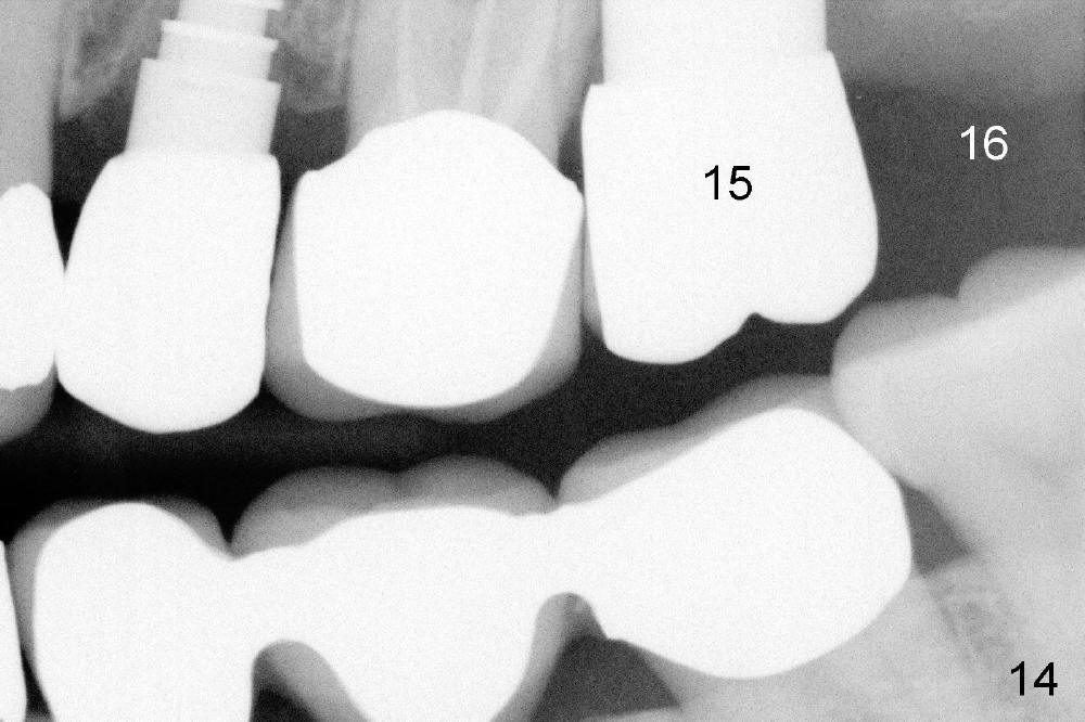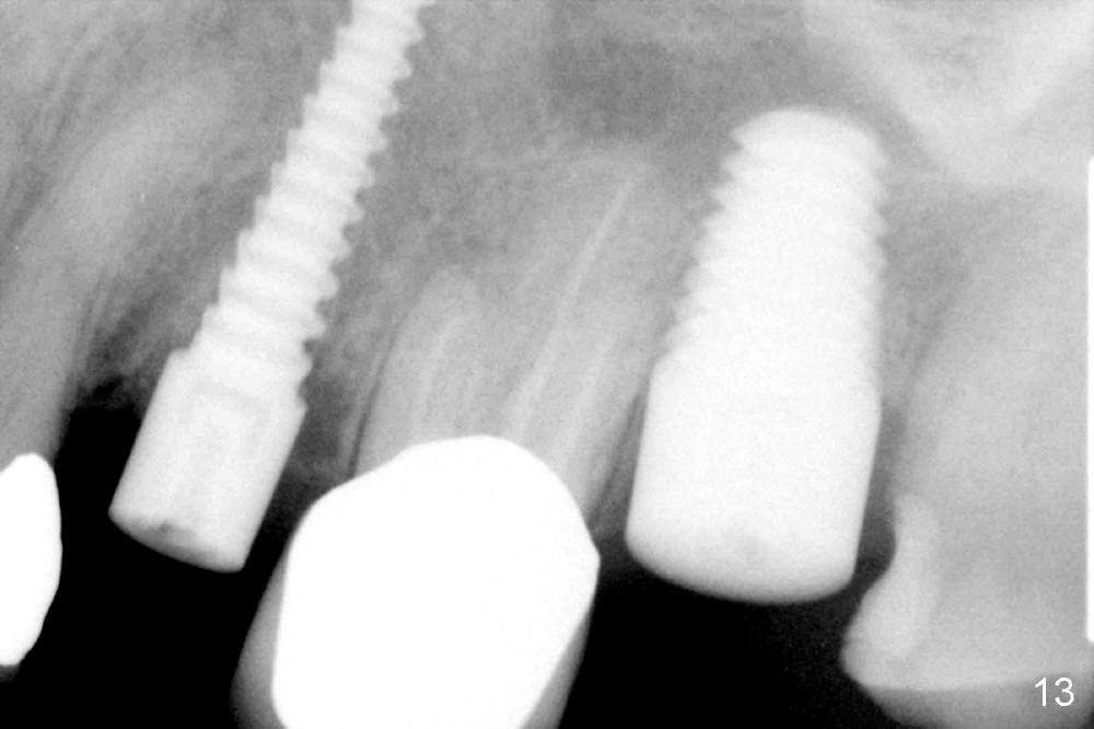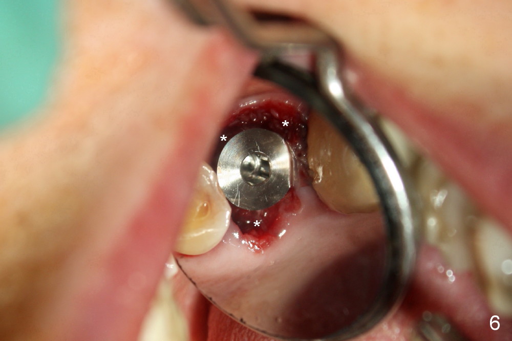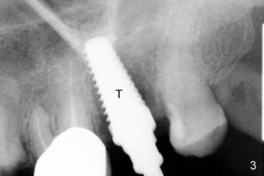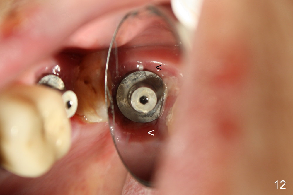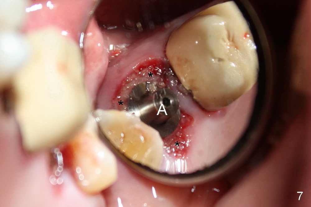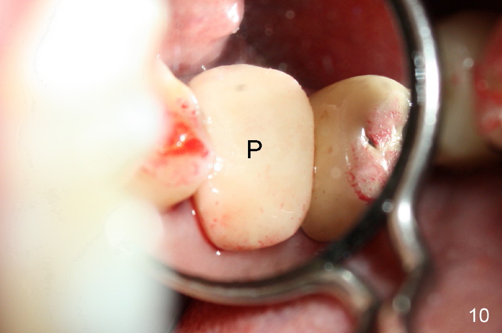 A 66-year-old lady requests restoring a broken tooth (Fig.1). Osteotomy is initiated in a thin septum (Fig.2 (occlusal mirror view) S) by sectioning, drilling and tapping (Fig.3 T). When 7x17 mm tap is removed, the osteotomy is found to form basically in the middle of socket (Fig.4 O). The apical portion of three sockets (Fig.5: MB, P and DB (not labeled) is packed with mixture of autogenous bone and allograft. When a 7x14 mm implant is placed, there are buccal and lingual gaps (Fig.6 *). The latter are bone grafted again (Fig.8 *) and require a coverage. After placement of a 4x3 mm abutment (Fig.7,8 A), an immediate provisional is fabricated (Fig.9 tissue surface view) to cover the remaining sockets (Fig.10 (occlusal mirror view), 11 (buccal view)). The provisional is infra-occlusal, i.e., load-free (Fig.11). The buccal and lingual aspects of the socket are covered by fresh epithelium 8 days postop (Fig.12 <). The implant appears to have osteointegrated 4 months postop (Fig.13). The tooth #16 appears to have shifted mesially. It is difficult to prepare for #15 crown. Luckily the patient agrees to have it extracted because of persistent sensitivity after MO composite. The definitive crown at the site of #15 is cemented 6 months postop (Fig.14).