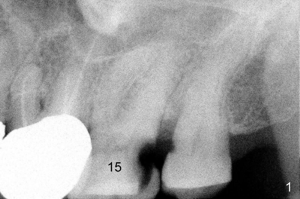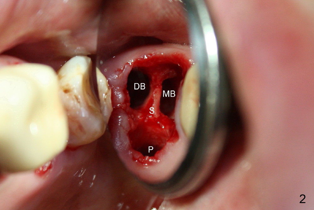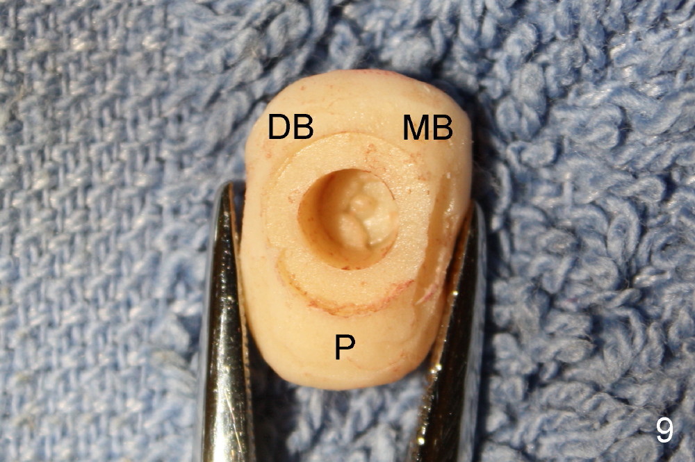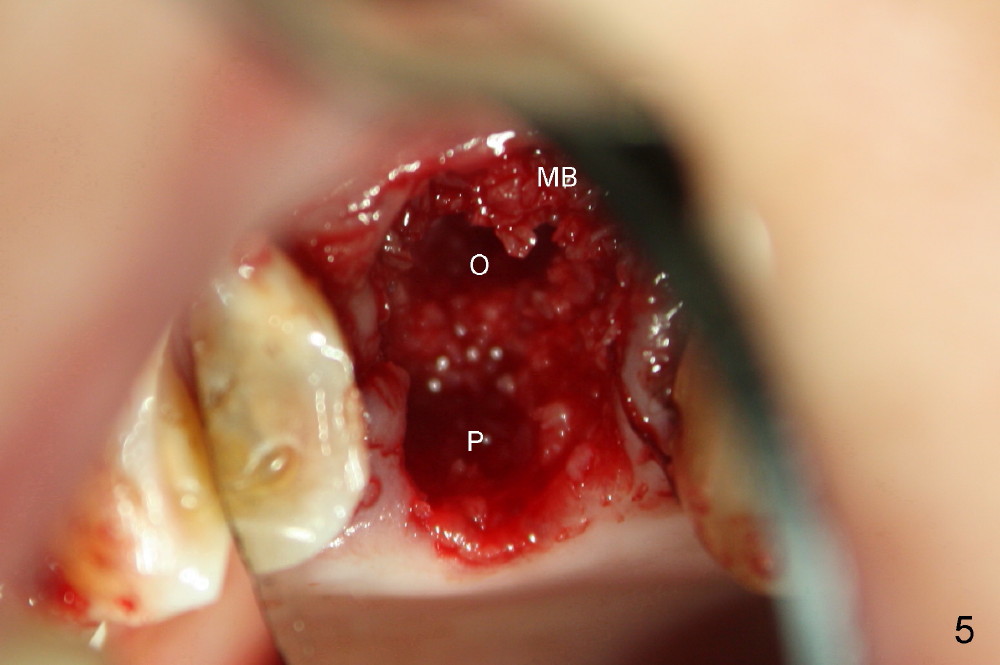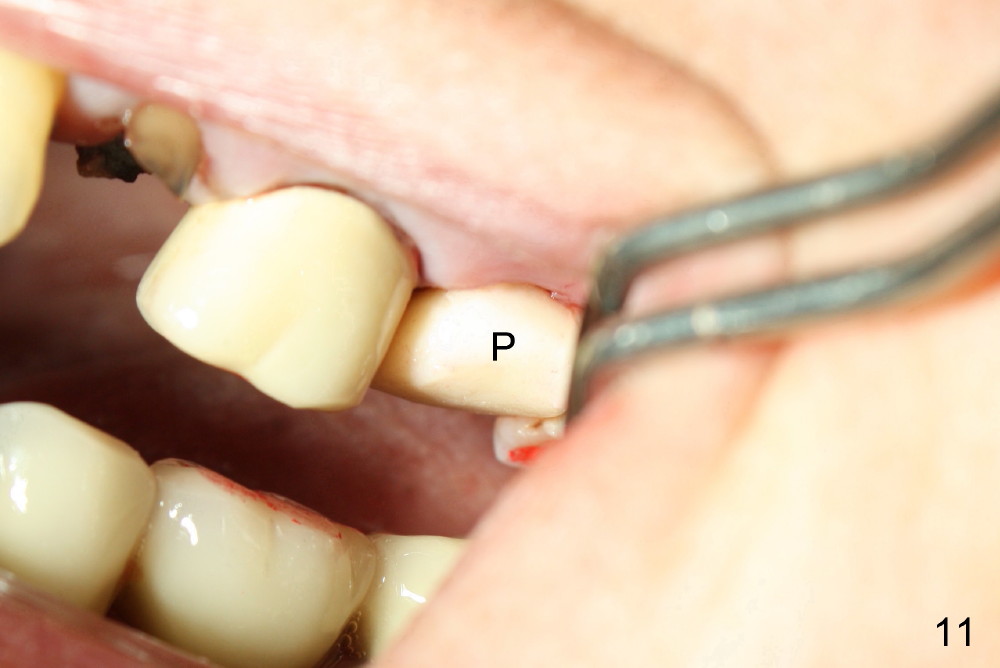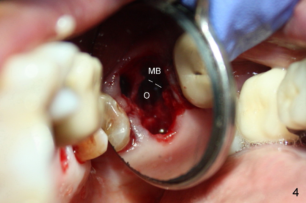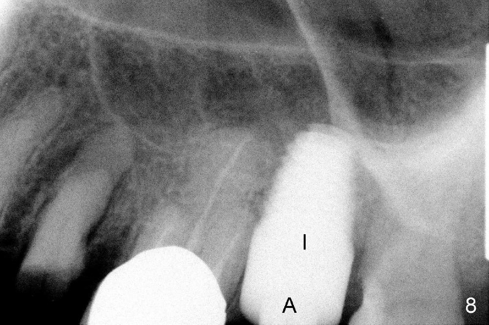 A 66-year-old lady requests restoring a broken tooth (Fig.1). Osteotomy is initiated in a thin septum (Fig.2 (occlusal mirror view) S) by sectioning, drilling and tapping (Fig.3 T). When 7x17 mm tap is removed, the osteotomy is found to form basically in the middle of socket (Fig.4 O). The apical portion of three sockets (Fig.5: MB, P and DB (not labeled) is packed with mixture of autogenous bone and allograft. When a 7x14 mm implant is placed, there are buccal and lingual gaps (Fig.6 *). The latter are bone grafted again (Fig.8 *) and require a coverage. After placement of a 4x3 mm abutment (Fig.7,8 A), an immediate provisional is fabricated (Fig.9 tissue surface view) to cover the remaining sockets (Fig.10 (occlusal mirror view), 11 (buccal view)). The provisional is infra-occlusal, i.e., load-free (Fig.11). The buccal and lingual aspects of the socket are covered by fresh epithelium 8 days postop (Fig.12 <). The implant appears to have osteointegrated 4 months postop (Fig.13). The tooth #16 appears to have shifted mesially. It is difficult to prepare for #15 crown. Luckily the patient agrees to have it extracted because of persistent sensitivity after MO composite. The definitive crown at the site of #15 is cemented 6 months postop (Fig.14).