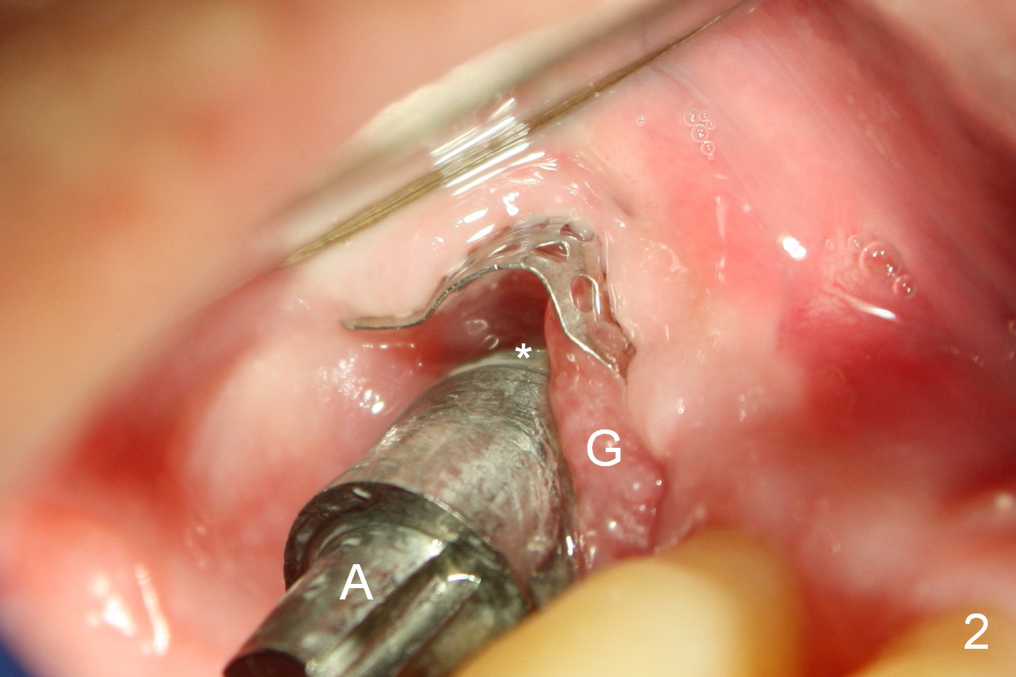 When he returns 1 month postop, the Titanium mesh is exposed asymptomatically (Fig.2). The implant threads appear not to be exposed. When to remove the mesh? A: abutment, which is removed before discharge of the patient. G: granulation tissue; *: possible the rough (R) surface of the implant (S: smooth surface).