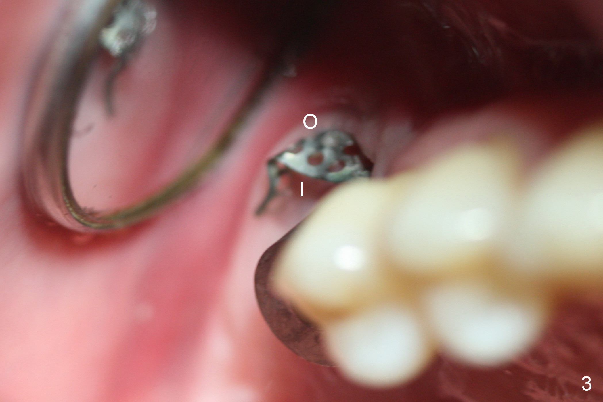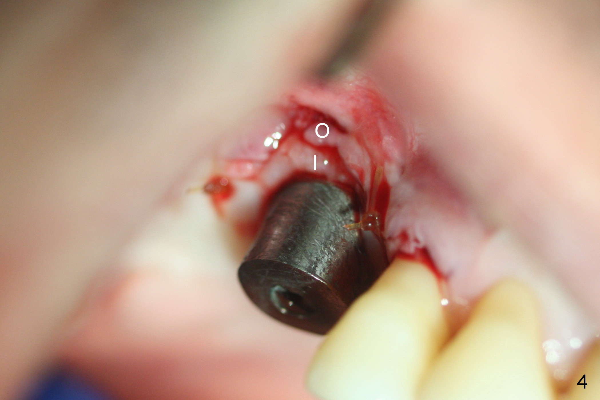 Three months post 2nd bone graft, the gingiva inside the Titanium mesh (used to be granulation tissue 1 month postop (Fig.2)) turns (Fig.3 I) as mature as the outside portion (O). When the mesh is removed, there is no thread exposure. The inner and outer portions of the gingiva are sutured later (Fig.4). The implant is restored immediately. It appears that Titanium mesh exposure is not a severe complication. If asymptomatic, leave the gingiva to heal by itself. Use small size of the mesh and release of soft tissue as much as possible may reduce the chance of mesh exposure.