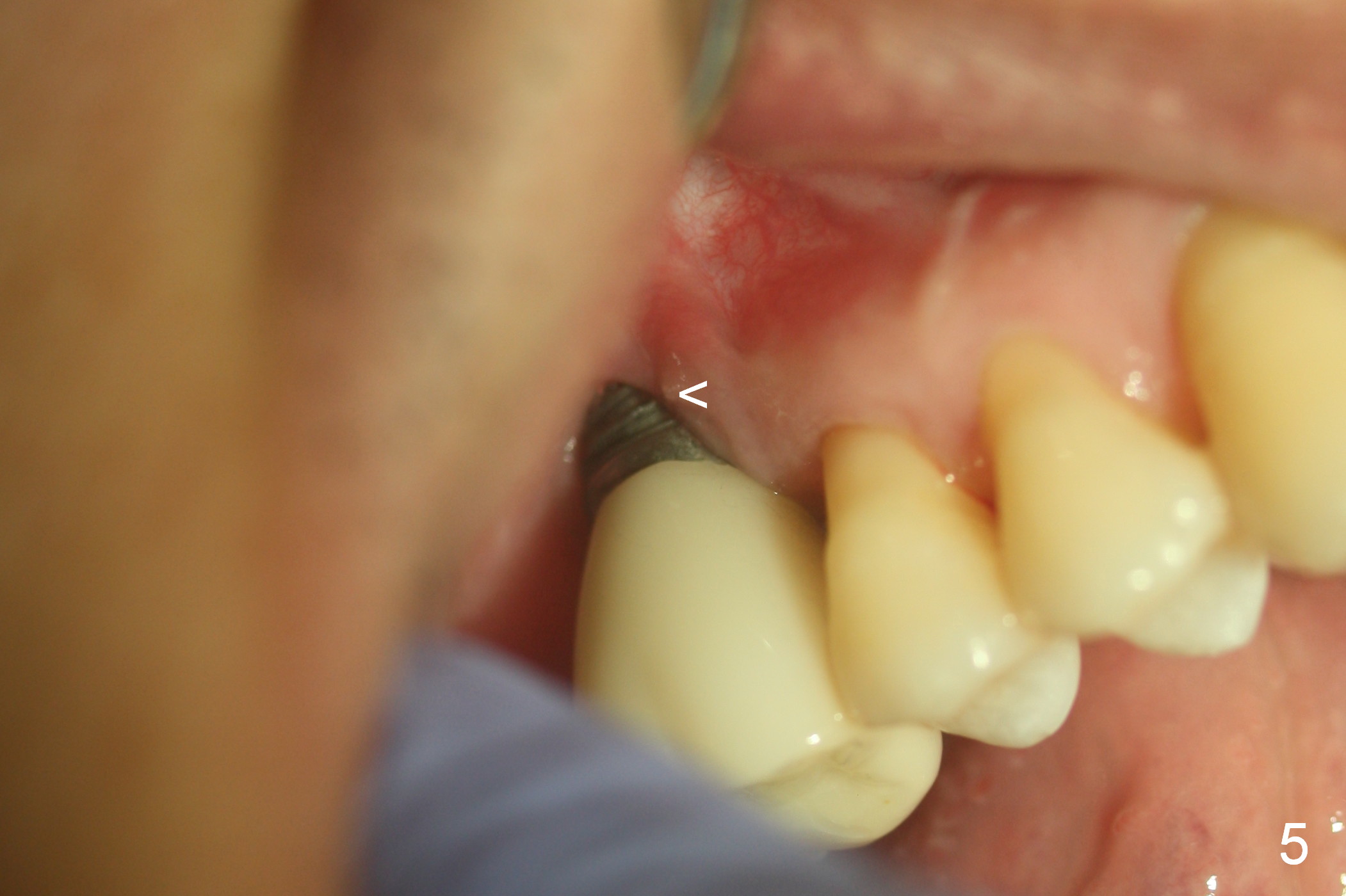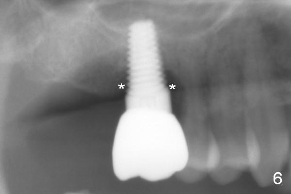 The patient returns asymptomatic for follow up 1 year post cementation. In fact the buccal threads are exposed without infection (Fig.5 <). There remains bone loss around the most coronal threads (Fig.6 *). Water pik is recommended.