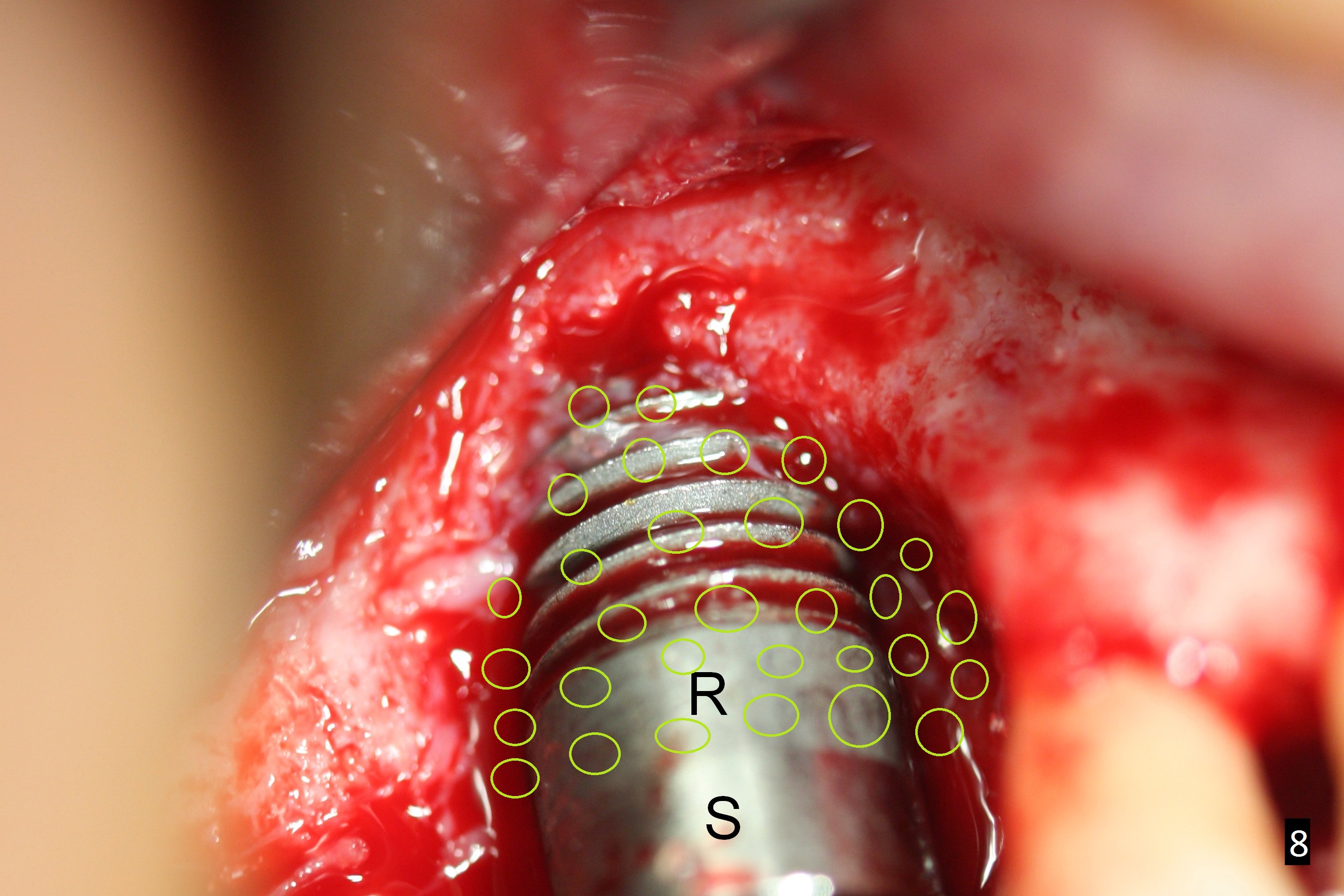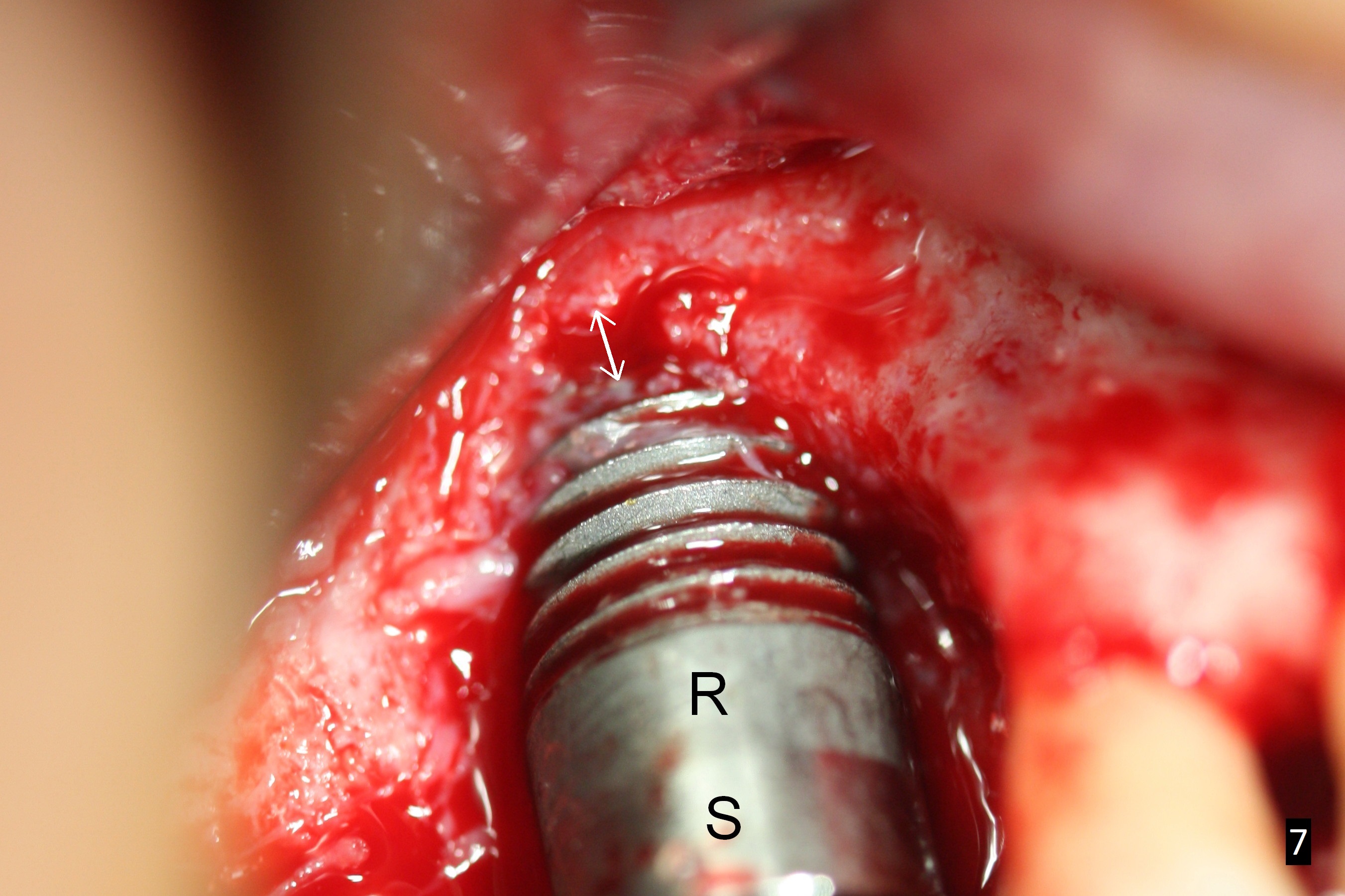 To prevent thread exposure complication, the implant should have at least 1-2 mm buccal clearance (gap (Fig.7 double arrows)). Place a relatively smaller implant (~6 mm) as palatal as possible. Pack bone graft in the remaining gap solidly (covering implant threads buccally and interproximally, Fig.8 (green circles)).