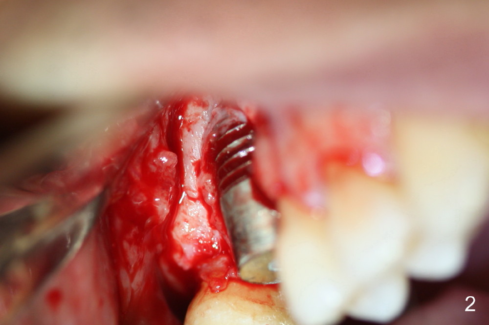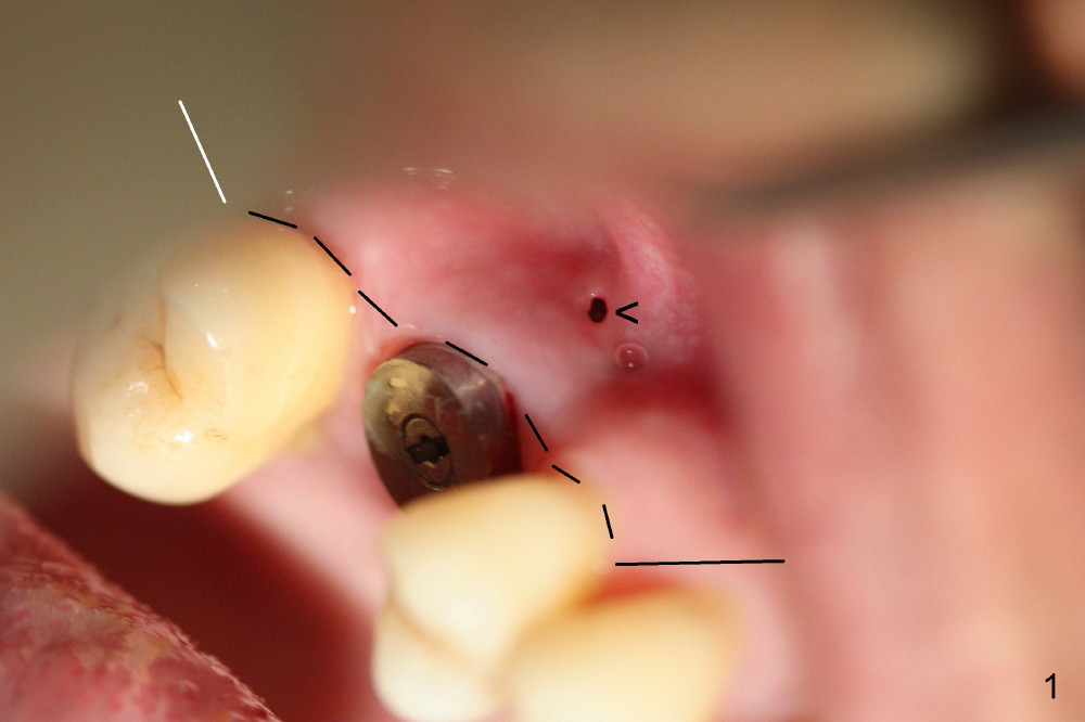 A fistula forms 3 months postop, buccal to the implant at the site of #3 (Fig.1 <). There are 2 possible reasons. First the implant was placed too buccally due to palatal root exposure before extraction. Second, the patient could not tolerate oral Amoxicillin. It is most likely that the buccal implant threads are not covered by the bone. Bone graft is required.