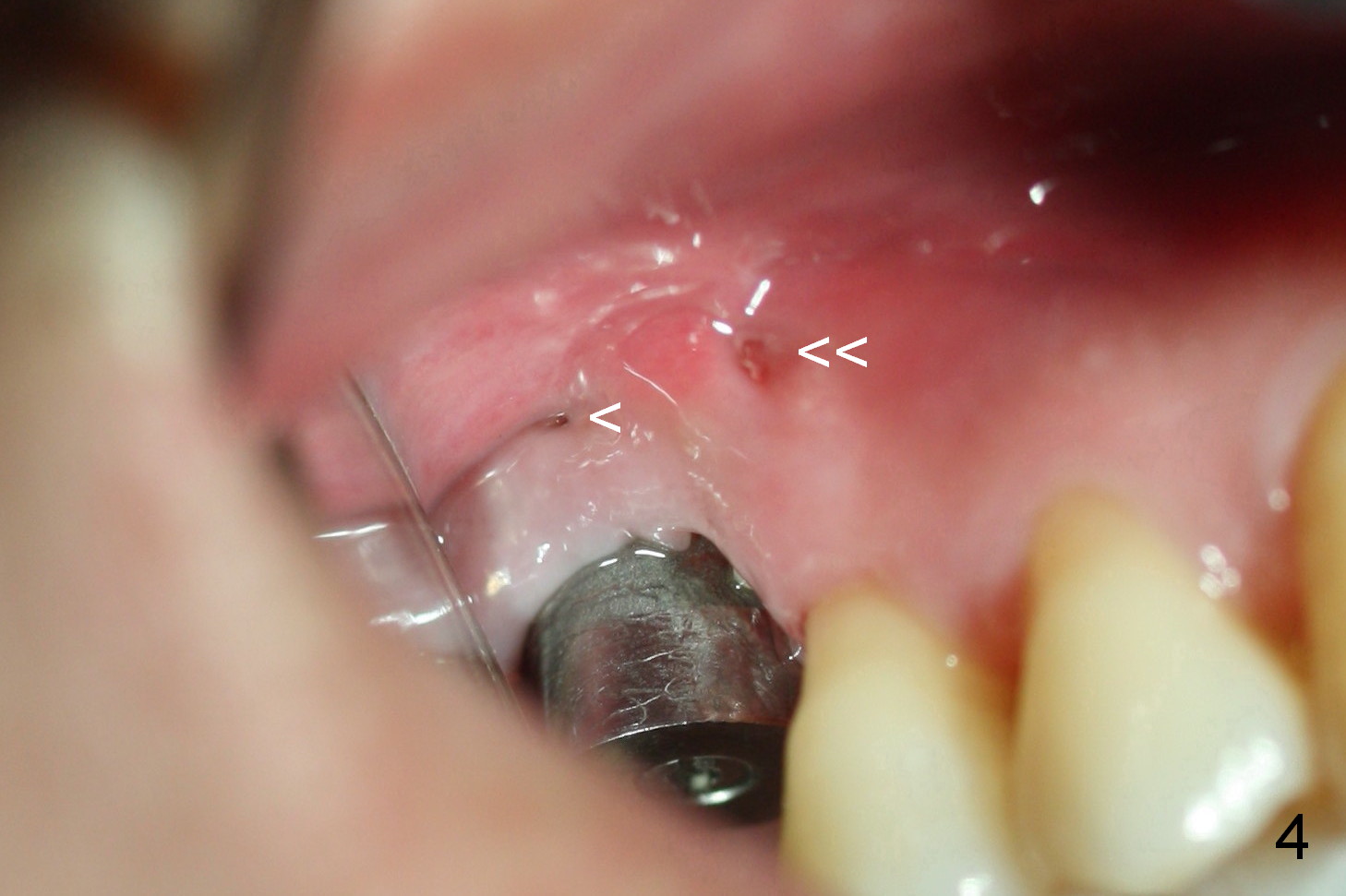 The patient returns for follow up 2 and 4 weeks postop. Two weeks postop, the fistula closes after removal of perio dressing. Mesial to the healing fistula is a small wound opening, from which bone graft granule are exposed. The Osteotape is partially exposed from the gingival margin. Four weeks postop, the osteotape is not visible from the recessed gingival margin (Fig.4). The fistula remains close (single arrowhead: <)), whereas the small wound opening mentioned above has closed (double arrowheads: <<). Gingival graft should have been done with GBR to decrease the chance of gingival recession. A second GBR appears necessary.