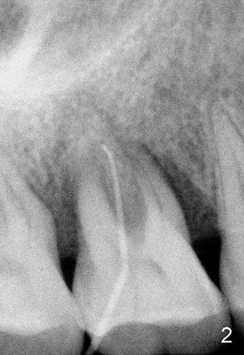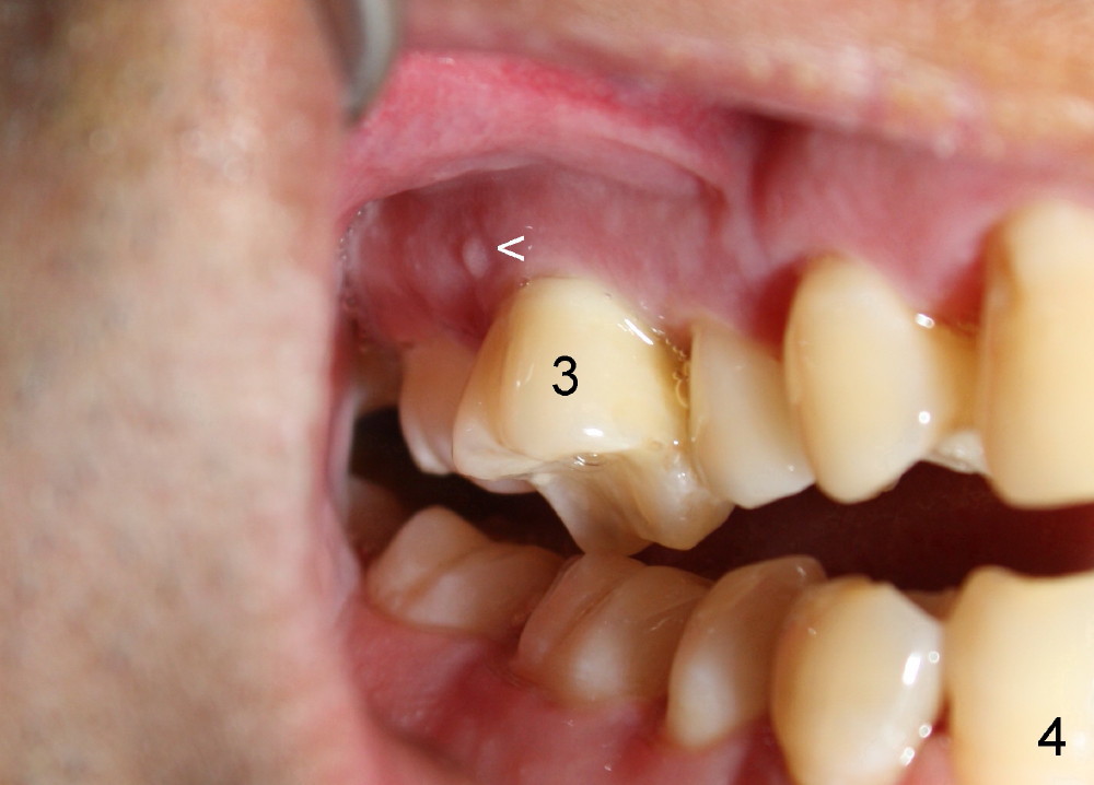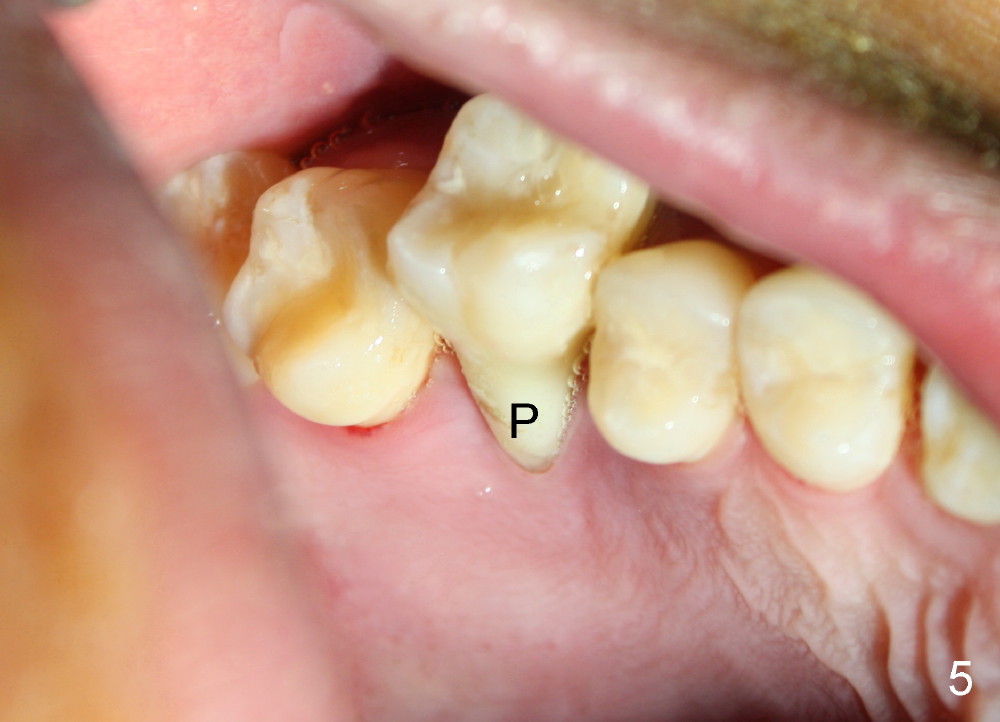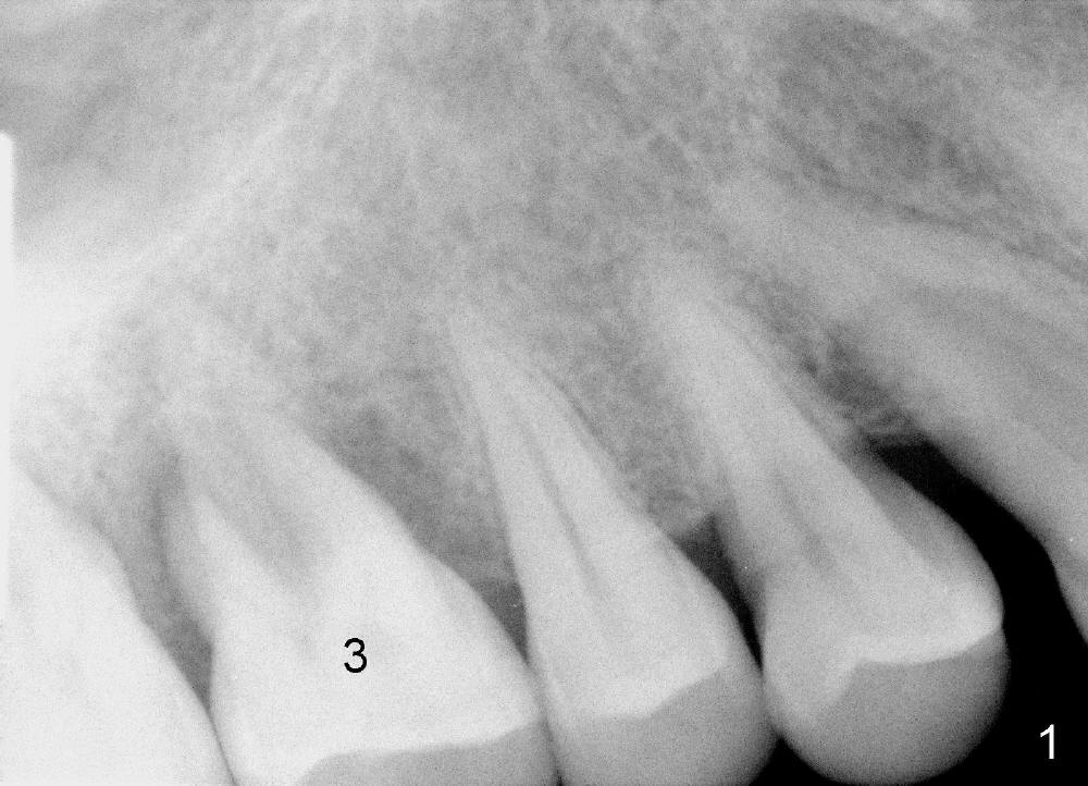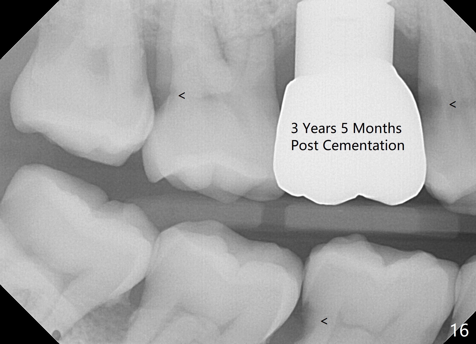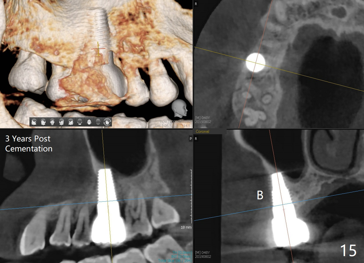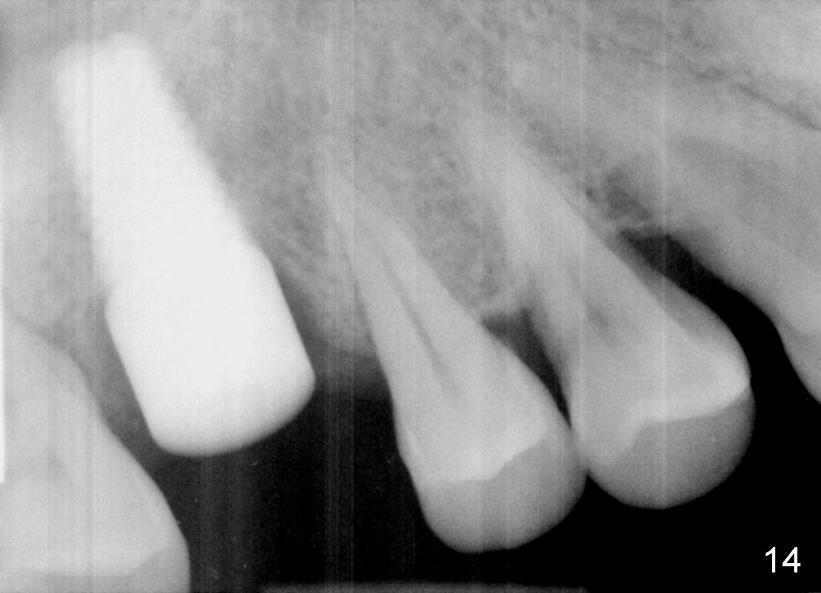 The patient returns for restoration 23 months postop; the implant appears to have been osteointegrated (Fig.14). There is no buccal or palatal gingival recession. The large implant appears to close the large defect readily and enhances bone/implant contact. The buccal plate seems to be thin 3 years post cementation, although there is no sign of periimplantitis (Fig.15). The mesial papilla is severely recessive with open contact 3 years 5 months post cementation. BW shows DO caries of the teeth #2, 4 and 30. The crown is removed for better oral hygiene by fabricating a provisional and conservative composite for #4. Water Pik is recommended.