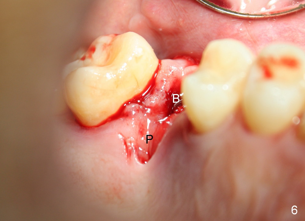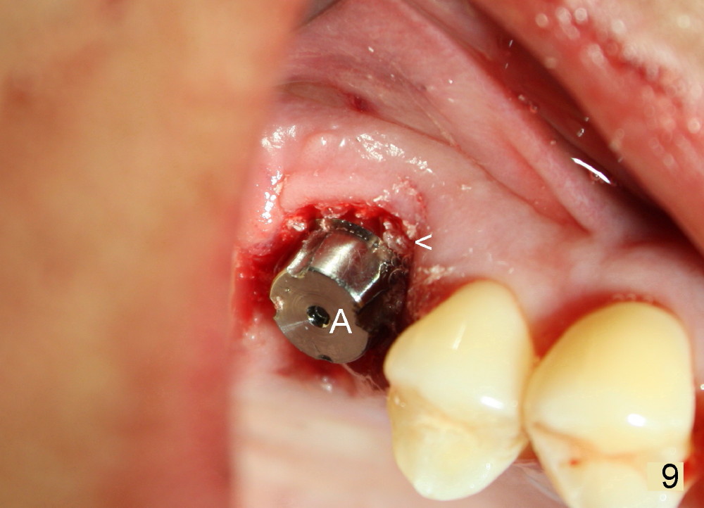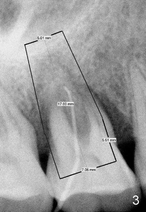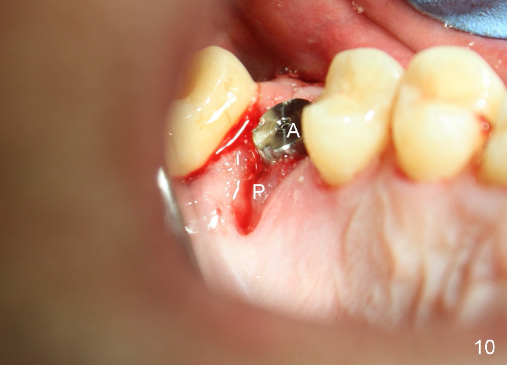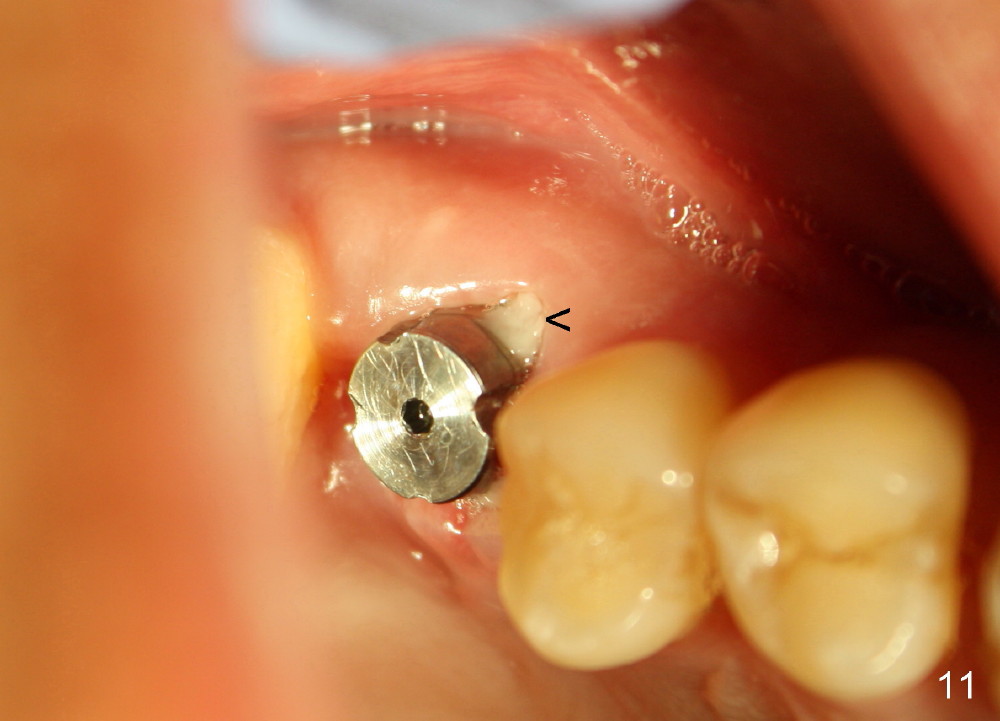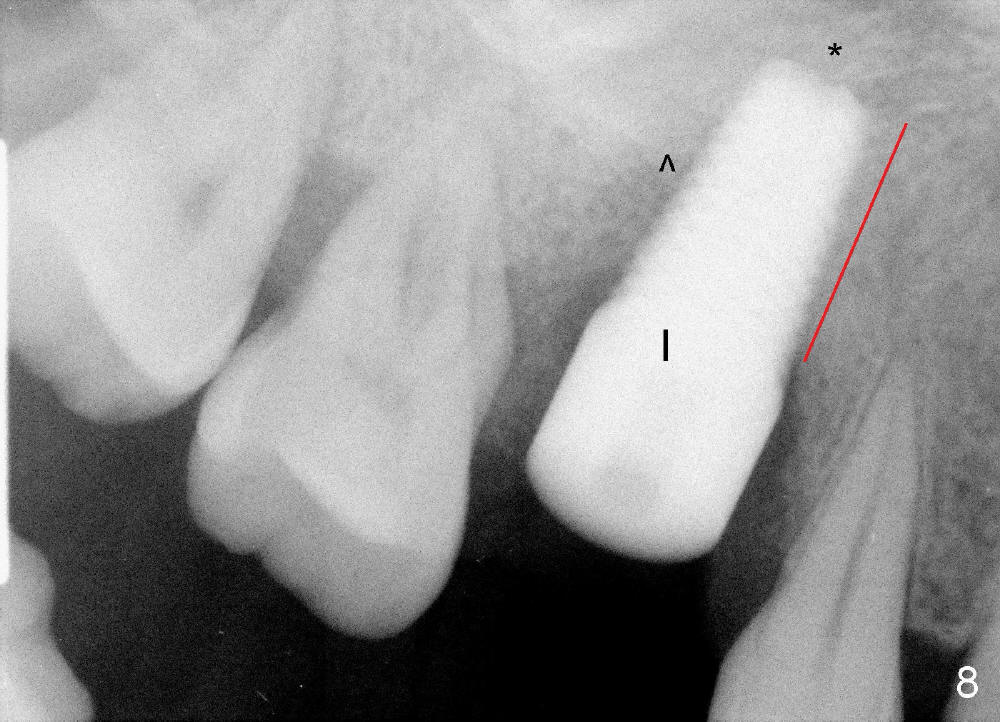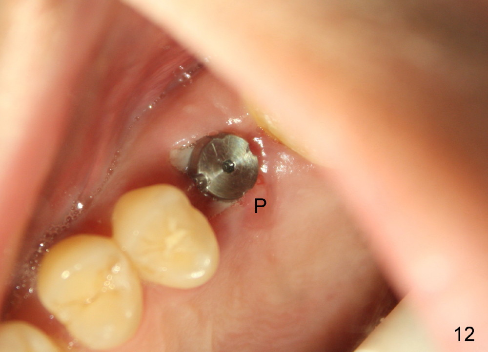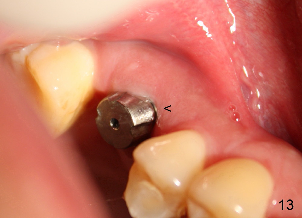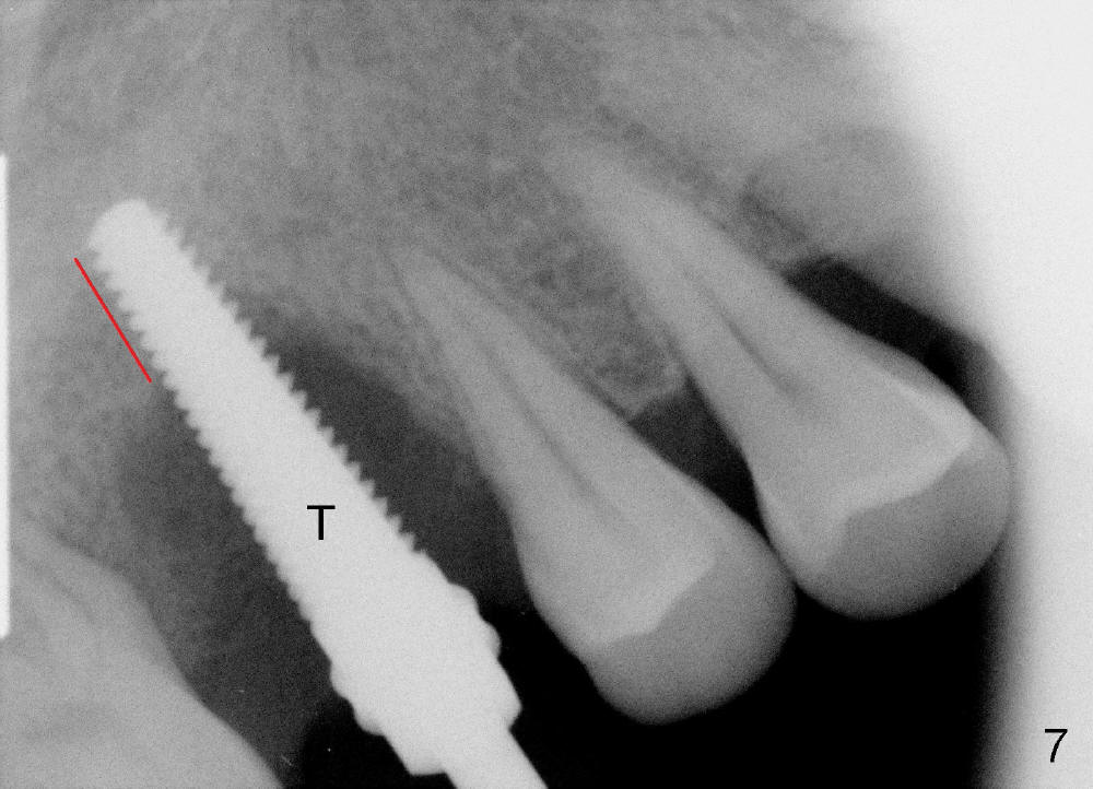 The tooth #3 has severe periodontitis with probably endodontic lesion (Fig.1,2). The patient is a 43-year-old man with apprehension of dentistry. An acute infection causes pain and tooth shift (Fig.4,5). A 7x17 mm immediate implant is planned (Fig.3). The palatal socket is shallow (Fig.6 P), corresponding to severe recessive palatal root (Fig.5 P). The osteotomy is created mainly in the buccal socket (Fig.6 B), exactly in the lingual slope of the septum. Initially osteotomes are used, followed by tap placement (Fig.7 T (4.5x20 mm at the depth of 17 mm). When the implant is placed as planned (Fig.8 I), there is more vertical contact (Fig.8 red line) than that associated with the tap (Fig.7 red line). The corresponding insertion torque is between 50 and 60 Ncm. There is only one small gap buccally, which is filled with bone graft (Fig.9 <). After the insertion of a short abutments with vertical slots (Fig.9,10 A), perio dressing is used to cover the wound. The palatal socket is expected to heal uneventfully (Fig.10 P). In fact, it does in 7 days (Fig.12 P); the bone graft in the mesiobuccal aspect is healing and stabilized (Fig.11 <). By two weeks postop, the mesiobuccal socket has healed (Fig.13 <). With removal of a diseased tooth, our body has amazing power to heal.