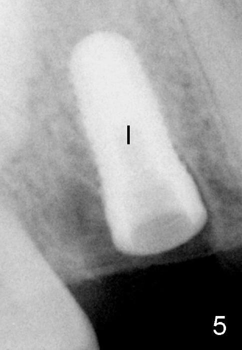 Fig.5: The mesial socket is almost obliterated when a 5.3x12 mm implant (I) is inserted.