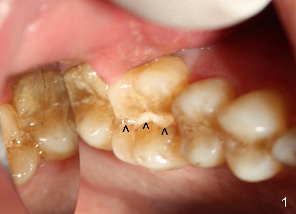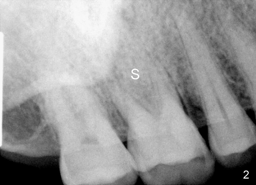 A 49-year-old man requests implant restoration of the upper 1st right molar with crack (Fig.1 ^). He loves to chew nuts. There is exosteotosis. In fact the upper left molar also has crown fracture. Bone density should be high. There is abundant bone all around. The limiting factor will be the mesiodistal width of the septum (Fig.2 S), which is 4.87 mm. Bone expansion may be required to place 5 mm implant. The coronal part of the proximal surfaces of the implant may be exposed. Surgical handpiece may be needed to flatten the pointed coronal part of the septum before a 1.5 mm pilot drill is used to initiate ostetomy. Bicon reamers are used to collect bone from the septum of #3. Or osteotomes may be used to expand the osteotomy before implant placement. Then place the autogenous bone with or without allograft back to the three remaining sockets and cover the thread exposed proximal surface. The opening of the sockets will be covered by a collagen membrane, which is fixed between the crest level implant (5.0 mmx14 mm) and healing abutment (8 or 9 mm in diameter). What happens in surgery?