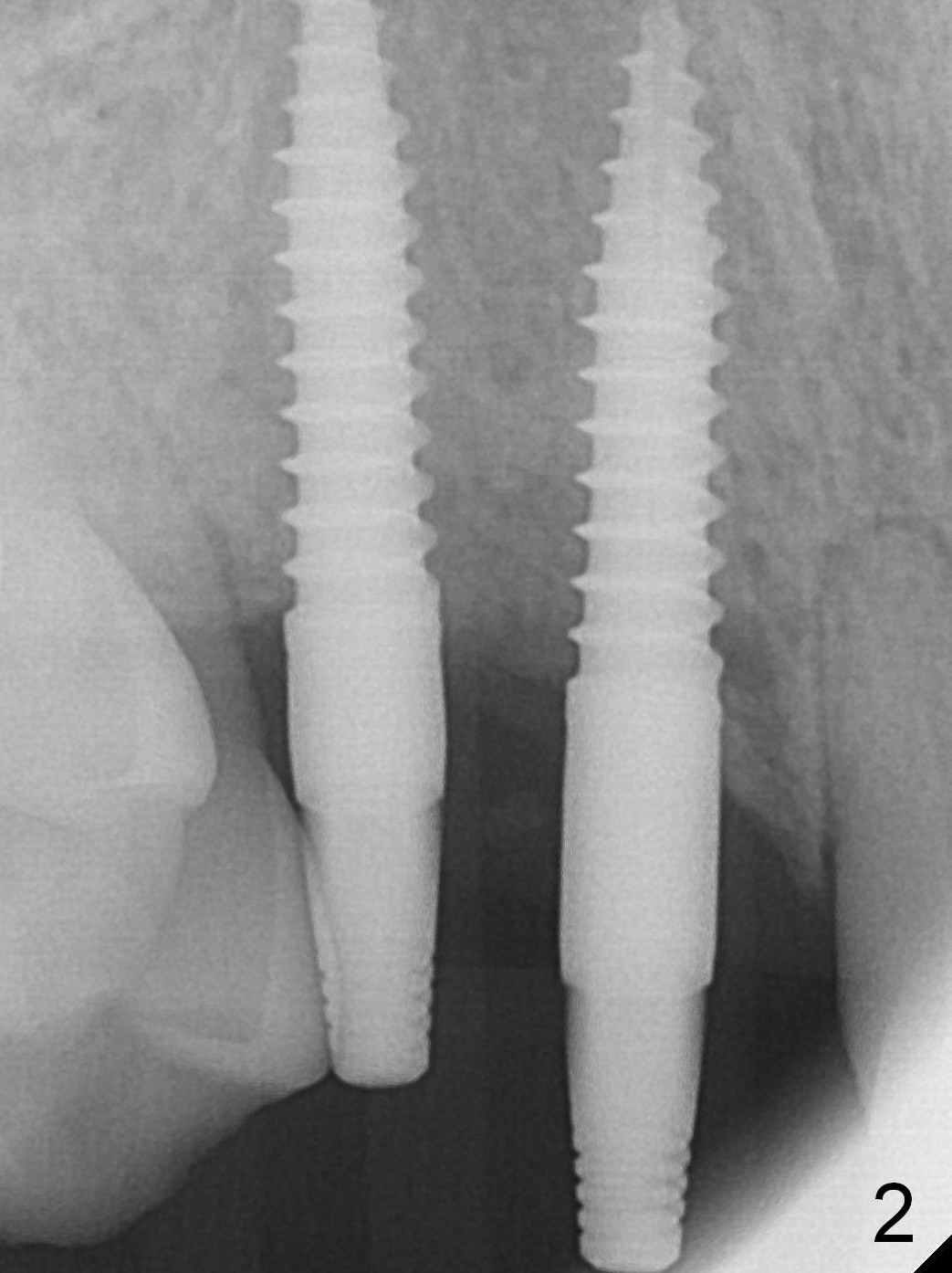 The ridge at the sites of #6 and 7 looks wide, but the bone is narrow (~ 4 mm) when the flaps are raised. Two of 3 mm 1-piece implants (3x16(2) and 3x14(4) mm) are placed (Fig.1,2). The other advantage of use of 1-piece implants is the narrow mesiodistal space. In fact the gingiva is wide and thick (4 mm). It is ideal to place implants with 4 mm cuff; unfortunately there is no 3x16(4) mm implant available at the site of #6. After adjustment of the abutment at #7, a splinted provisional is fabricated.