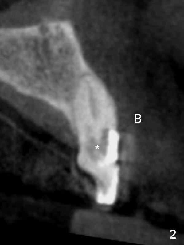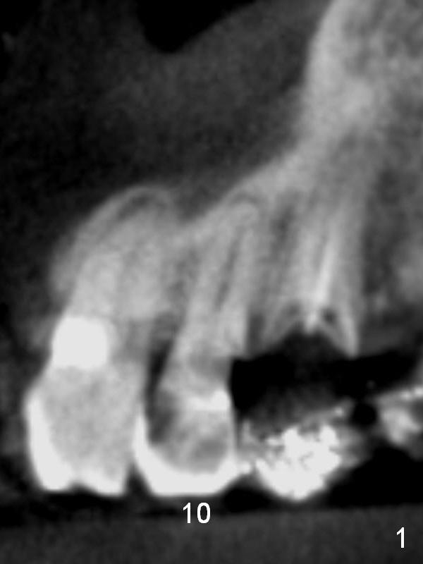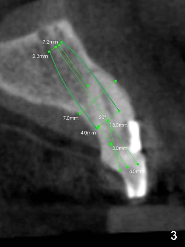 A 70-year-old man (CK) has history of several tooth fracture after RCT. When the tooth #10 develops pulpitis (Fig.1 CBCT sagittal section), he is reluctant to accept RCT. With several upper right and upper left implant placement, the affected tooth may not be so vulnerable to fracture. RCT will be tried first. If the caries proves to be too extensive (Fig.2 (coronal section) *), the tooth will be extracted with socket shield technique. Effort will be exerted for complete apex removal, followed by Metronidazole socket treatment. A 3.8x13 mm UF implant is placed; an angulated or gold coated abutment may be required (Fig.3). Bone density is 500-600 HU.