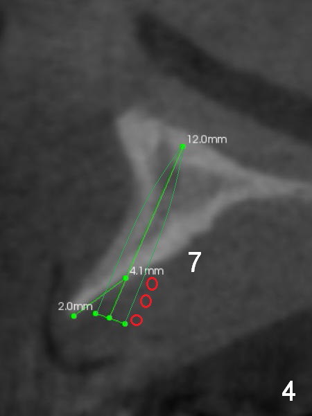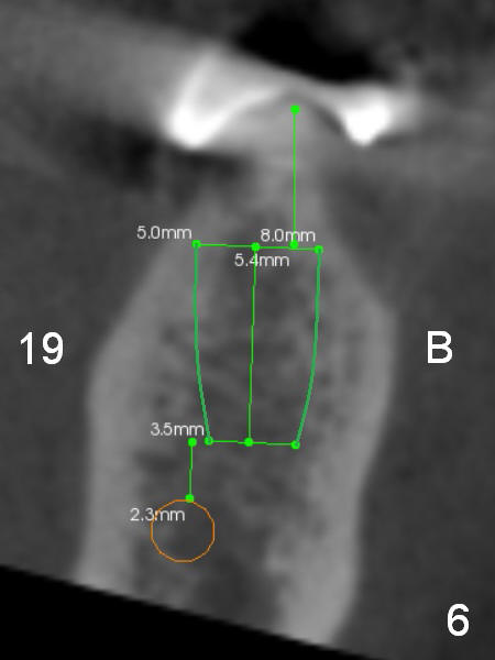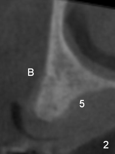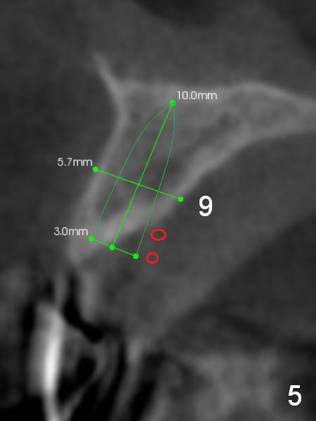 A 69-year-old man would consider implant option for his upper front teeth (Fig.1: #5-9) if there is no separate bone graft procedure. He does not want implants for his lower left molars (#18,19), since he has had a partial denture. In fact the bone at #5-9 is so thin that 2-3 mm 1-piece implants can be placed at #5,7 and 9 (Fig.2-5 (CT coronal sections (B: buccal)) for a 5-unit bridge (Fig.1). To support and increase the longevity of the latter, implants at #18,19 are mandatory (Fig.6,7).